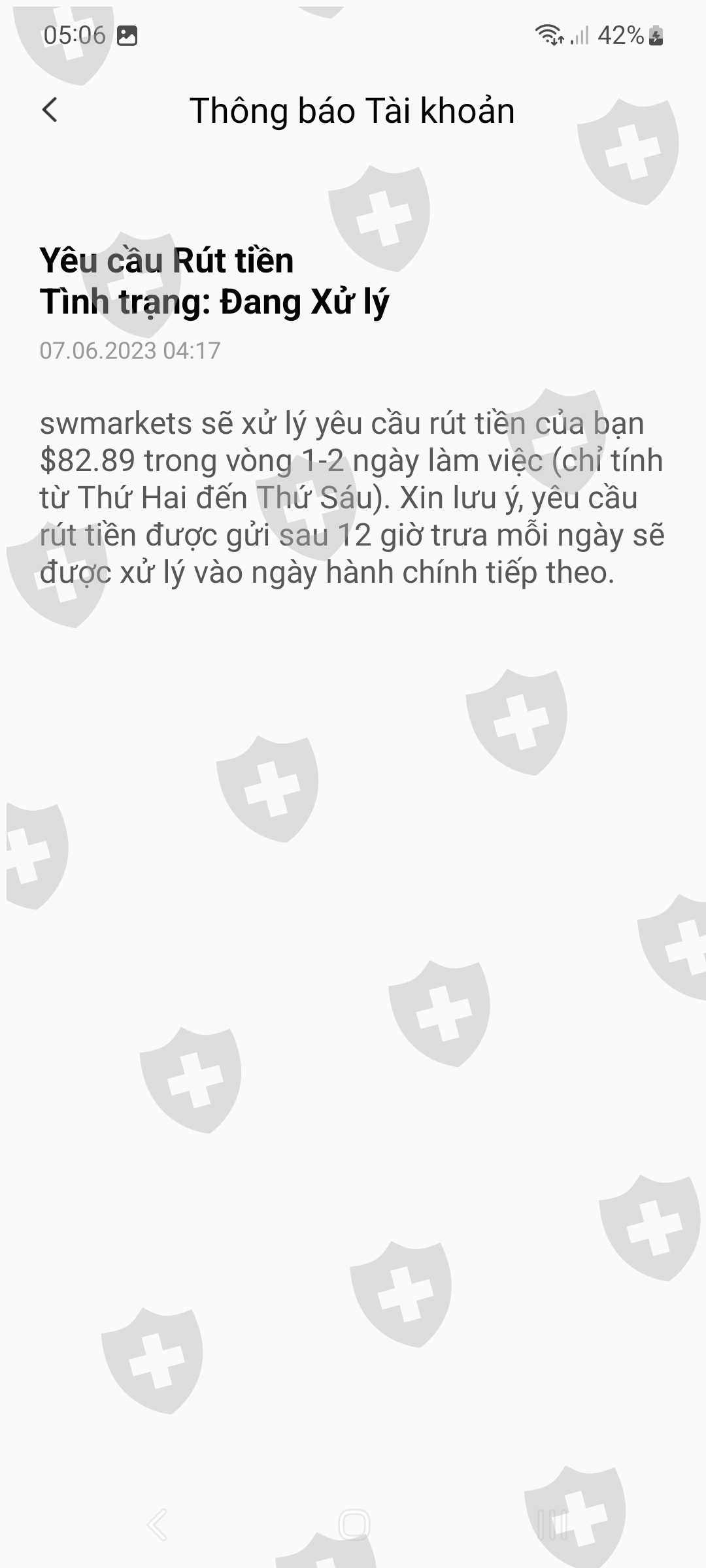 Tôi từng lập 1 tài khoản bên sàn SW markets và được tặng 30$ đô để giao dịch. Khi tôi dùng 30 đô đó giao dịch tới 4h sáng thì lãi được 52,89 đô.tổng cộng là 82,89 đô la. Khi đó cũng đến giờ sàn giao dịch đóng cửa.và tới 5h sáng khi sàn giao dịch trở lại tôi vào lại tài khoản của tôi thì thấy không còn tiền và bên hệ thống gửi tin nhắn cho tôi là yêu cầu rút tiền thành công. Trong khi tôi không hề rút tiền và thậm trí còn chưa liên kết với tài khoản ngân hàng của tôi. Lúc đó tôi tưởng là có sự nhầm lẫn tìm hỗ trợ bên sàn nhưng ở đó chỉ có hỗ trợ trực tuyến và báo là hệ thống hỗ trợ trực tuyến không khả dụng , ngoài ra không còn cách hỗ trợ nào khác để tôi liên lạc và khiếu nại.lúc đó tôi mới biết đây là sàn lừa đảo. Tôi vào chplay xem ứng dụng của họ thì thấy toàn bình luận giả chứ không phải người thật, có duy nhất 1 bình luận là người thật thì cũng kêu mất 100$ như tôi. Nên tôi viết bài này lên mong mọi người cảnh tỉnh và tránh sa sàn này không nên tải và nạp tiền vào tránh tiền mất tật mang
