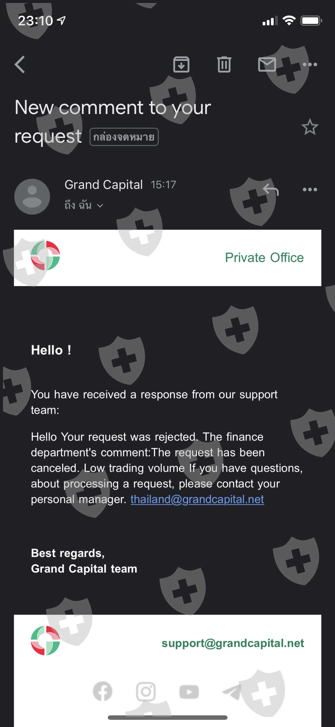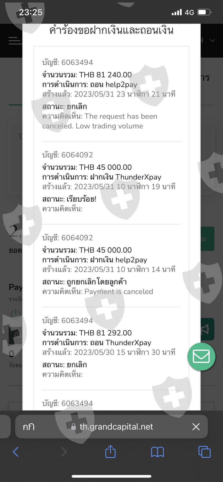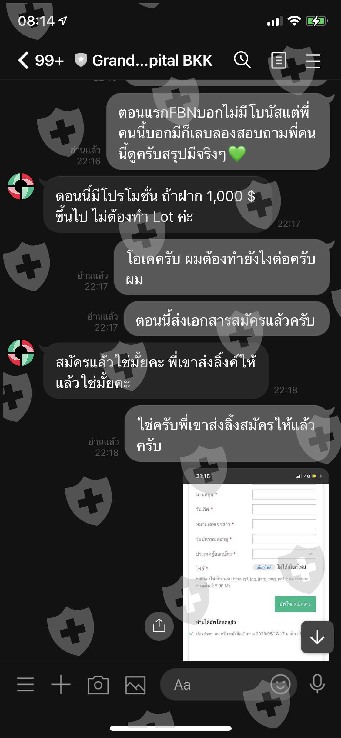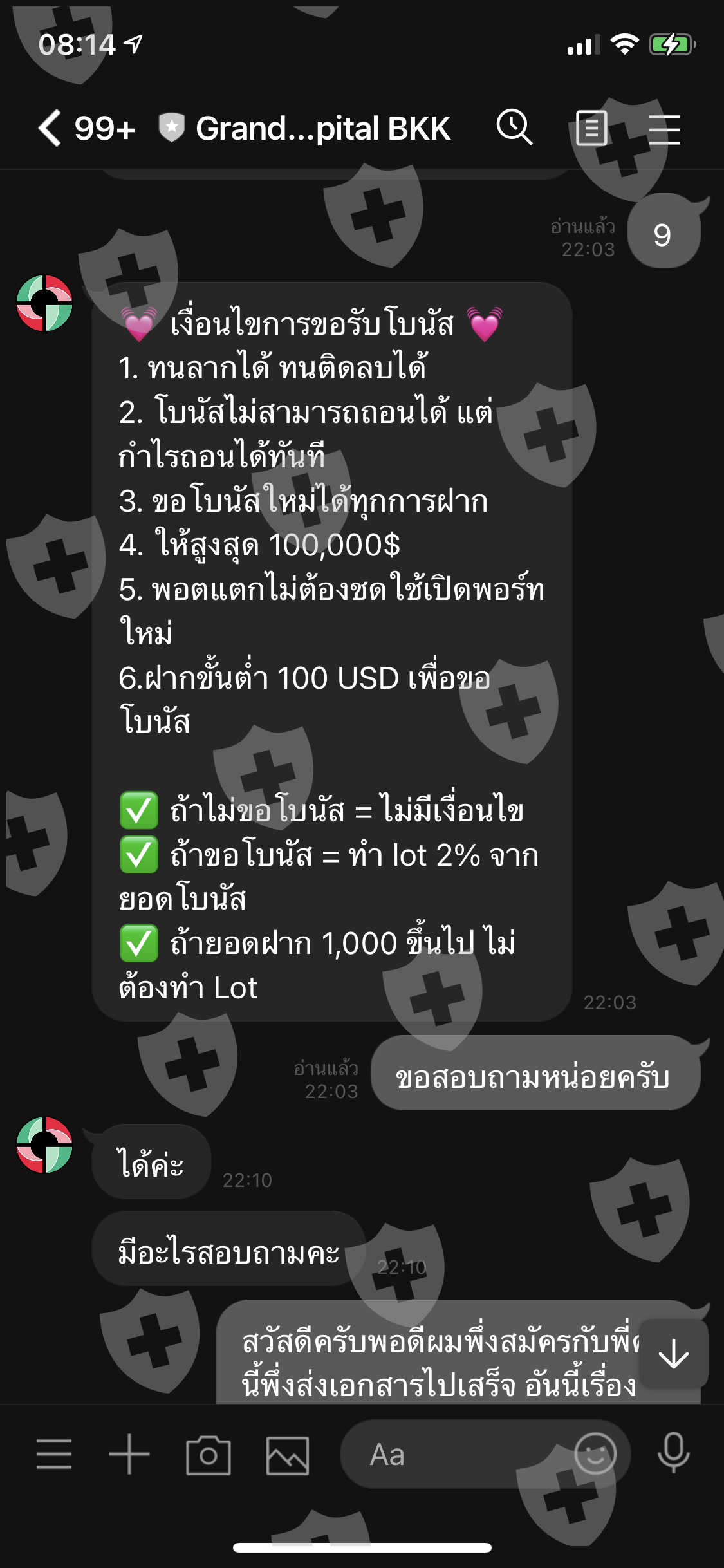 ฉันได้ทำการถอนเงินจากนั้นทางโบรคติดต่อฉันมาว่าฉันทำผิดกฎซึ่งคนที่นำโปรโมชั่นมาเสนอแก้ฉันคือIBและแอดมินGrandcapitalBKKและบอกเงื่อนไขฉันมาเพียงแค่6ข้อพร้อมกับข้อความว่าถ้าฝาก1000$ขึ้นไปไม่ต้องทำLotและไม่ได้บอกกฏอะไรฉันนอกเหนือไปมากกว่านี้เลย ซึ่งฉันก็ทำตามทุกอย่างแต่พอมาวันนี้ได้ทำการถอนเงินแต่ถูกทางโบรคปฏิเสธ