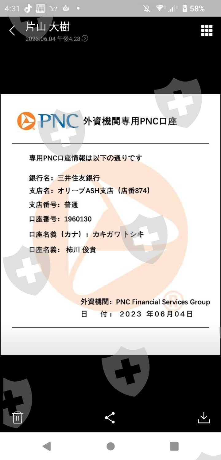 在投资集团中有一个名叫早川雅博的老师,他会传来交易指示。支持由片山大树担任。提出出金请求,提供了汇款账户之后,便失去联系了。