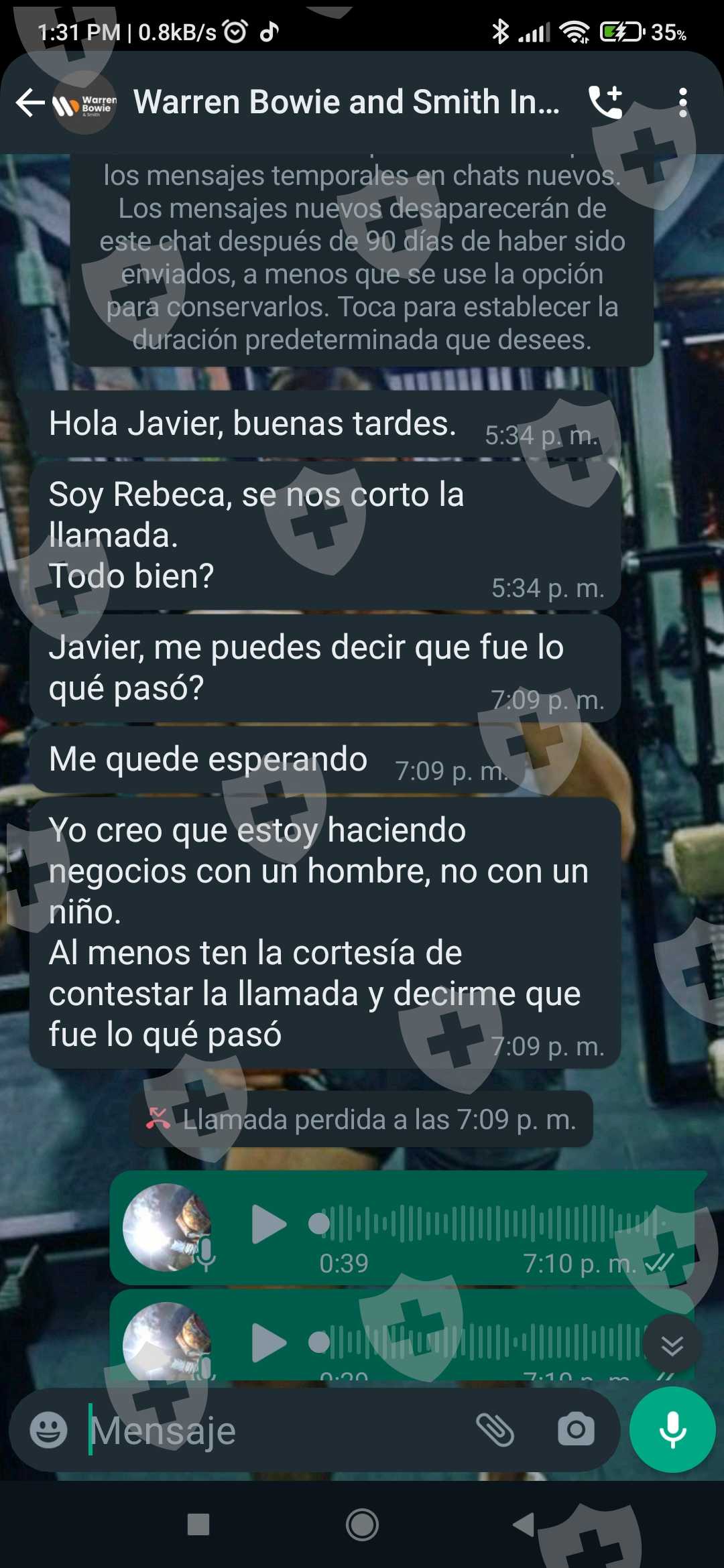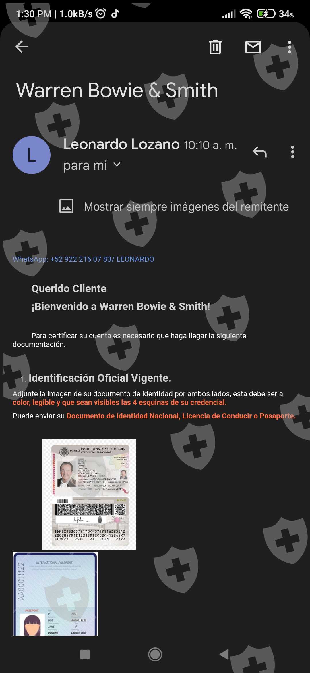 me llamaron en el día de ayer para invertir una señorita llamada Rebeca y un señor llamado Leonardo Lozano de warren bowie y Smith pidiéndome 200 dólares dónde yo lo transferí para trabajar con ello bueno primero me mostraron la plataforma todo bonito bien diseñado pero nada salió como tiene q ser. lo peor le piden foto de la tarjeta de crédito alguien me podría ayudar. con esta personas que solo asen daños no saben las necesidades q pasamos