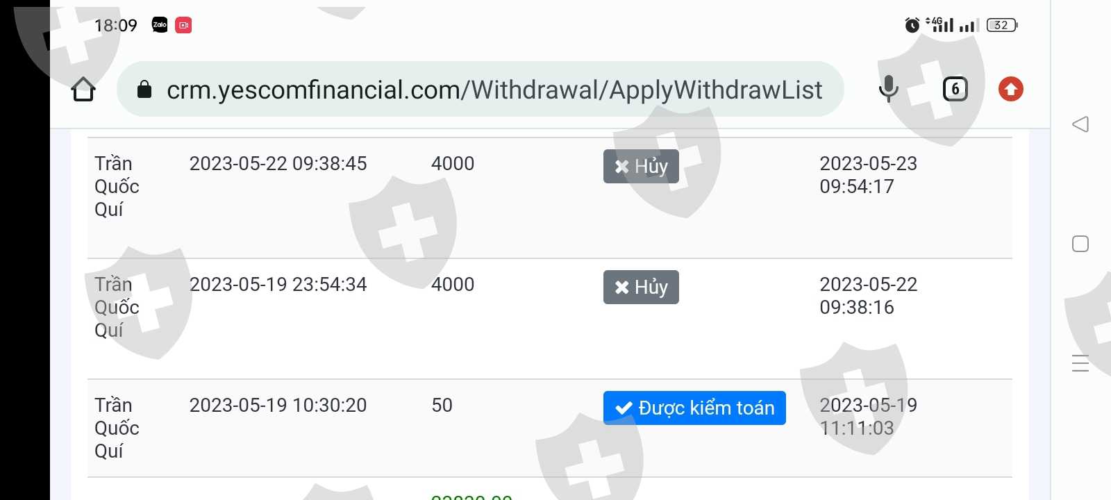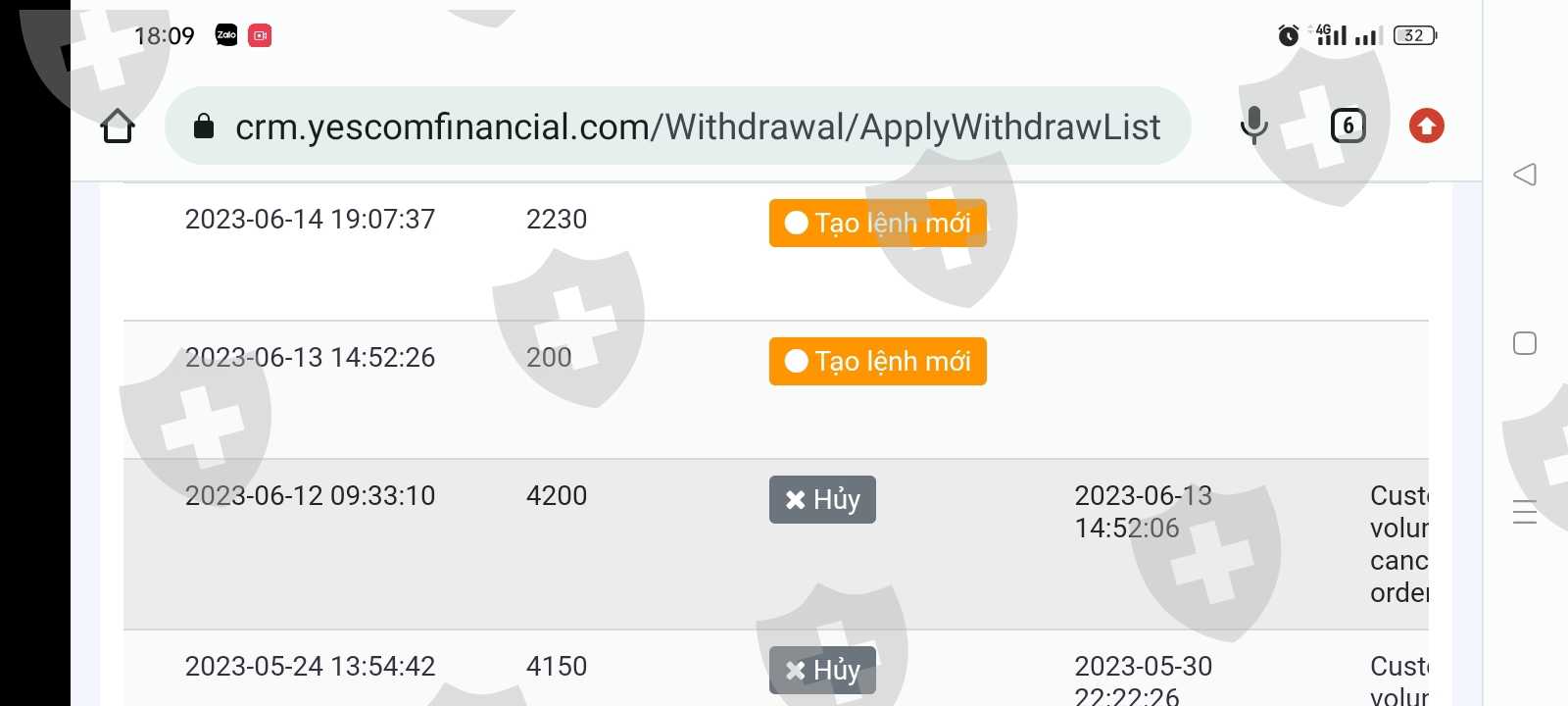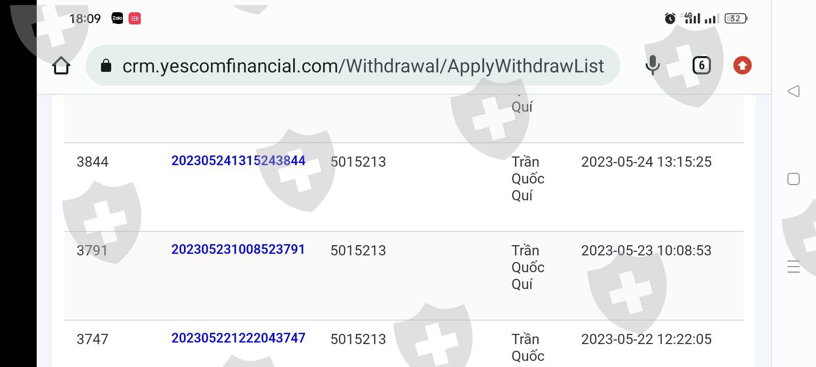 Tôi có mở Tk mt5 số 5015213 trên sàn yescom financial limited. Hiện tại số dư trên tài khoản là 4231.88$ tôi đặt lệnh rút tiền mà sàn chưa duyệt. Tôi đặt lệnh rút 4000$ từ ngày 19/05/2023 đến ngày 22/05/2023 tôi hủy lệnh này. Ngày 22/05/2023 tôi tạo lệnh rút 4000$ và 200$ đến ngày 23/05/2023 vẫn chưa được duyệt, lúc đó tôi liên hệ ib hỗ trợ, sau đó lệnh không được duyệt mà là bị hủy mà tôi không hủy 2 lệnh rút này. Tôi đổi mật khẩu tài khoản, có người xưng là bên bộ phận quản lý tài khoản nói tạm khoá tài khoản 15 ngày do tôi lộ mật khẩu hoặc đăng nhập vào bằng thiết bị khác. Tôi khẳng định là không tiết lộ mật khẩu cho bất kỳ ai và cũng không đăng nhập bằng thiết bị khác. Sau nhiều lần tạo lệnh rút tiền vẫn không được sàn duyệt. Mong sàn hỗ trợ duyệt lệnh rút tiền của tôi.