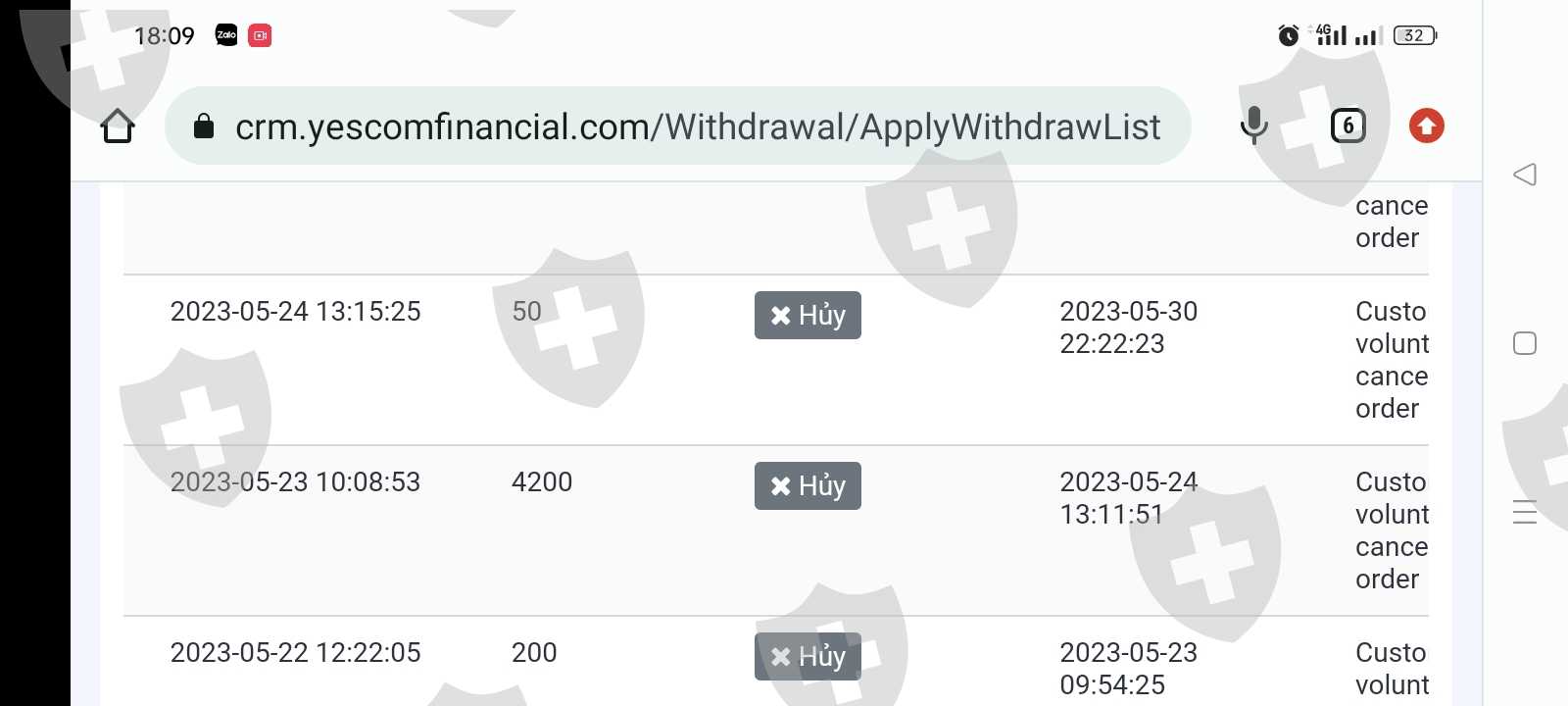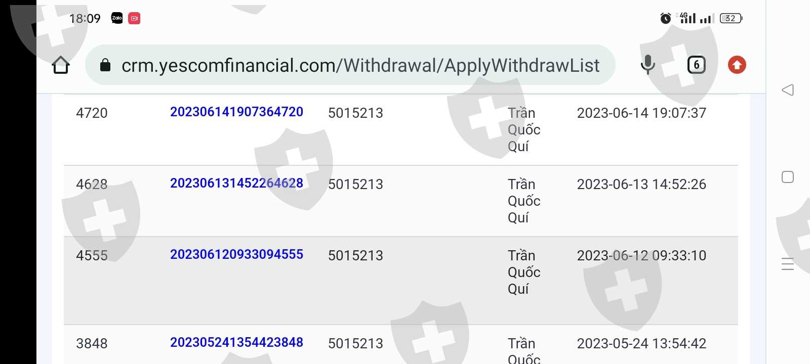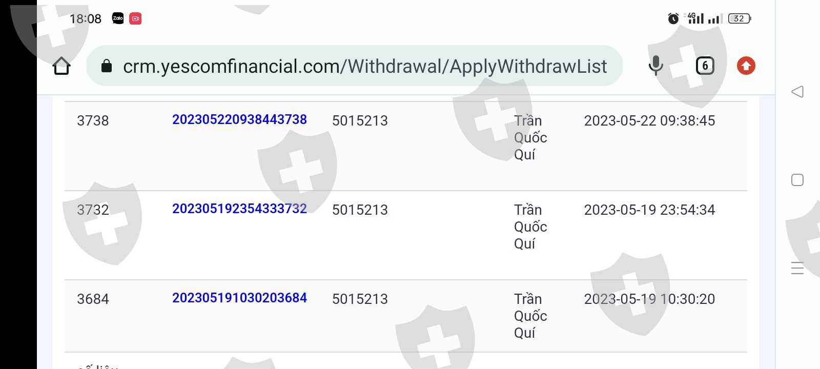 Tôi có mở Tk mt5 số 5015213 trên sàn yescom financial limited. Hiện tại số dư trên tài khoản là 4231.88$ tôi đặt lệnh rút tiền mà sàn chưa duyệt. Tôi đặt lệnh rút 4000$ từ ngày 19/05/2023 đến ngày 22/05/2023 tôi hủy lệnh này. Ngày 22/05/2023 tôi tạo lệnh rút 4000$ và 200$ đến ngày 23/05/2023 vẫn chưa được duyệt, lúc đó tôi liên hệ ib hỗ trợ, sau đó lệnh không được duyệt mà là bị hủy mà tôi không hủy 2 lệnh rút này. Tôi đổi mật khẩu tài khoản, có người xưng là bên bộ phận quản lý tài khoản nói tạm khoá tài khoản 15 ngày do tôi lộ mật khẩu hoặc đăng nhập vào bằng thiết bị khác. Tôi khẳng định là không tiết lộ mật khẩu cho bất kỳ ai và cũng không đăng nhập bằng thiết bị khác. Sau nhiều lần tạo lệnh rút tiền vẫn không được sàn duyệt. Mong sàn hỗ trợ duyệt lệnh rút tiền của tôi.