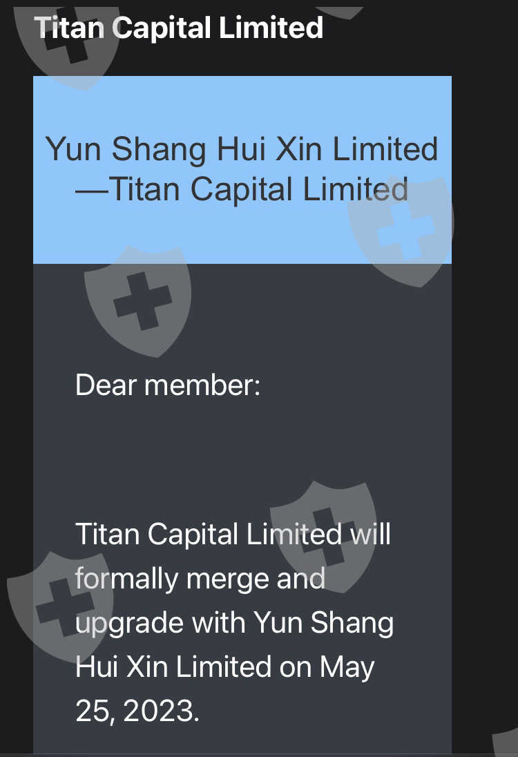Titan capital limited. now merged in Yun Shang hui xin limited. 730007 is my id. (yun shang hui Xin Limited)before it was 308134(Titan capital limited)I invest money in trading because of profit. but not withdrawing my money. 2800 $