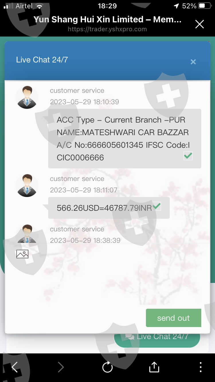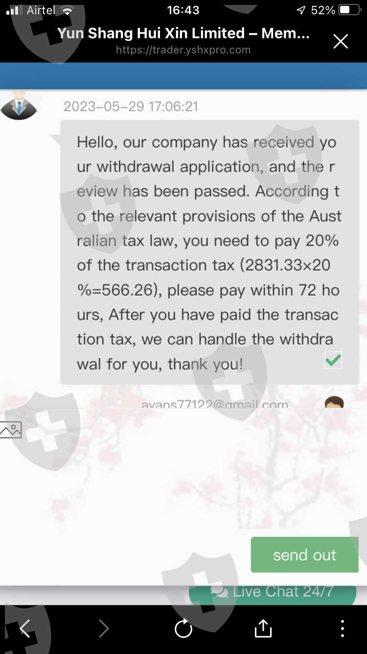 我的账户是 730007。旧账户是Titan markets limited的308134。这家公司和Yun Shang Hiu Xin limited合并了。我在mt5进行交易,一共投了1408 美元,税是566 美元。盈利后账户内有2831美元。在我填取款表格时,客户要求我存入 566美元的税款。存完税后客服说我一天内用非法软件交易多次盈利。他们一定有我所有的交易数据。现在客服要求我再存500 美元,说公司会审核我的交易和数据。他们显然是不想让我出金在骗我。现在他们往我账户里打了100美元作为补偿。现在账户里有2931美元,但是我的资产是2831美元。不让我出金,也不回消息。Link也不联系不上。