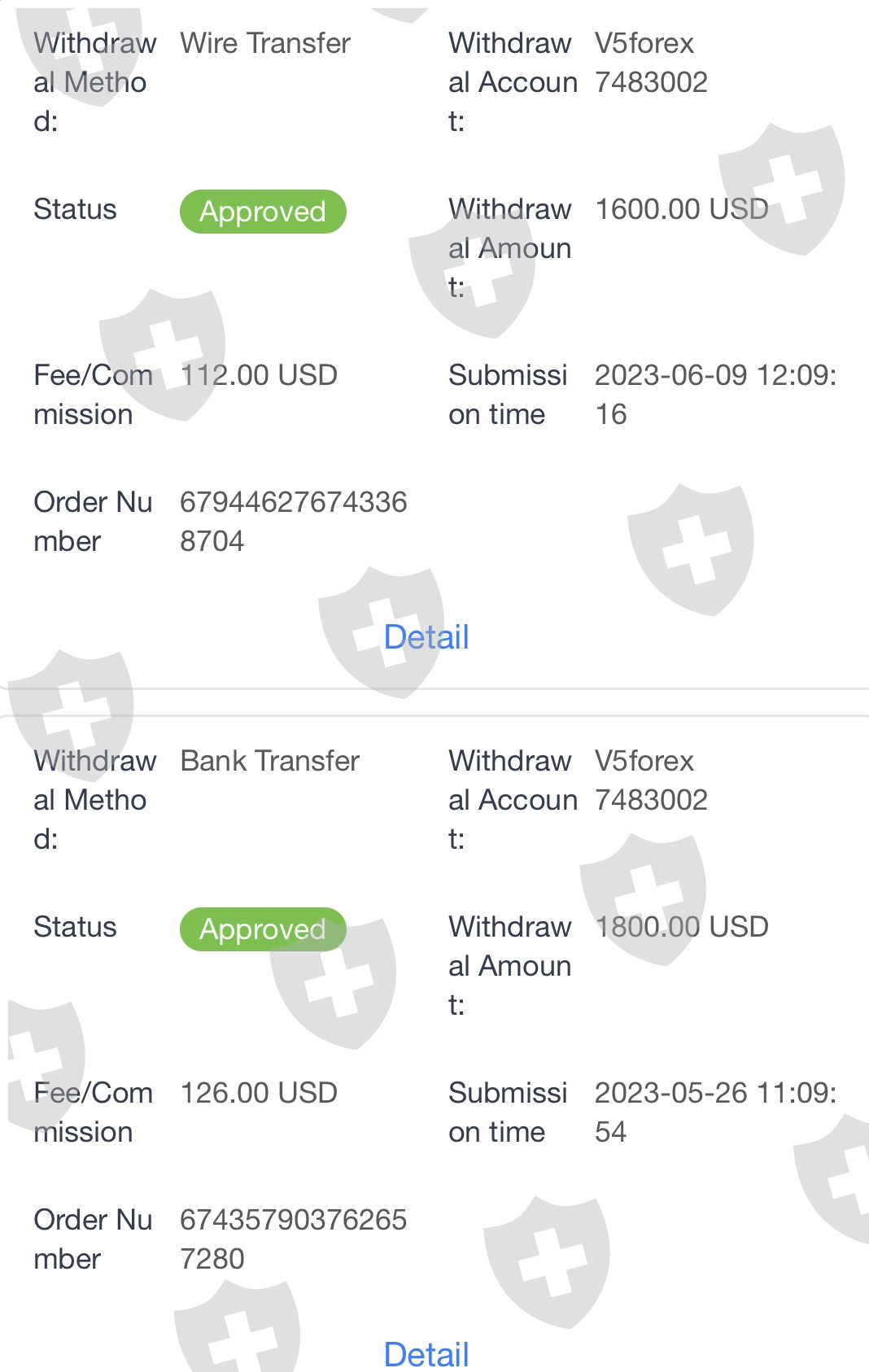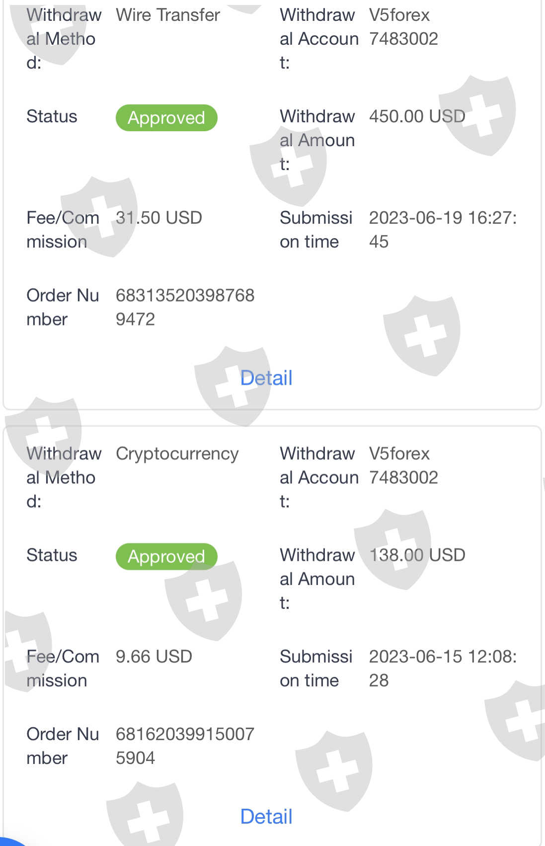 我已经使用 V5 交易了几个月。从上个月开始,我的出金一直没有到账,因为 V5 告诉我,他们怀疑我们是诽谤他们交易商中的一部分人,而我是无辜的。 账户每天都被禁用,然后我尝试在 2023 年 5 月 26 日申请出金 1800 美元,然后第二天我的账户就被禁用了; 到 了2023年 6 月 9 日,我在拿回帐户后再次尝试出金1600 美元,然后我被告知我的出金没有成功,将被退回(直到现在才发生),然后在2023 年 6 月 15 日,我再次尝试使用价值138 美元的加密货币来出金,然后也是没有到账。我最近一次出金是在 23 年 6 月 19 日进行的,价值 450 美元。 客服告诉我说,让我耐心等待,但一直都没有什么好消息。