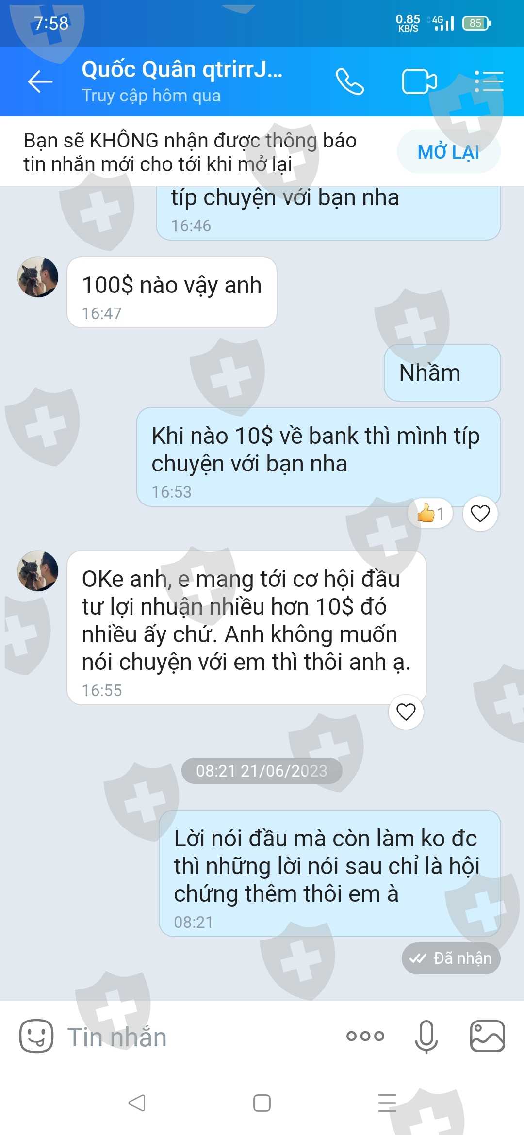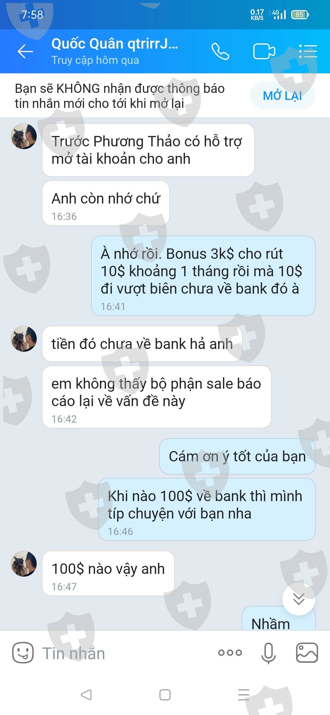Lừa đảo có tổ chức luôn ghê thật. Hứa hẹn cho rút tiền mà hơn 1 tháng 10$ ko về bank. Đã vậy còn nhờ người khác trong tổ chức alo, nt lừa đảo típ nữa chứ.