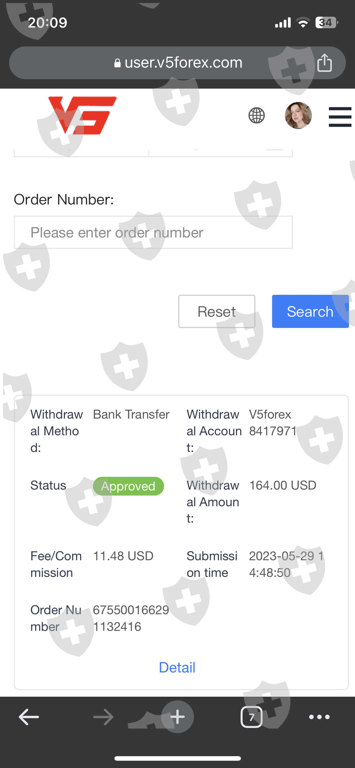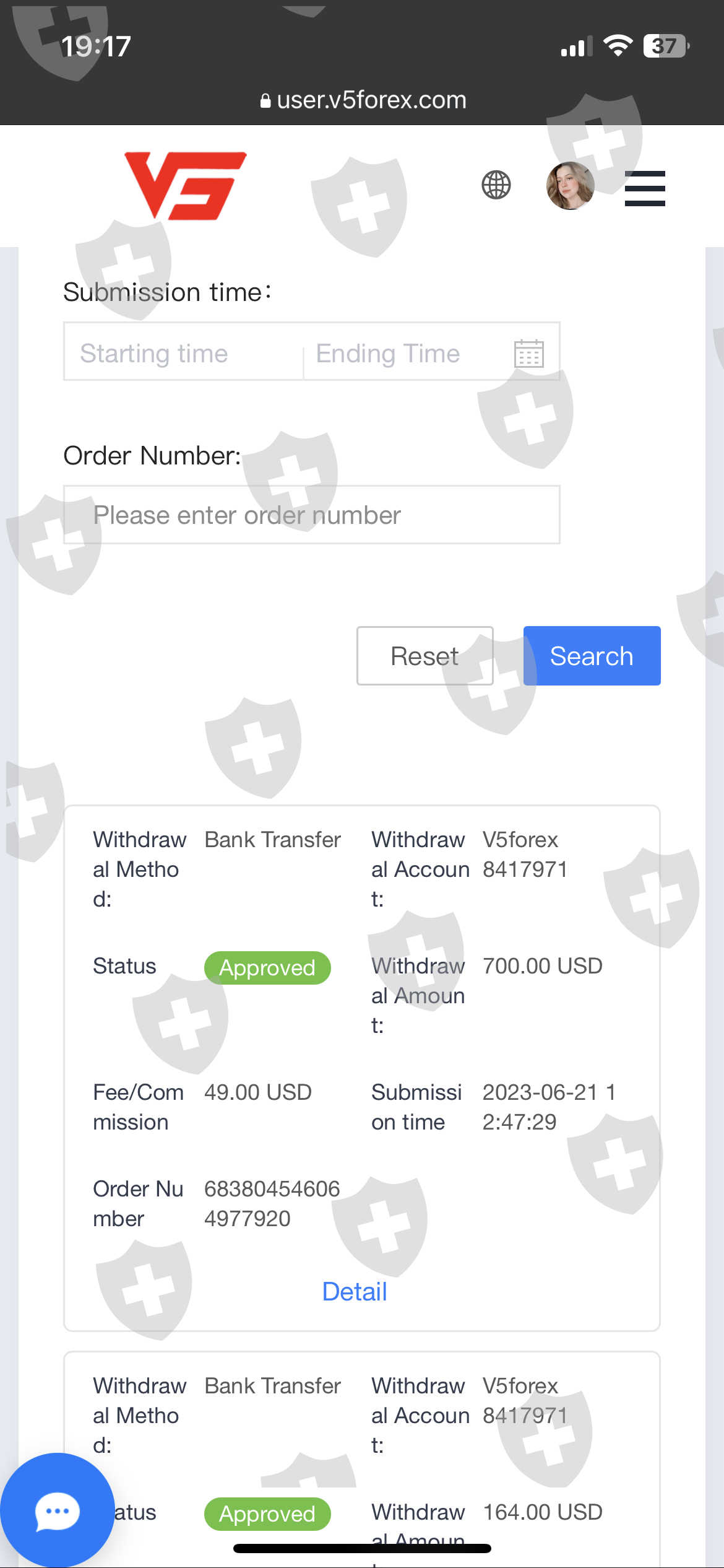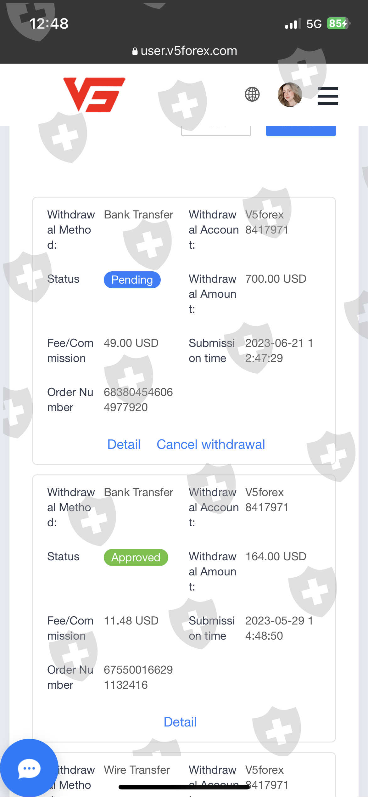 我在 V5 Forex Global 交易,账号是 #8417971,我于 2023 年 5 月 29 日出金 164 美元,6 月 21 日又出金 700 美元,到现在都没有收到,希望 V5 会对此采取行动。