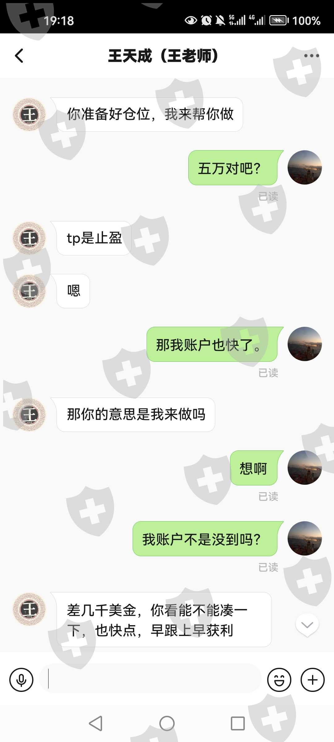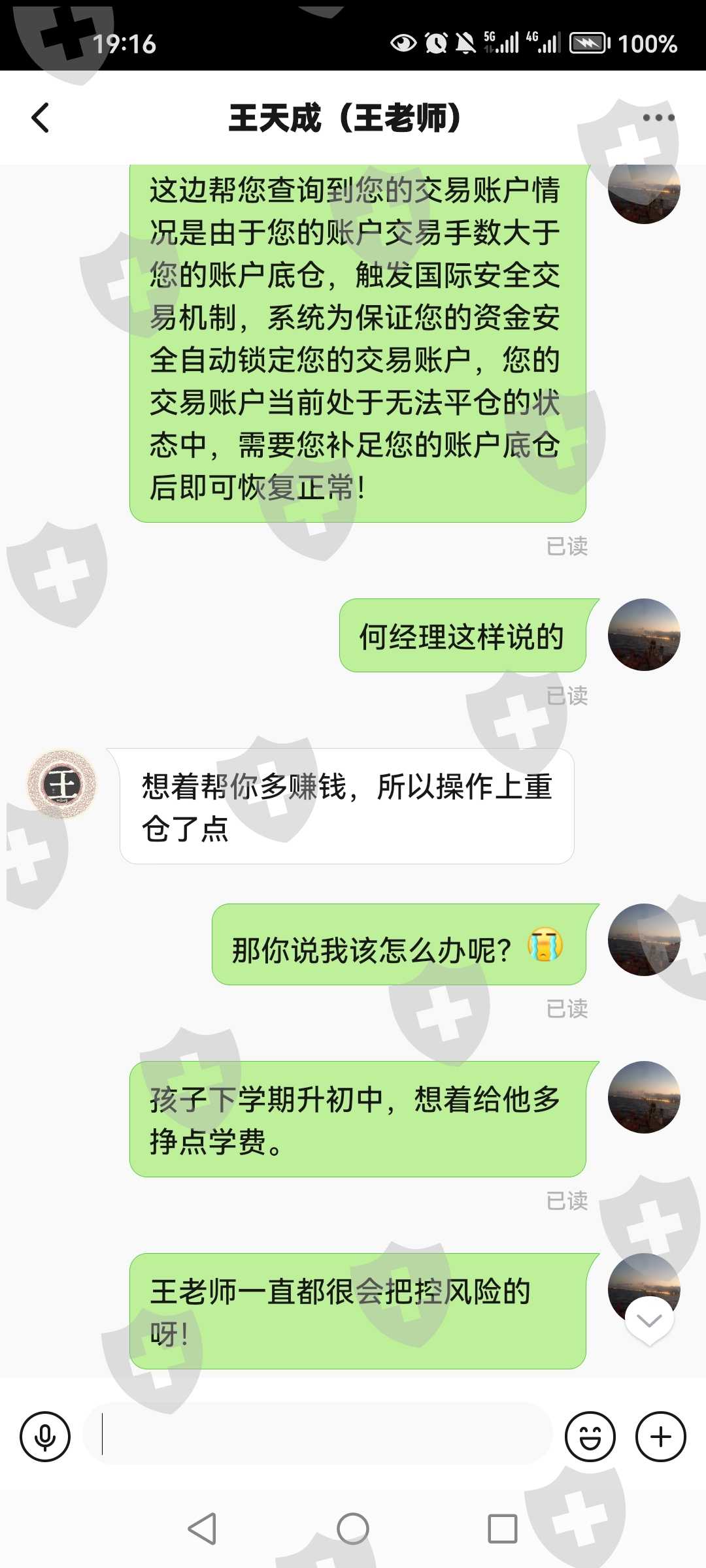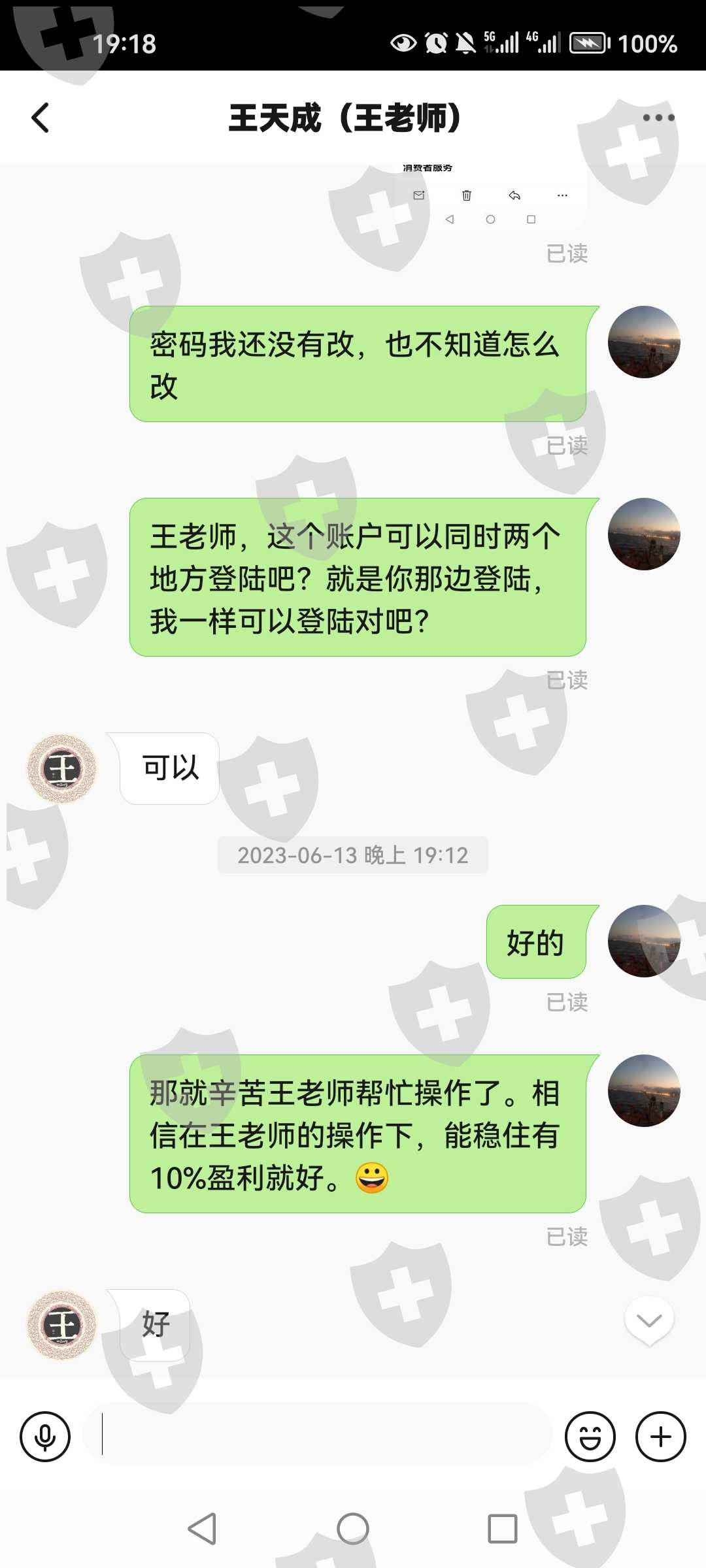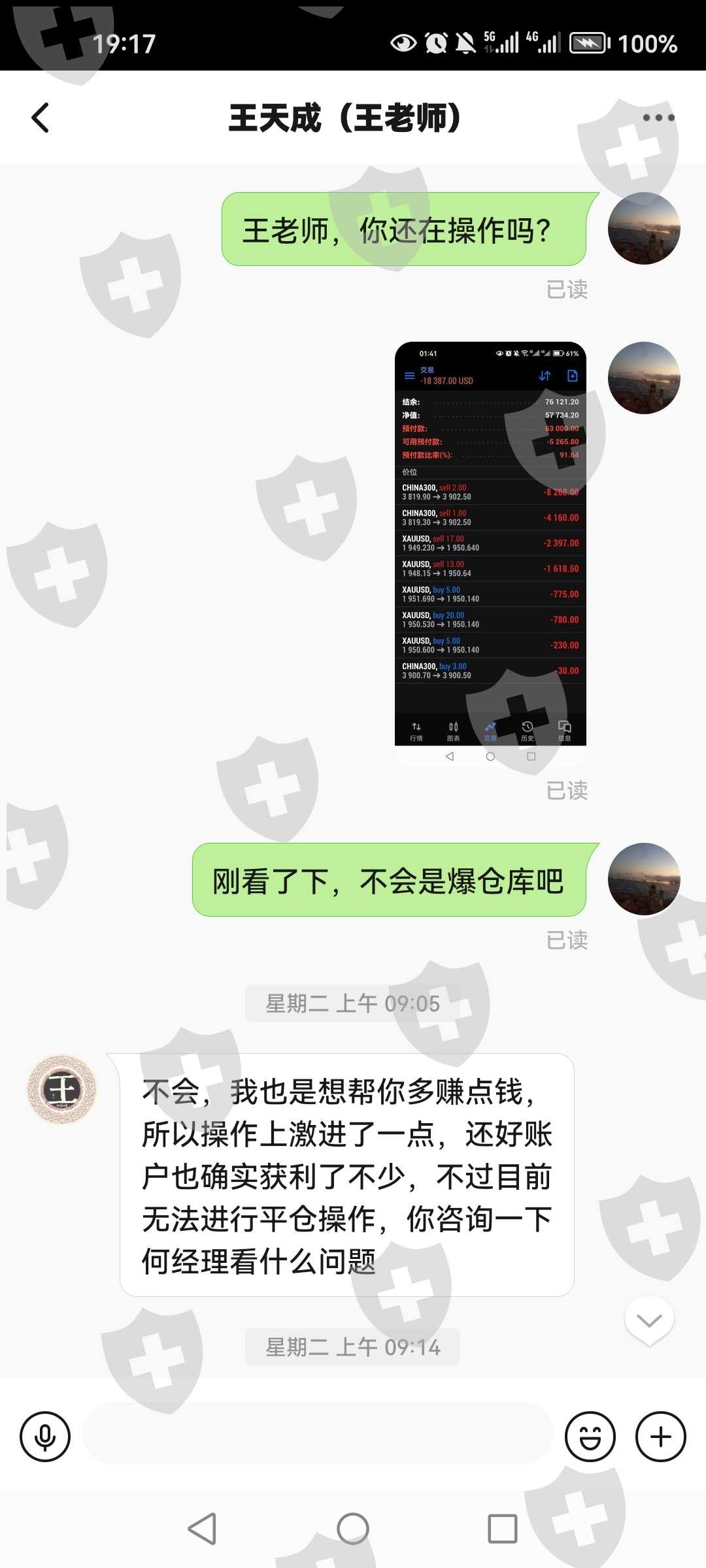 王老师诱导带单给账户密码操作,说6月有翻倍盈利,结果不顾仓位多大,重仓操作导致账号被强行封号。