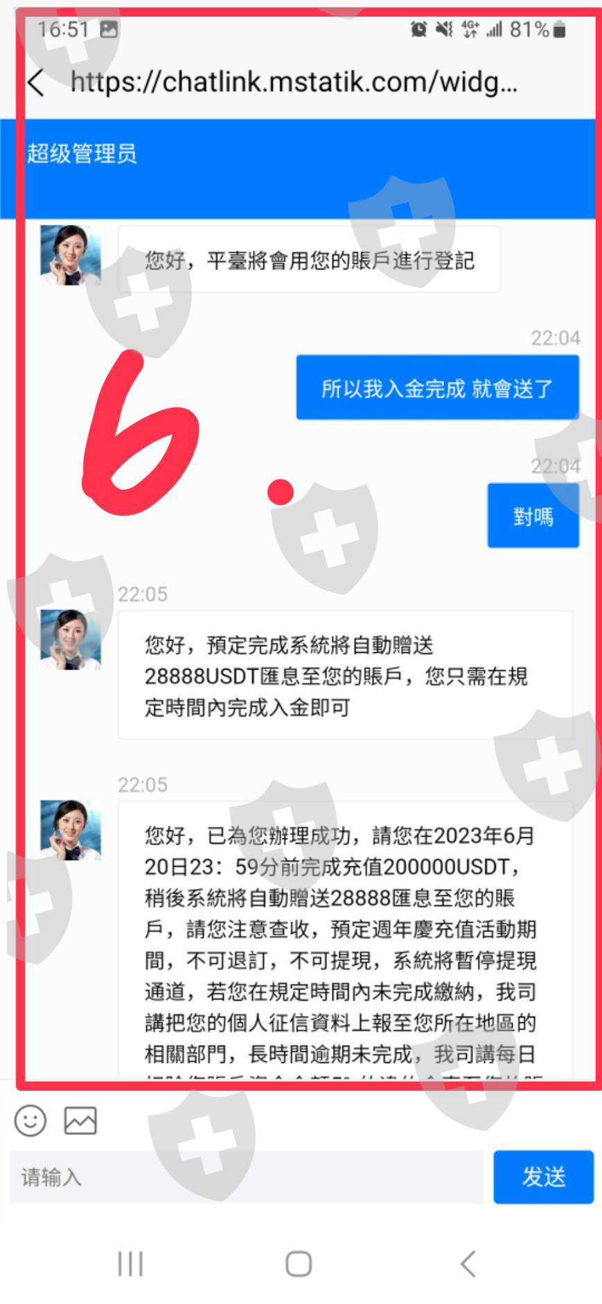 我投的很少,兩次都是1000美元。方法:用台幣通過Binance Exchange向商家購買虛擬貨幣,然後從Binance USDT轉出到fx6平台。之後盈利很穩定,但他也用甜言蜜語迷惑我,我也虧了很多錢進去。直到最近(原約定進場2個月左右),他說客服給他發消息:入金20萬USDT,可以贈送28888匯款利息。他說他參加了,他希望我也參加,一起賺錢。