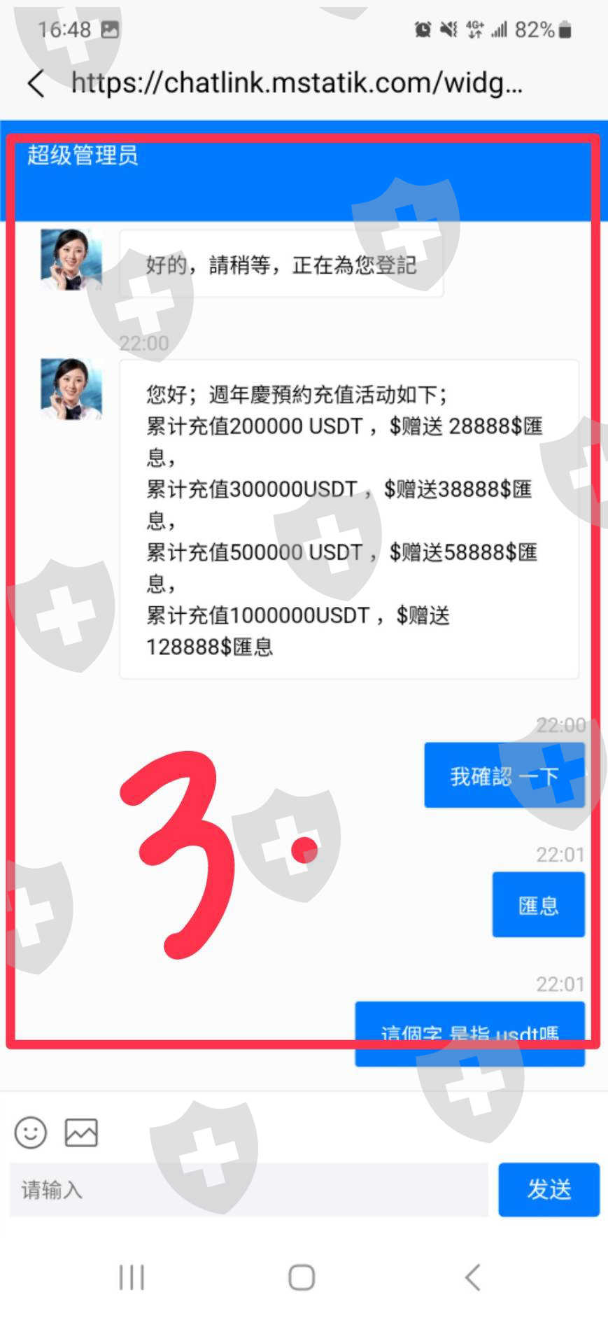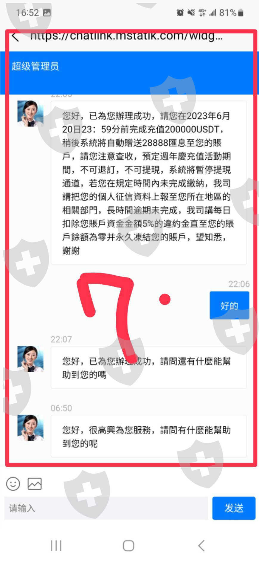 客服說:匯款已經發出了,這個活動從開始就沒有辦法結束,所以我覺得這不是活動,而是陷阱……我跟他說希望他不要參與,這個平台有問題。我就跟他說平台有問題,別投了。 (試了很多方法問客服,問充值活動是不是新會員,會退回原價嗎?)或者以老會員名義問,有沒有新會員活動?客服會說可以:不過你只要投錢進去就可以了。(但是詳細內容很矛盾)只能怪自己一時沒發覺,但希望大家不要再上當受騙