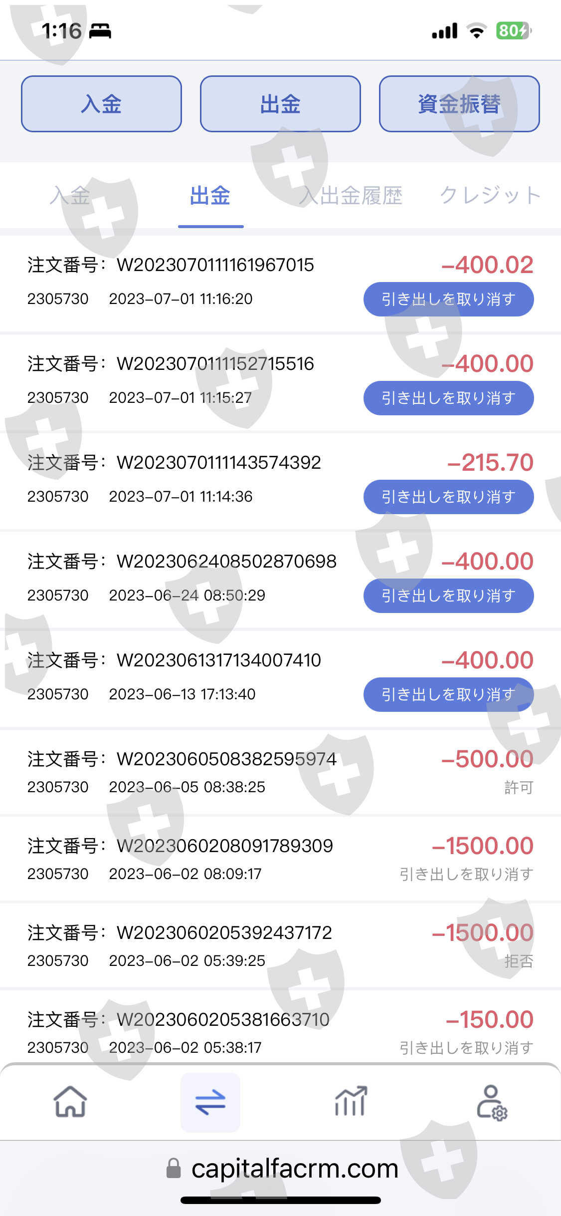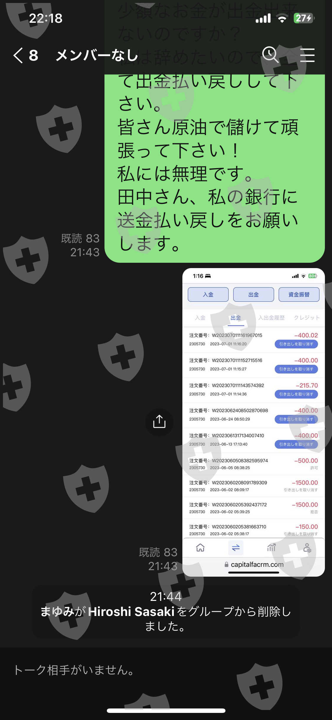 出金申請後24時間以内に実行すると言われたが、全額の出金申請を6/13にしたが、CFAの口座から私の銀行口座に出金、送金されない。112名在籍のLINEグループに私も居ましたが、早く出金手続きをしてほしい旨のメッセージを書き込んだら、そのグループから削除されてしまい、出金手続きの意思がない事はハッキリしたので、詐欺確定です。