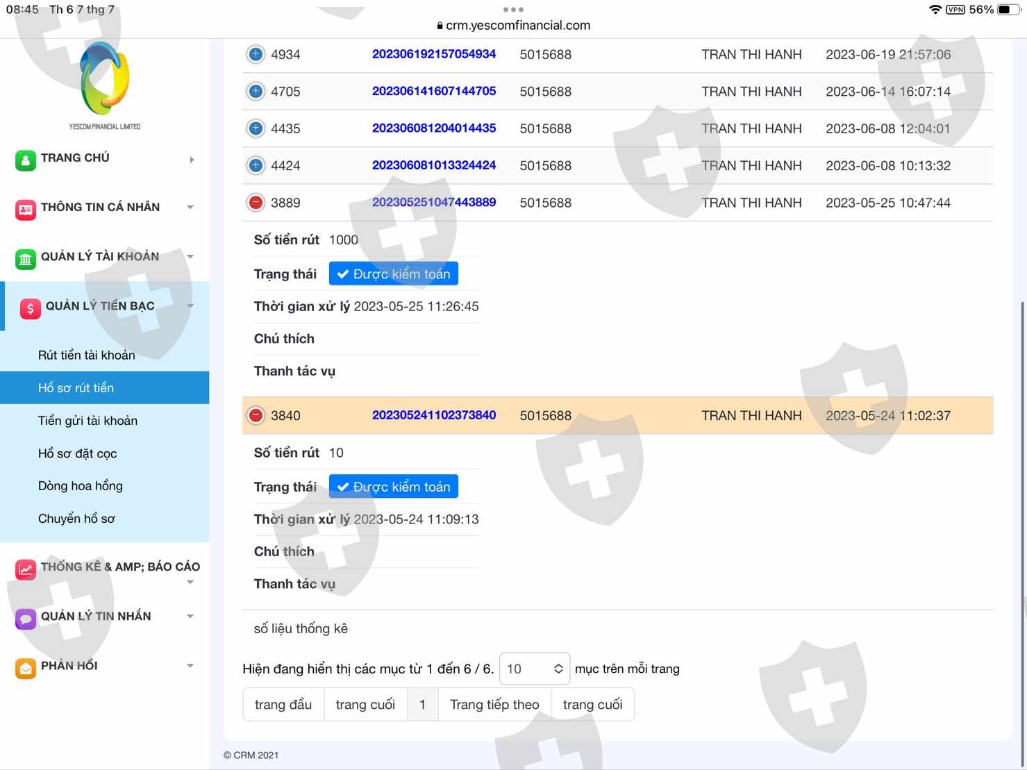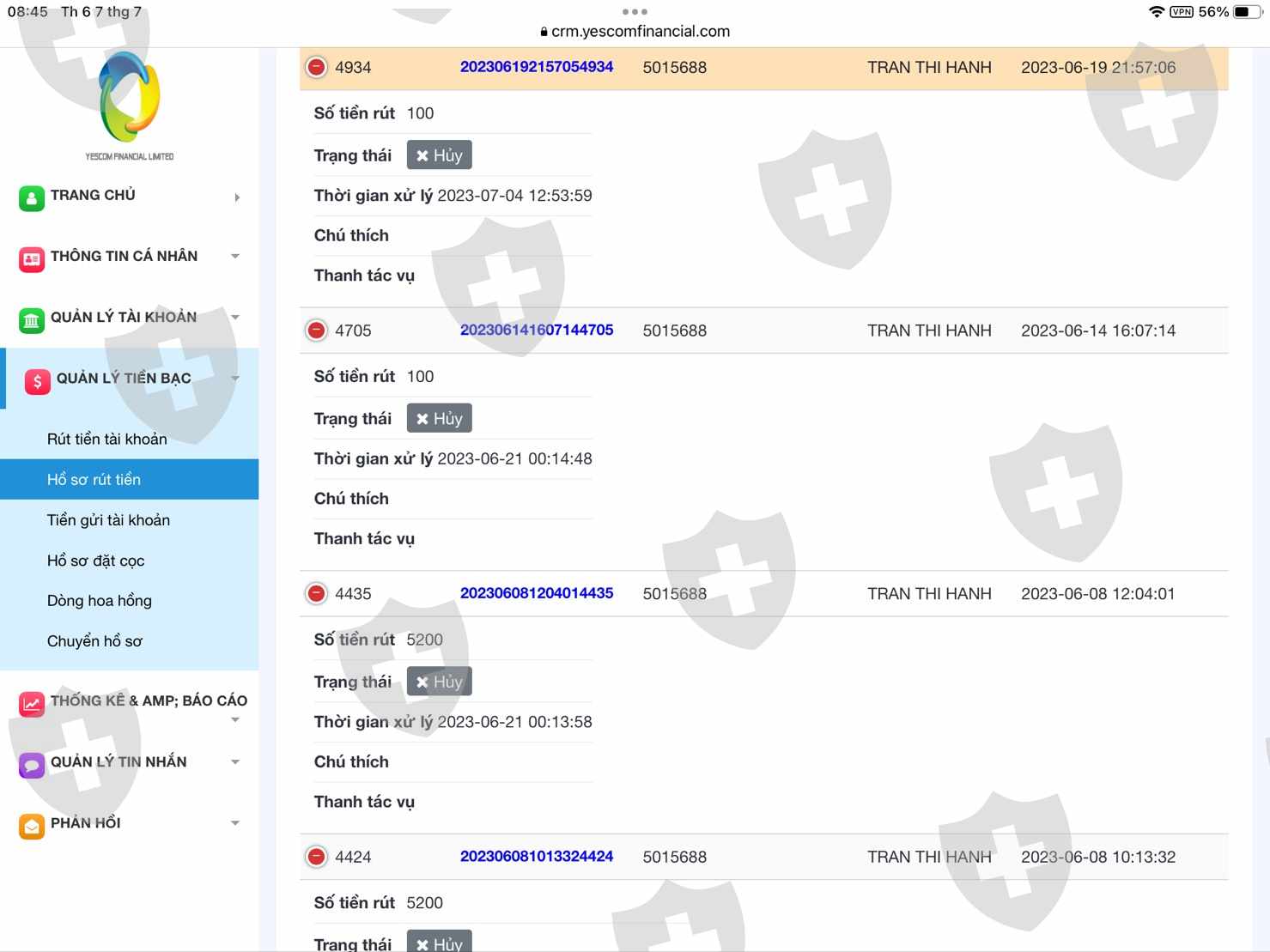 Hello Yescomfinancial! Tôi tên là Trần Thị Hạnh có tài khoản tại Yescomfinancial hanhtran410@gmail.com và MT5 có ID : 5015688 Tôi đã nạp rút thử sàn 1010 vào nagyf 24/5/2023 thì sau 1h tiền về tài khoản nhưng sau đó tôi nap 4.300 vào tk trên để trade vào ngày 8/6/2023 tôi làm lệnh rút 5.200 thì sàn hủy hết lệnh rút tiền của tôi cho tợi thời gian hiện tại 6/7/2023 chưa có tiề về tài khoản. Trong khi tôi viết mail, phản hổi trên wed không thấy có phản hồi gì .Hiện tại vào tài khoản thì Mt5 của tông không xác thực được , tk rút tiền thì số dư về 0 đồng ,trong khi lênh tôi rút tiền bị hủy.Vậy mong sàn giải thích rõ đây là hành vi chiếm đoạt tài sản .Nếu sàn không giải quyết cho tôi tôi sẽ theo tới cùng vụ này lên cơ quan chức năng để được hỗ trợ khi tôi không có sai sót vi phạm gì trong sàn . Vậy mong mạng xã hỗi cơ quan chức năng vào cuộc để lamg rõ hành vi này a.dưới đây tôi có ảnh dẫn chứng cho các thông tin trên