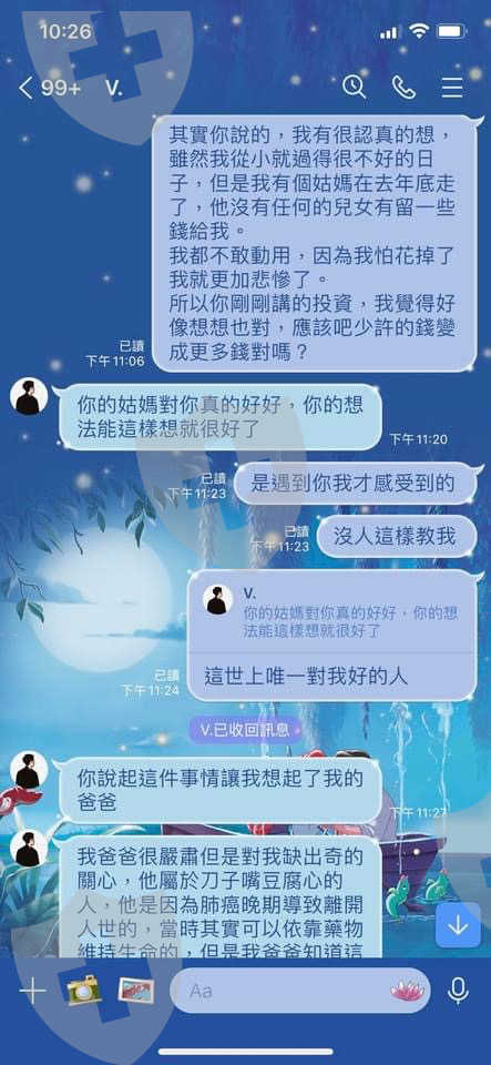 不要相信兩三天就跟你談真感情的人還長得很帥他們都是大陸人然後營造奢華的生活,過程中他還告訴我他爸過世了引起我同情,中間然後他會說他內心有什麼創傷沒有辦法接你的電話之類的,後面一直跟你談外匯交易內容說多好賺洗腦我,讓我入場投資過程都有賺所以我也很放心直到我昨天還有匯款一筆過去,但今天男生不見了搞失蹤平台也無法出金了我現在告訴大家自己要小心不要被詐騙