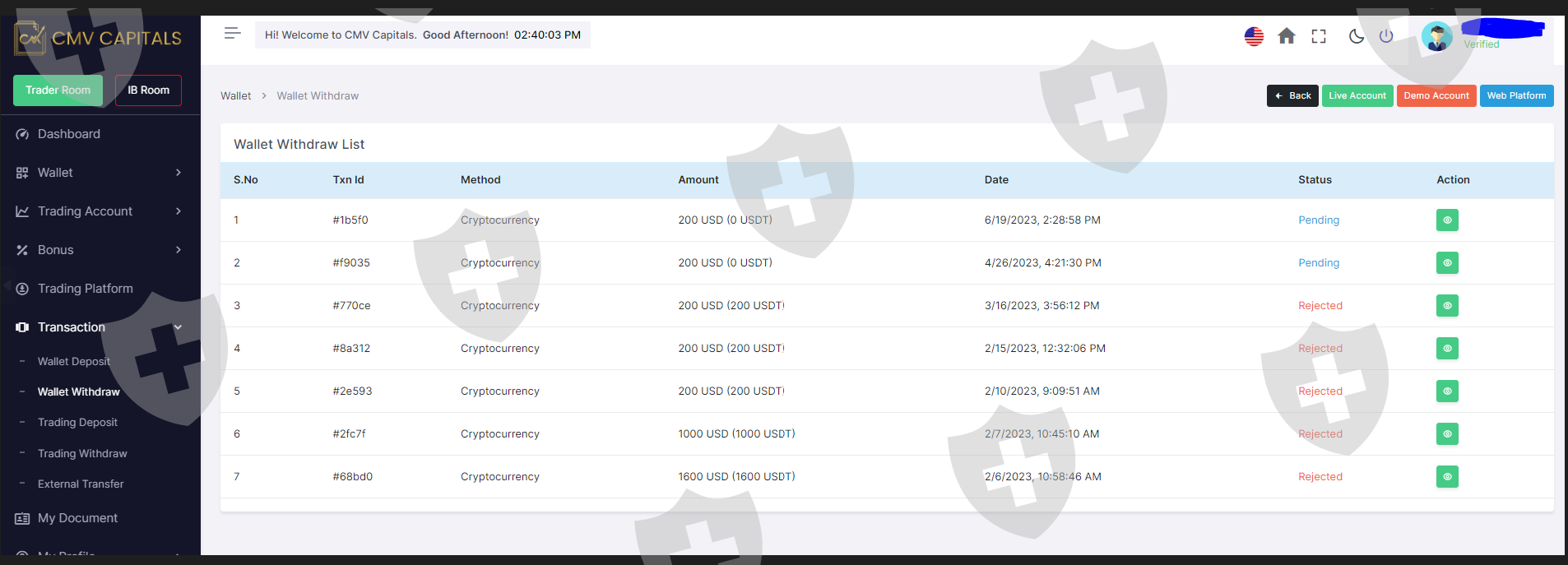 I was creating a withdrawal request with CMV Capitals since February 2023 and they still didn`t approve it.It's been over 6 months and placed a few withdrawal requests but they have been canceled every time.They don`t even want to give my deposit backSo far all I can say is that the broker is not accepting withdrawals.Avoid CMV Trading if you don`t want to lose your money!