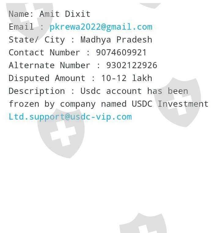 先生/女士,我的 USDC 账户通常由我交易,并在两个月前考虑好,通过邀请朋友选项,我邀请了我的朋友,我们在注册之前都完成了验证过程,然后我们通过互相建议开始交易,因为我的朋友我不太懂英语,所以我帮了他一些时间。在交易中,有一段时间我遭受了很大的损失,我通过贷款等方式投入了更多的钱。但现在 USDC 冻结了我们的账户,说我必须进行税务验证,然后我通过充值我账户金额的 20% 的 USDT 来完成此验证,之后他们停止了我的提款流程,然后公司再次要求 10%我帐户中的存款必须正常提款,否则他们会冻结我的帐户,他们还说看到了一些异常行为,但我想问我做错了什么行为,请对此做出解释。我现在已经失去了所有的钱我必须去找网络警察,我别无选择,请采取适当的行动,否则我必须对公司采取行动。我已经准备好验证我的身份了,谢谢 support@usdc-vip.com 指定的公司通过带我进行交易来欺骗我,然后一次又一次地索要钱财,他们冻结了我的身份帐户,我无法提取我的钱,他们指责我的异常行为,并要求我提供资金来解冻我的帐户以进行提款,他们要求我以我已完成的税务验证过程的名义将钱存入我的帐户,大概占交易金额的20%