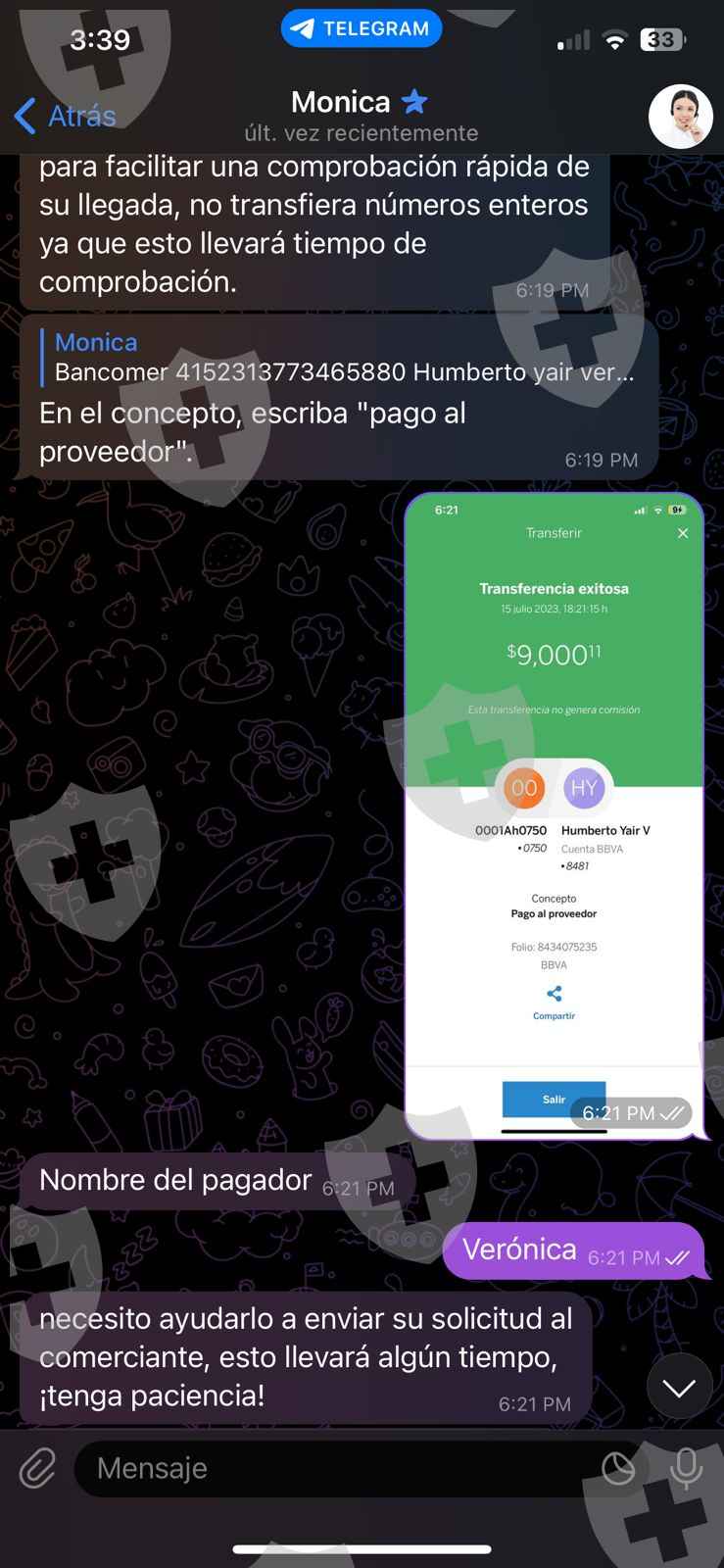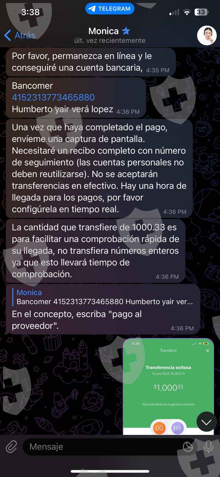 首先,它不会让我放置诈骗页面,但请,我希望能够实现恢复您好,下午好,很高兴见到您,我的名字是维罗妮卡·哈维尔·奥蒂亚,我的国籍是墨西哥,我今年 28 岁。在底部我发送证据;现在,从欺诈的故事开始,2023 年 7 月 15 日,一位名叫 RAMA 的女士给我发了一条 Whatsapp,告诉我她的名字是 ANA,据说是一个有电话号码的招聘人员,她联系了我并说服我在 Tik Tok 上关注一个人,只要我赚了 100 比索,之后她把我和一个所谓的接待员 (Mònica) 一起发送到 Telegram,该接待员显示为 @kL00002,他给了我我和莫妮卡一起发给我一个代码,和莫妮卡在一起,他把我安排在一个小组中,我必须做“假定的任务”,因为我认为这是一项简单的工作,当我到达某个区域时,他要求一项预付费任务,我必须为他支付费用,以给我福利,最低金额是1000.22,所以我做了一次,他给我派了一个名叫内托·蒙特罗@xx00003的人,以便能够创造利润,他向我解释了这一点,他向我解释了,我只选择了两个选项,但是我继续完成我到达的任务,我们到达了另一个预付费任务,现在他给我派了另一位名叫 XEVER HERRO 的招聘人员,他在电报上显示为 @fa8588,他非常骚扰我,他把我放在一个 4 人小组中,他们是为了一项所谓的投资,他说这将以 2 到 4 项任务或 1000.33 的投资结束,但事实证明,他们留下了另一项 3000.11 的任务被迫能够为了获得投资,然而所谓的招聘人员告诉我,我错了,所以我必须存入 9000.11 的存款,他提到我又错了,他要求我存入 27000.22,所以我问这是否是最后一个,莫妮卡说是的,没有问题,它会完成,所以我这样做了,结果发现还有另一个 88000 的任务,我没有存入。这只是一个骗局,莫妮卡一直告诉我,当我付款以获得福利时,否则她会留下来,而且她应该删除我的bitcoins28帐户,他们应该把钱汇到那里,当我尝试手动提取它时,它不允许我,因为它说我需要激活它,所以我总共有41000.99比索,其中我应该得到54700权重;对于未退还存款的存款,应该注意的是,所有存款都转入同一个账户,即 BANCOMER。帐号为 HUMBERTO YAIR VERÁ LOPEZ,帐号为 4152313773465880,每张照片都有发送时间。由于您无法发送所有证据,请发送最重要的证据。请帮我恢复已发送的内容