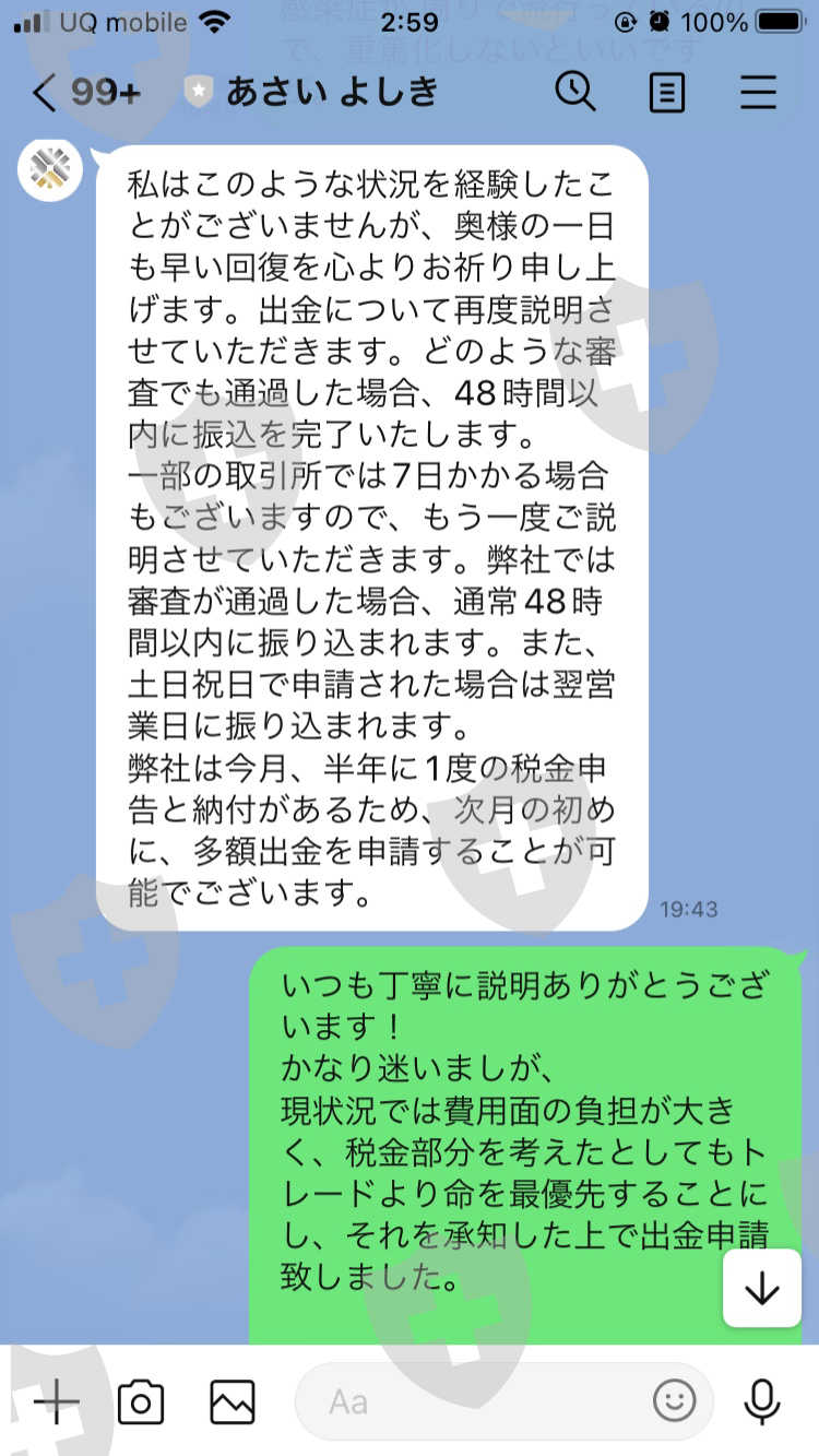 一开始内容就像正常的投资组一样,话题就股票之类的日常话题进行,但说到利润率,FX成了最好的结果,而且还接到了一个被称为老师的电话(据说如果是脱节的交易所,据说手数和杠杆会统一)。我存了几笔存款,因为我能够看到结果,但我认为是时候提款了。但是,我需要钱,所以如果我办理10万日元的提款手续,虽然会被批准,但不会存入我的账户。当我在推特等上查找信息时,我发现有一位同名老师受到了伤害。