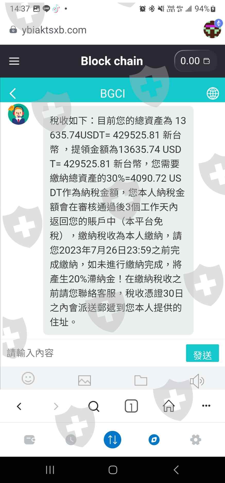 當要出金13635.74USDT 台幣=429225.81 平台卻說要補資產總30%=4090.72USDT 如未依期限內補足稅金 還要加收20%滯納金 當你金額大於稅金 後台又因金額不符 惡意不出金