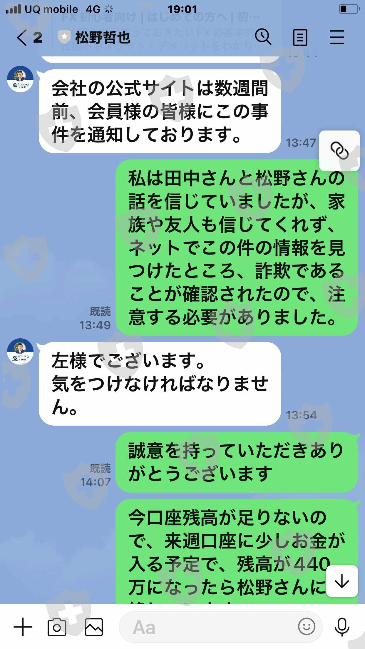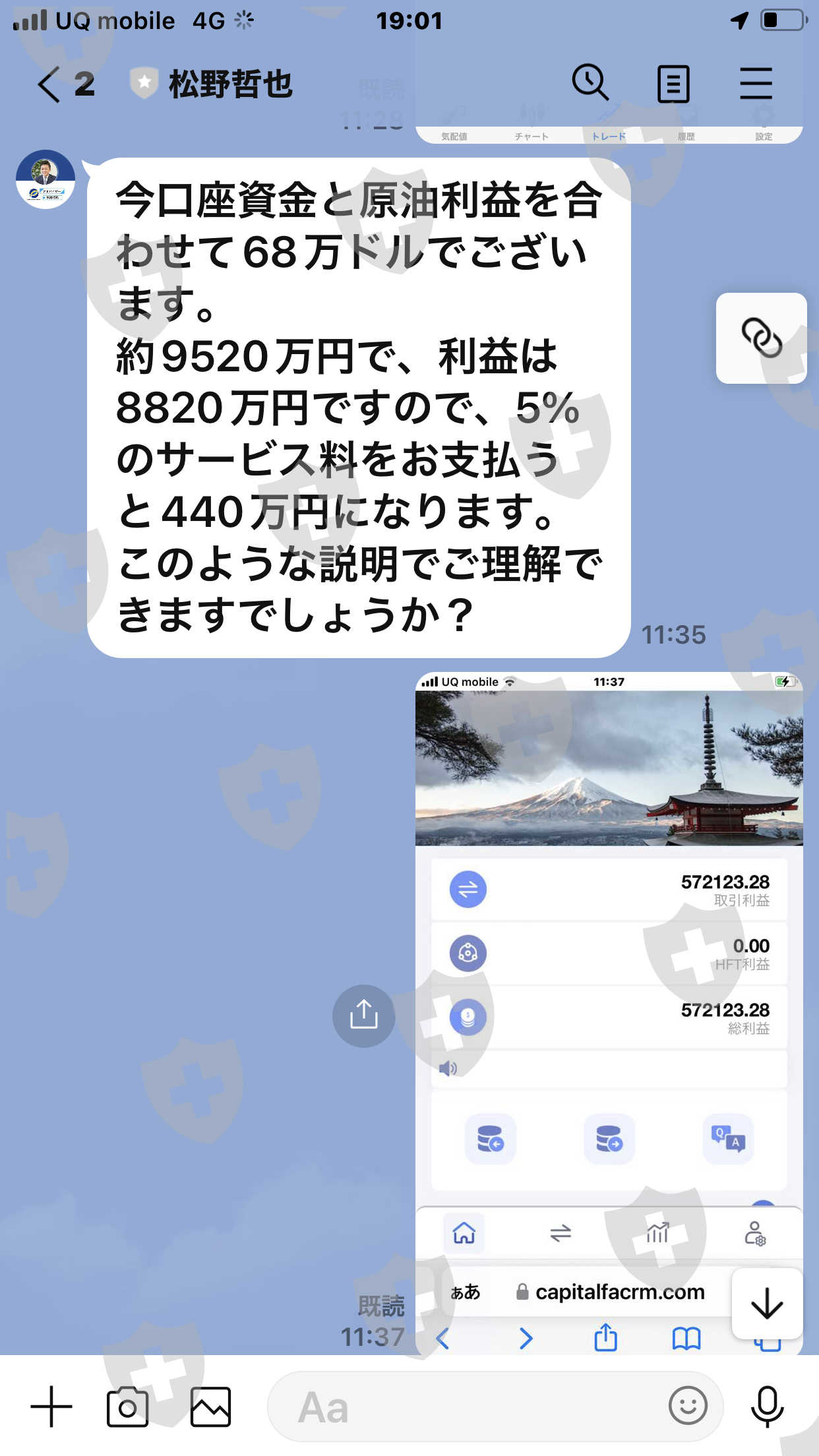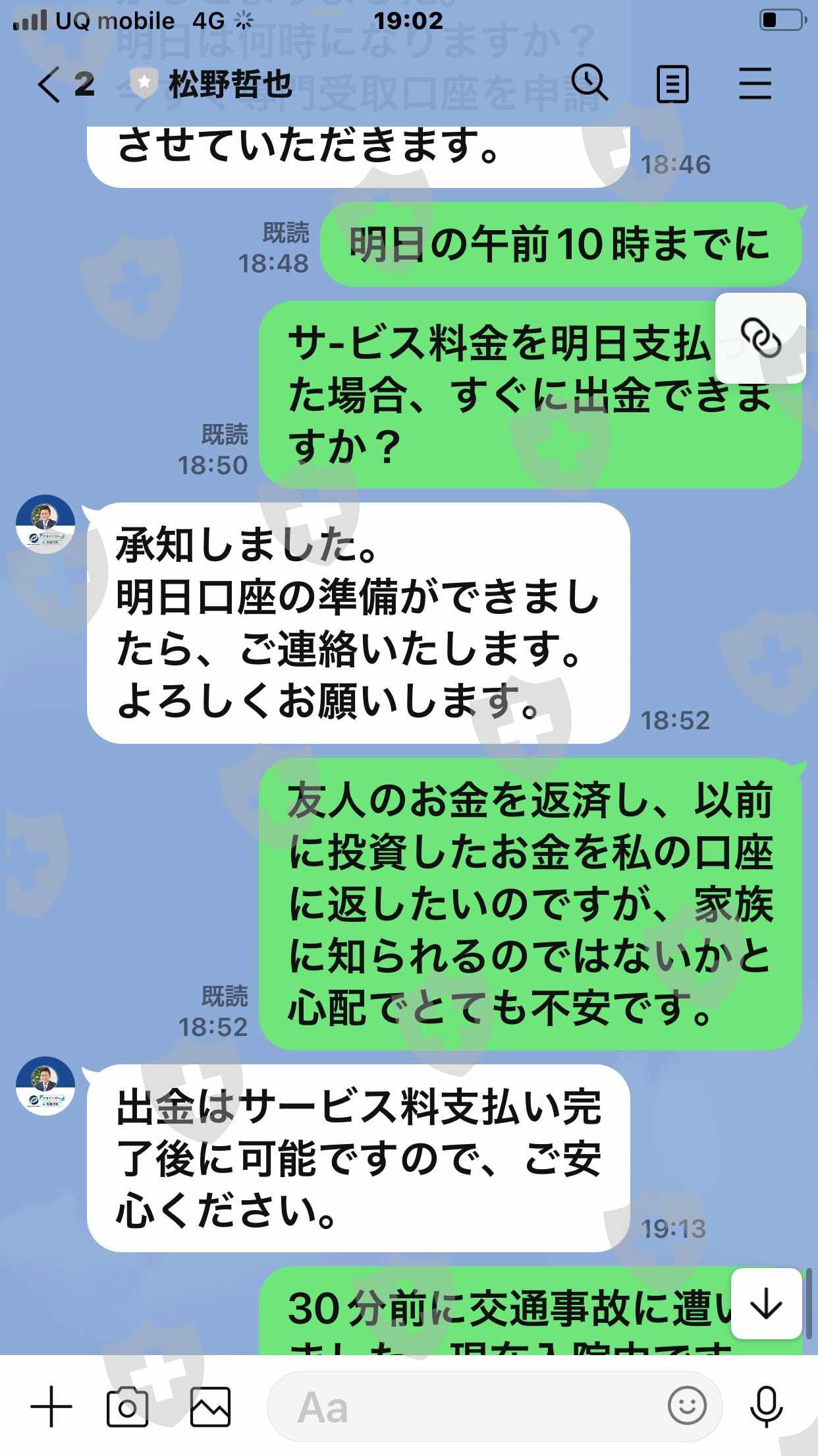 月6日に、私はこの会社から元金103万を含む207万を引き出しましたが、会社は外国税を支払う必要があることを通知しませんでした。7月7日、2回目の200万を入金しました。松野さんは「頭金は200万でいいです。500万は無利子で融資します。当時は500万は借りたくありませんでした。元金200万で少しでも儲けたかっただけです。」と言いました。松野さんに「無利子で貸してください」と何度も促され、迷った末に承諾しました。3日で500万を返しました。その後は毎日、田中さんと松野さんが取引を指導してくれました。半月後、元金700万で9000万以上儲かった、これはグループの多くの人が儲かったと言っている、お金を引き出したいから私もお金を引き出したい、松野さんは5%さえ払えばと言った440万サビス資料、私は安全にお金を引き出すことができますが、440万を支払った後、松野氏は、私が今引き出し状況を調査するために銀行に関与していると私に言いました、誰かが脱税、税金を恐れていると言いました脱税、以前に100万の税金を払っていないことが判明したのでお金を引き出してくれないと言い、お金を引き出す前に一度に1700万の税金を支払わなければならないと言った
