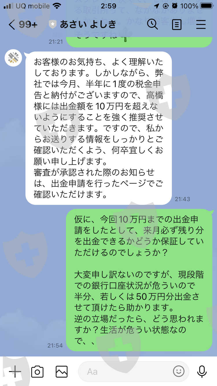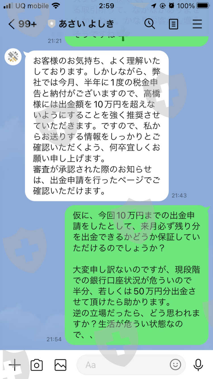 我们一开始通过LINE群交流,每天谈论经济形势。不久,外汇交易的话题就出现了。有一个讲师是主导者,他指导我们开仓平仓和手的数量。每个人都从中获利了。我当时在旁观,然后开始入金并参与交易。在我意识到无法出金前,投入了大量资金。我想要提取我的利润金。但当我申请提款时,经纪人(浅井芳树)联系我,说我应该多考虑一下,因为要收税。他让我等一下,因为下个月就要缴纳税。所以我就因为这个理由推迟了。毕竟是一次都没有出金的交易,而且在持续进行。而且,在不知情的情况下,我就被拉进到了类似的 LINE 群中。有些人的名字不一样,但与之前那个群谈论的是相同的内容。大家小心。