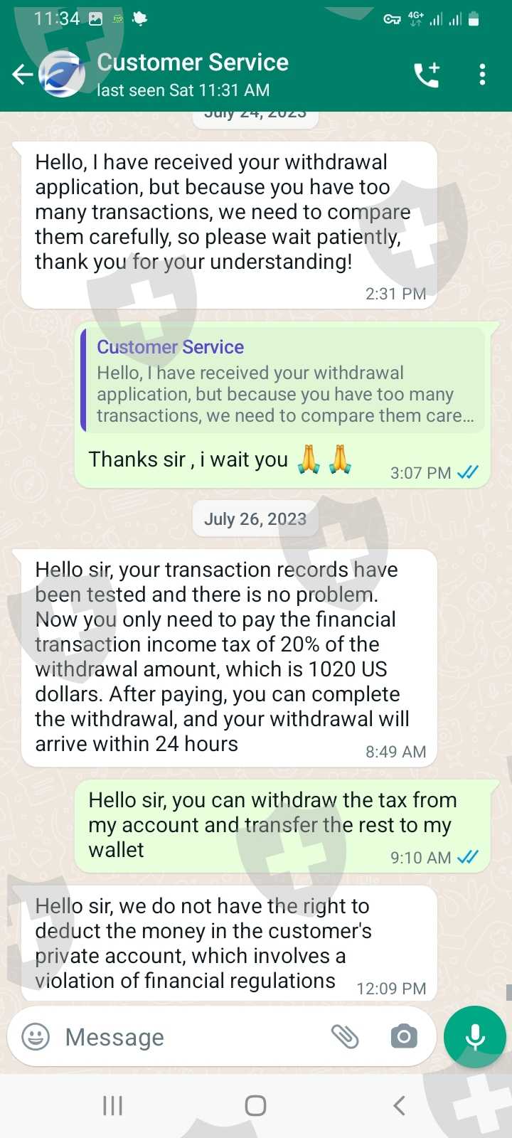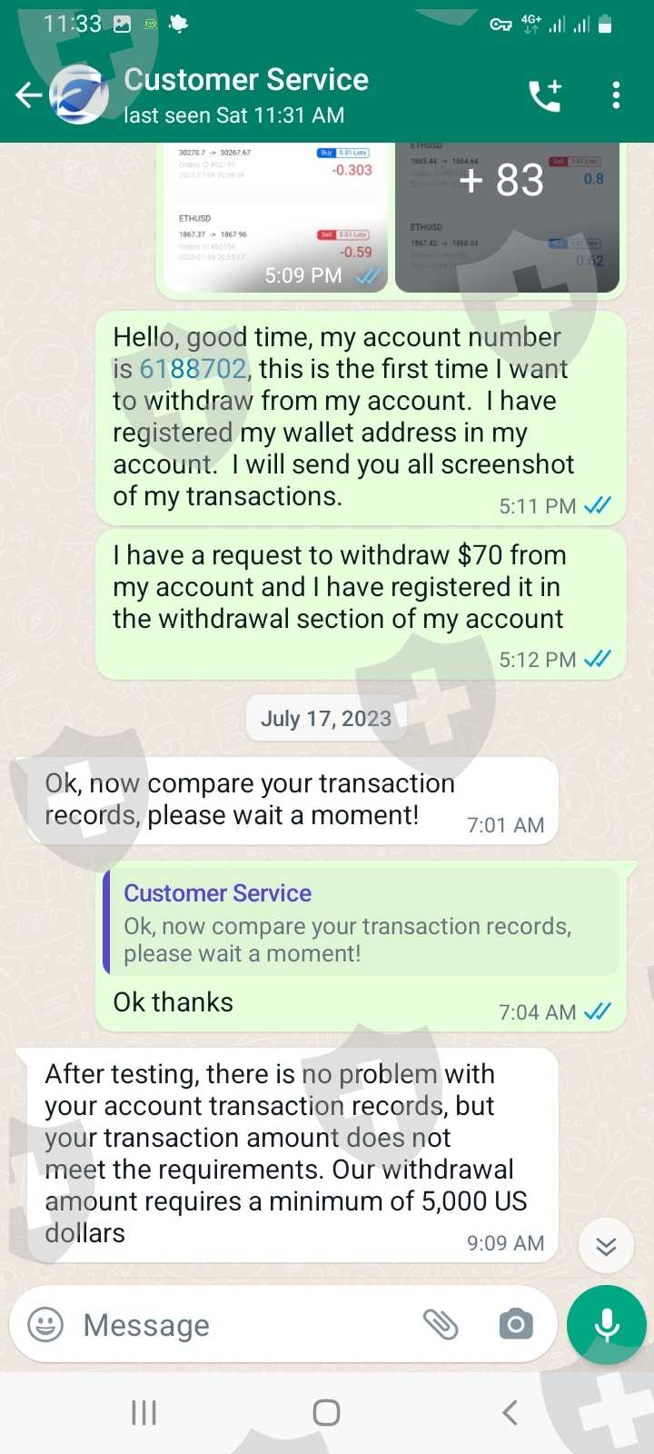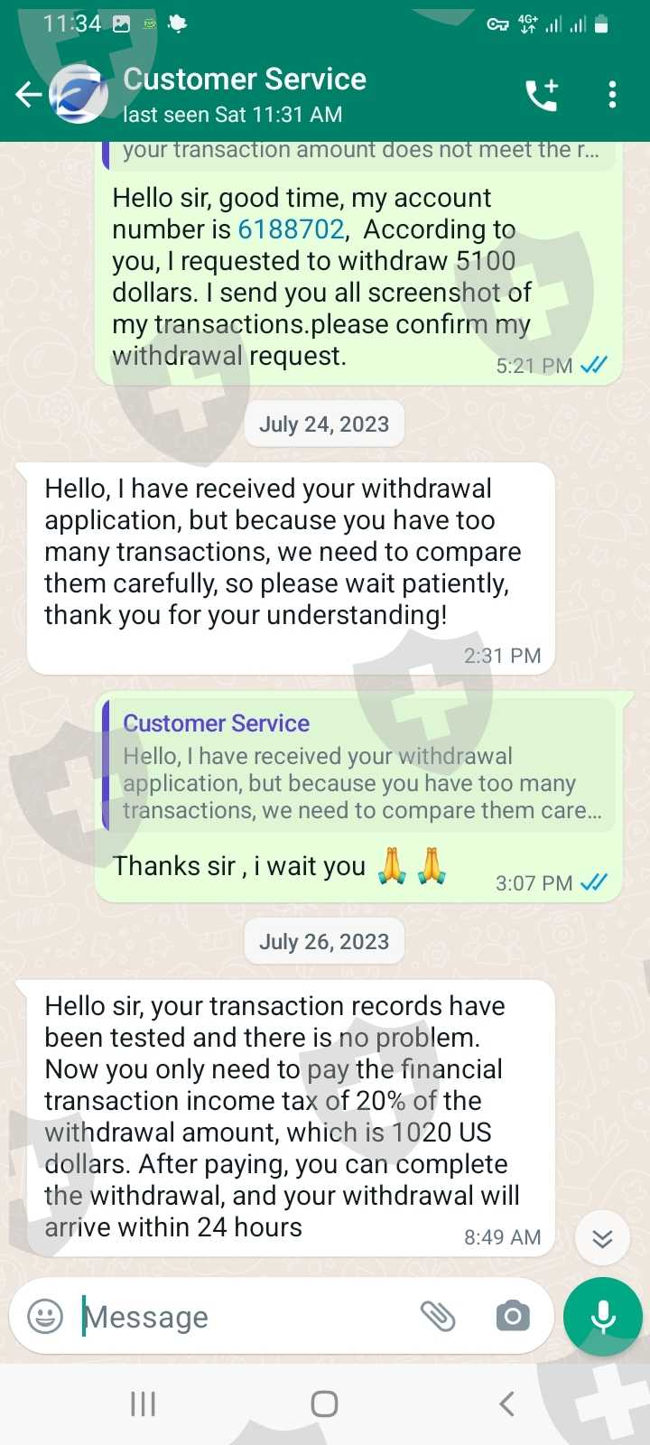 您好,我的账号是6188702,我要求从我的账户出金,但是客服说资金必须达到5000美元才能出。 我增资到5100美元,但是这次他们又找了个借口,说要缴纳20%的税,相当于1020美元。 我没有再存入 这20%,因为如果存入,他们就不会退还我的钱。 每笔交易均需缴纳税费和佣金。 额外支付是不对的。 我告诉他们从我的账户上扣税,但他们不接受。 请帮我拿回我的钱。