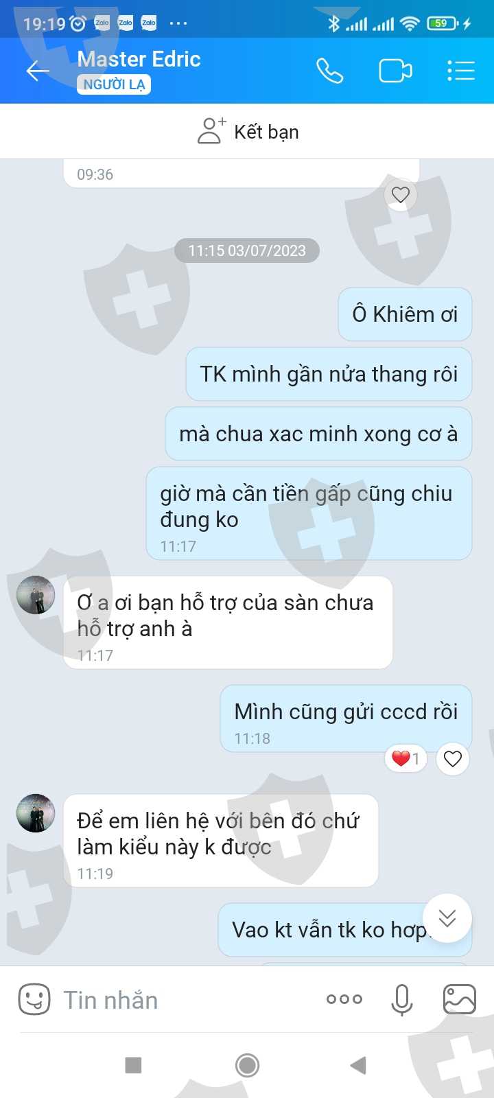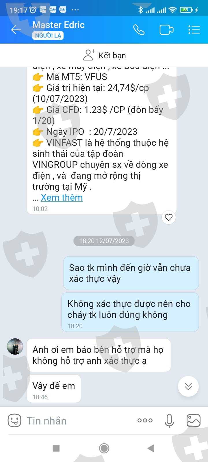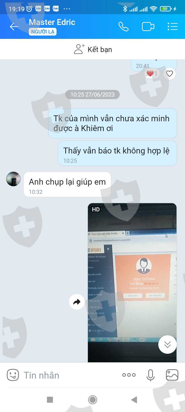 Sàn firstoption cố tình không xác thực tk cho mình để mình không rút được tiền.Đến lúc mình thấy lâu quá hỏi liên tục thì bọn nó chơi bài bảo mình mua mã nhận thưởng , mình đã từ chối vì mình không còn tiền để nạp nhận thưởng đâu.Chúng nó bảo a cứ nhận đi nạp sau cũng được.Vì tk mình chưa xác thực nên cũng không giám cãi lời bọn nó phải nghe theo.Tầm khoảng 2h30 nó gọi điện bảo a vào mua 2 mã nhận thưởng này nhé(mua 40cp MTFR và 2,5 xptusd.f)khi mình ấn mua xong phát mình cũng vào kiểm tra tài khoản ngay.Mới ngã ngửa ra là tk bị cháy luôn rồi.Mình gọi cho thằng Quân là thằng bảo mình mua 2mã đó luôn, rồi nó bảo làm gì có chuyện cháy tk được để nó check lại rồi mất hút luôn.Mong admin giúp mình lấy lại tk với.
