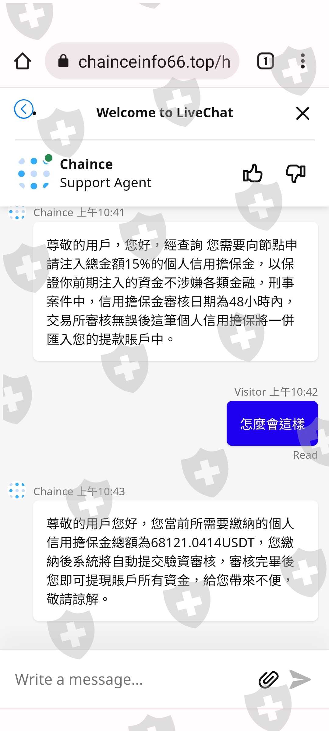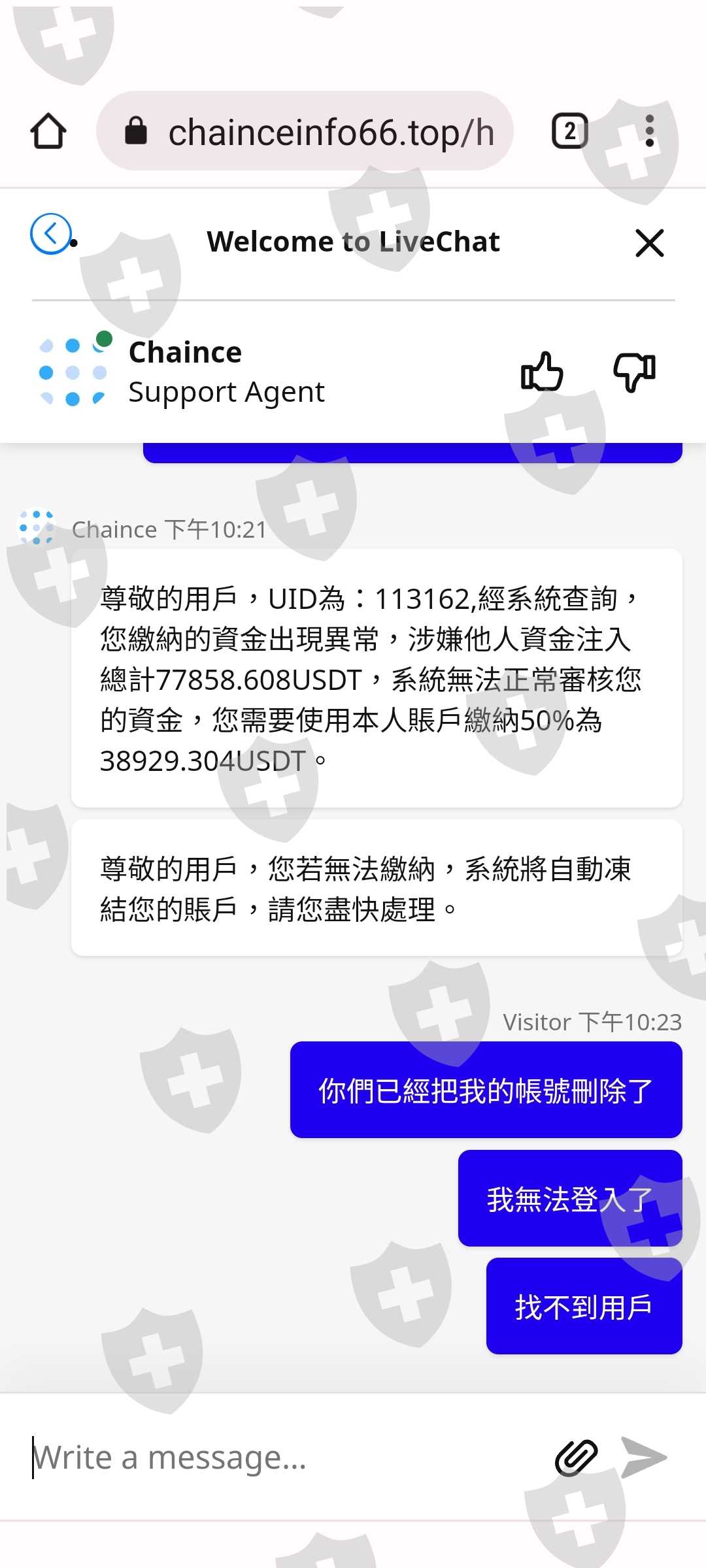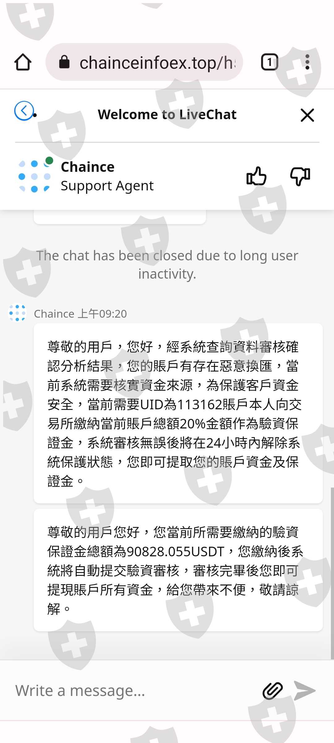 香港一名自稱李裕翔的男生在6/04加了我IG,當中很熱絡聊天,也很快的發展成戀人,每天按照三餐問候,也會分享日常照片,或是通電話,聊天時也有提到平時他會研究加密貨幣,後來開始教導我從MAX平台轉錢至OKX錢包,再轉到Chaince這個交易所平台,利用期貨交易一開始金額約新台幣20萬,獲利大約410美金,慢慢的有獲利之後鼓勵我可以把股票的錢放入加密貨幣中,獲取更高額的利潤,因為他當中不停保證絕對可以在隔一個月領出,因此我完全信任他,向銀行借貸154萬,還跟朋友再加碼借了200萬,希望可以利益最大化。這當中利潤從幾百塊美金增加到幾千,甚至上萬元,而李先生也投入了3萬美金一起投資,所以我完全相信我們可以一起創造財富。直到7/25最後一筆交易要申請提領時,平台要求繳納高達美金9.9萬多元的驗資保證金,只有一週的時間,我搬出了可以動用的存款,跟李先生一起完成繳納。結果平台又來通知,因交易頻繁,須再繳納約美金6萬多塊的保證金,證明資金來源正當。前後李先生幫我繳納了7.7萬美金的保證金,因此我非常相信他,而當我動用所有存款,8/02把身上所有積蓄拿出來時,平台又聲稱有部分資金不是我這邊繳納,而這個金額剛好就是李先生幫忙繳納的資金,所以需再提供約40000美金的保證金,繳納期限為8/04晚上12點前。一般我們繳納時只會秀出鏈上錢包的地址,平台怎麼那麼剛好知道那些是李先生的呢?當天晚上平台直接把我的帳號刪除,我才驚覺我受騙了。而我反應跟李先生說我真的無能為力再支付時,換來的是他暴怒生氣。
