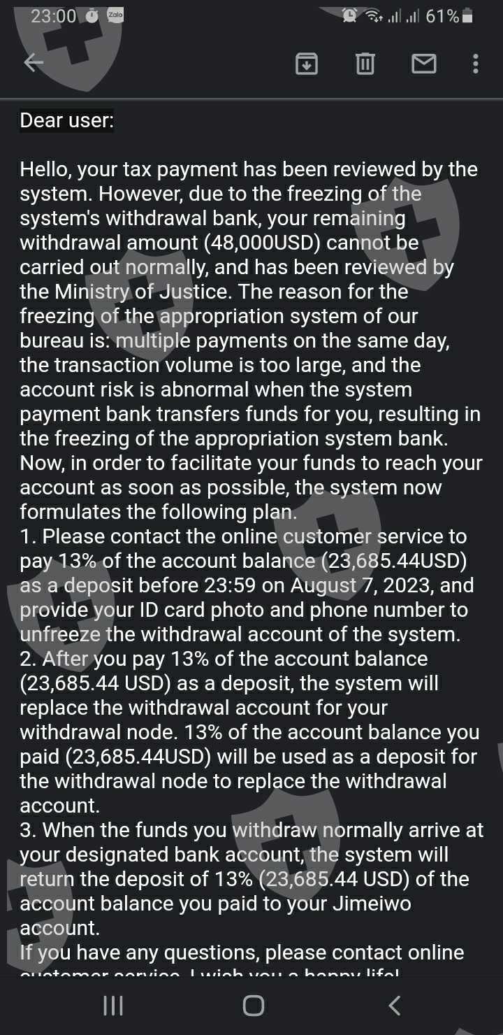 这是一个假软件! 一个Ins账户名叫Pete Makaabusu的人故意和我交朋友,然后谈论外汇、经济、爱情、家庭、未来......并引导我投资这个软件,他还从他的韩国银行账户投资到我的账户 。 我按照他的指示尝试,获得了一些利润。 但随后他建议从该平台申请一笔C2C贷款,以便在一周内获得更多利润。 然而,这笔贷款需要通过存入更多资金来偿还。 我还完贷款后,由于Pete借给我的钱是从韩国来的,因此出现了洗钱嫌疑,他们发邮件强迫我在有限的时间内存入同等金额以验证这笔钱。 完成后,我尝试出金,但随后又出现了税收问题。 他们对我的利润征收25%的高税率,并且只能在有限的时间内完成缴纳。 我缴税并提取了 50,000 美元,但他们只将 2,000 美元转入我的银行帐户,保留了另外的 48,000 美元。还发送电子邮件说我必须存入本金的 23% 来验证并解冻系统银行中冻结的 48,000 美元,我需要在有限的时间内再缴一次税,否则我的账户将被永久冻结!! 这绝对是无稽之谈! 最后,他们没收了我所有的资金! 请不要投资这个假软件! 每笔付款均转入个人银行账户!