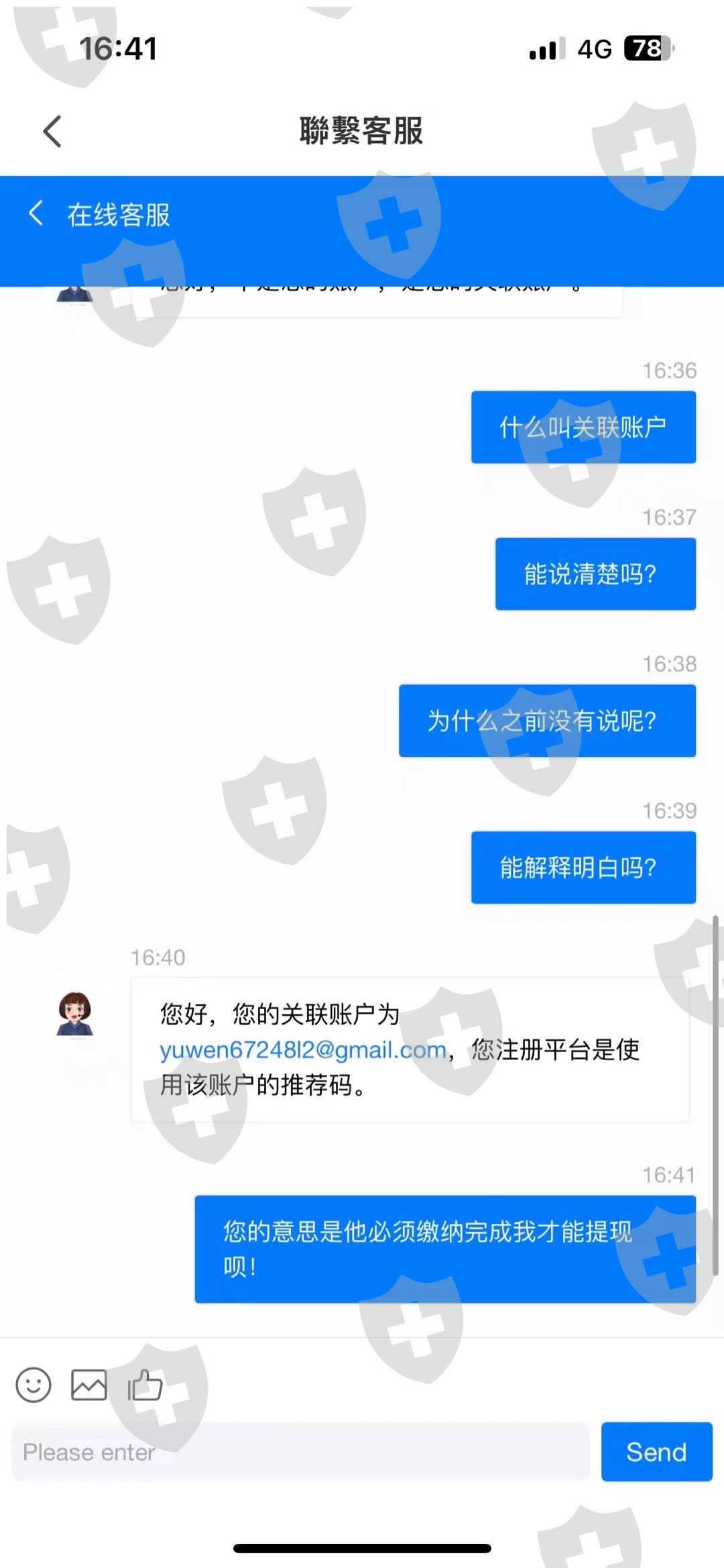 我注册这个账号是使用了推荐人给我的码、现在我不知道真的平台政策原因还是怎么回事、本来说我不能出金的原因是因为我的盈利部分税款没有缴、我需要缴纳盈利部分20%、我把税款缴纳完成后还是不能出金、说是关联账号的钱没有缴、这是什么政策呢?我自己的税款、我的账号已经缴纳完成、还不能出金、理