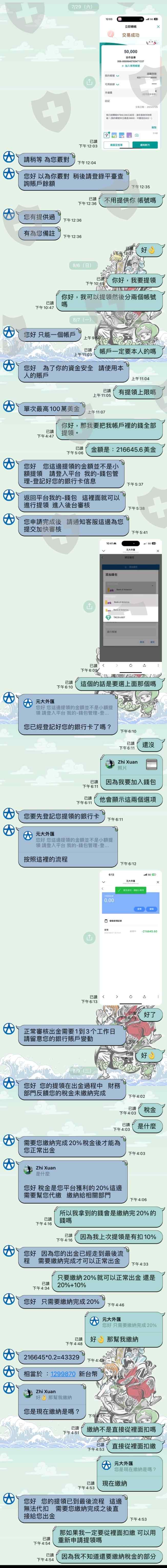 前前後後出金118萬台幣,8/7申請出金,客服回應需先繳納1299870元台幣才能正常出金。客服回應需在8/16之前繳納稅金才能正常出金。感覺被受騙所以尋求幫助。希望等能幫忙找回入金額。
