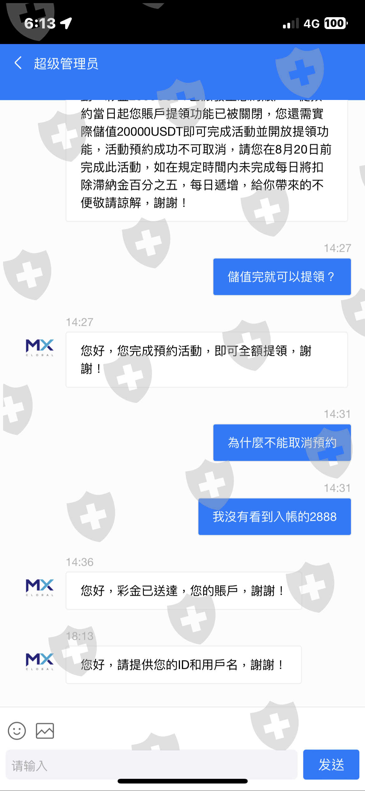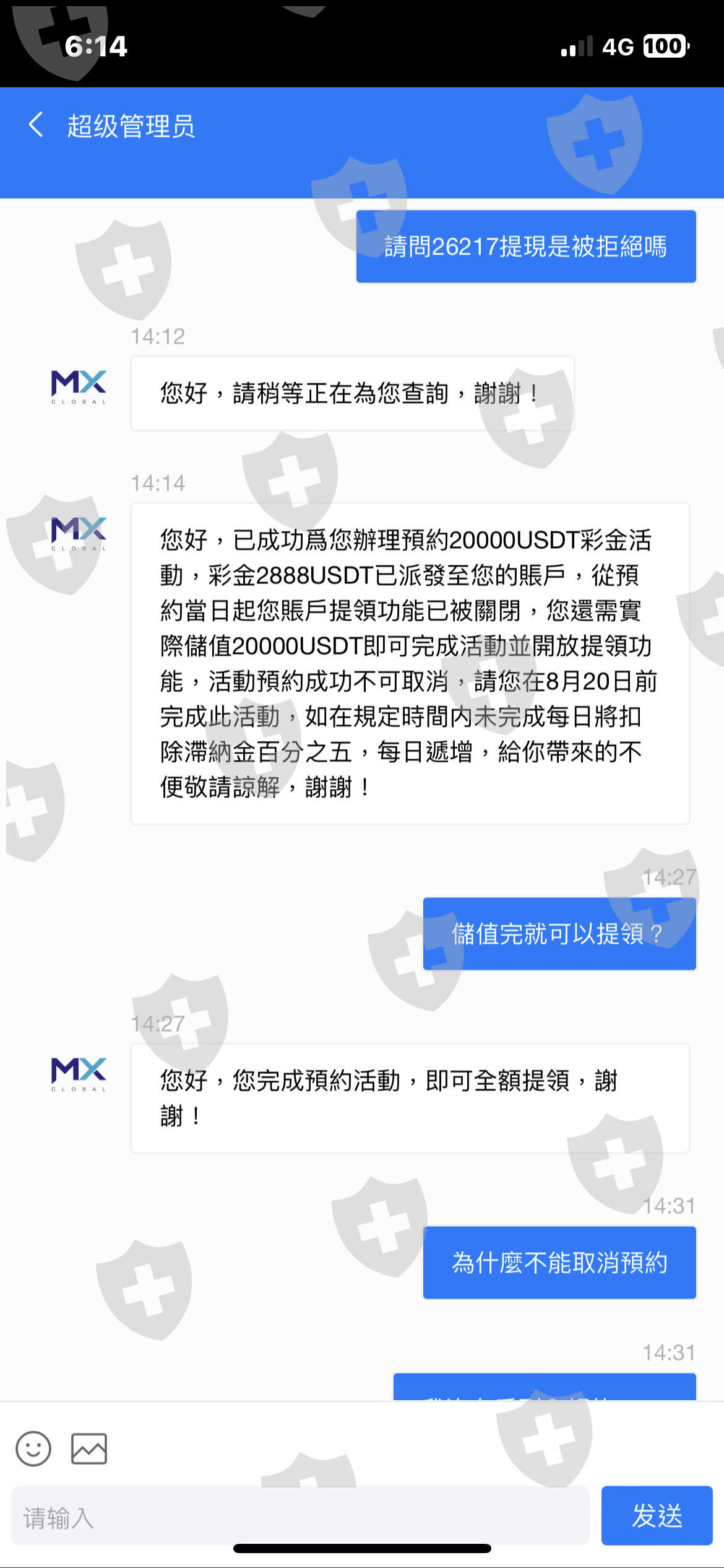 網友要求入金,宣稱有什麼彩金活動,入金2萬USDT贈送2888,之後隨便帶你做個交易,要提領時竟發現無法提領,客服告知在期限內又要入金2萬才可以解鎖,不然每日扣5%