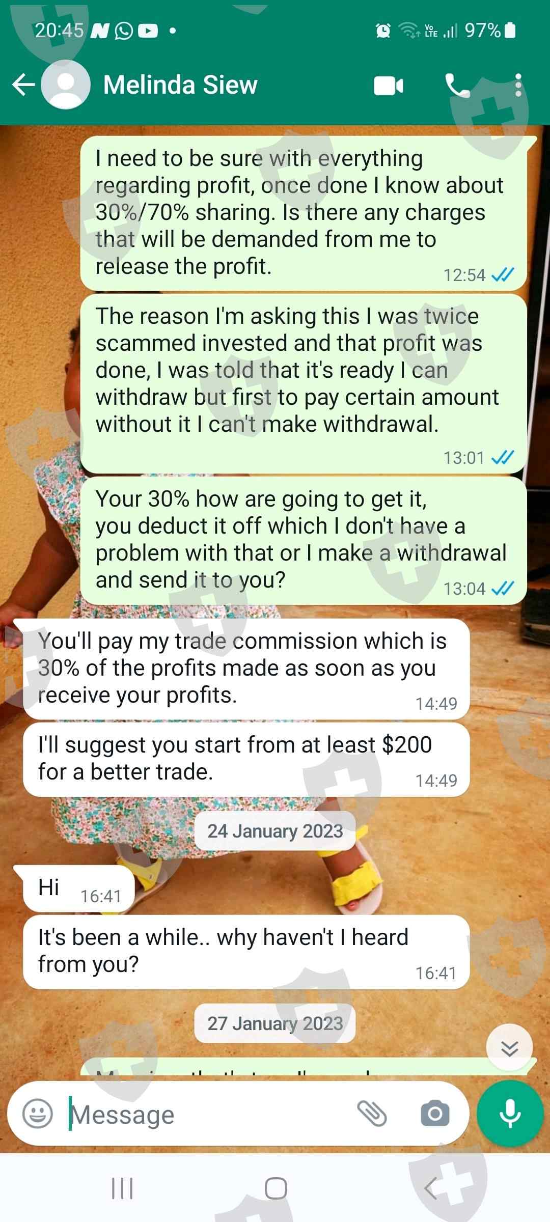 我在Facebook上认识了一位名叫Melinda Siew的女士,她是个交易商。我们不久前达成一致,她会帮我做交易,当盈利时,我出金并给她30%。 我把钱存入 Luno 账户,然后转入一个平台,她给我发了一个链接,名字是 easymarkest.com。 她做了一笔交易,然后告诉我,不要忘记先交20%再出金,然后我们就开始争执了。