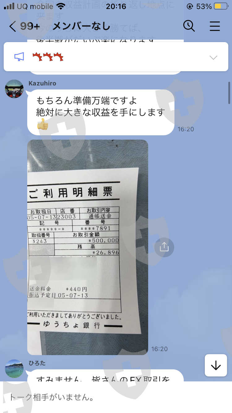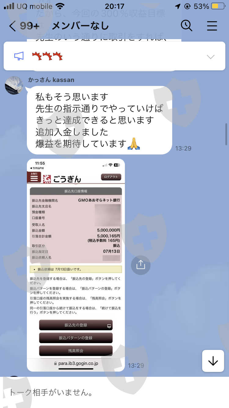 在LINE上聚集了人们的团体,由自称为老师的人们和许多樱花组成。许多团体的名称类似于“个人投资者聚会B2”。自称老师的人与另一伙人名字不同,但谈话和进展却一模一样,看来是同一名罪犯。话题从股票开始,逐渐转向外汇。其中,作为推荐交易所,您将被引导至类似此处或此处的交易者。在我的引导下,一个自称经纪人的人冒充支持并指定了转账目的地,但这是一个欺诈账户。 FX本身可以赢,但你不能提现。意识到这里是一个骗局。为时已晚。它将安装在这样的开发中。请不要转让! ! !有人一心想赚钱,但他们的照片全都是用数字处理的! !别被骗了!