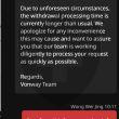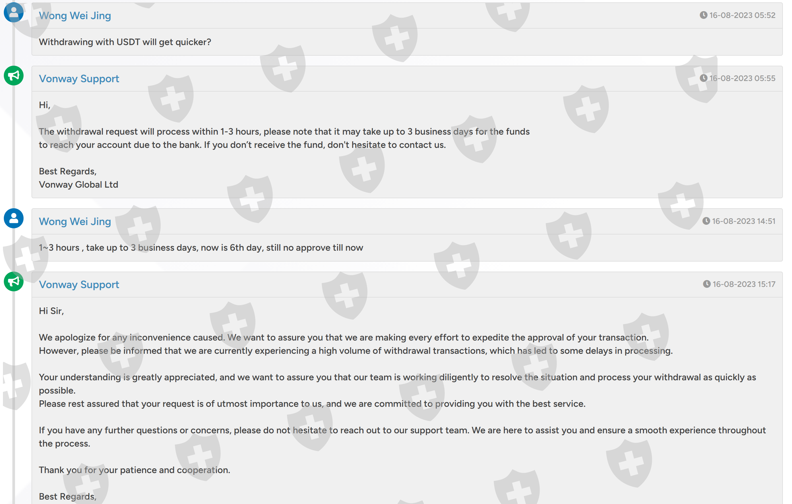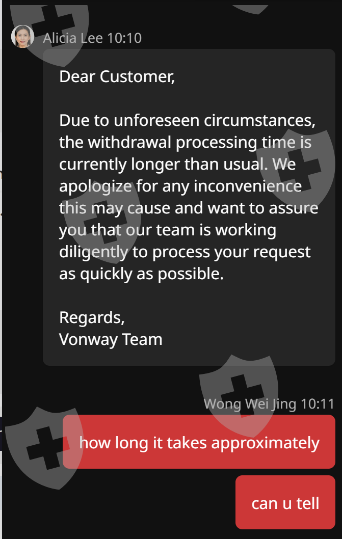 I've placed a withdrawal request of 2380.92USD on 10/8/2023, It's been 7 days since my withdrawal placed, withdrawal status still showing pending check.One of the my friend, Vonway user, placed a withdrawal on 14/8/2023, and his withdrawal approved in just 3 hours.I ask live chat , but they just evading the problem , keep telling me they are facing high traffic.Even when I created a help desk ticket, the Vonway team also replying me the same answer , which they are facing high traffic.When I ask for a specific date or time which they will approve my withdrawal , they just escaping from my question, keep telling me the same answer which "due to unforeseen circumstance, the withdrawal processing time is currently longer than usual". But thy other user withdrawal can approve immediately? But why mine take 7 days and still in pending check?Please pay me my profits.