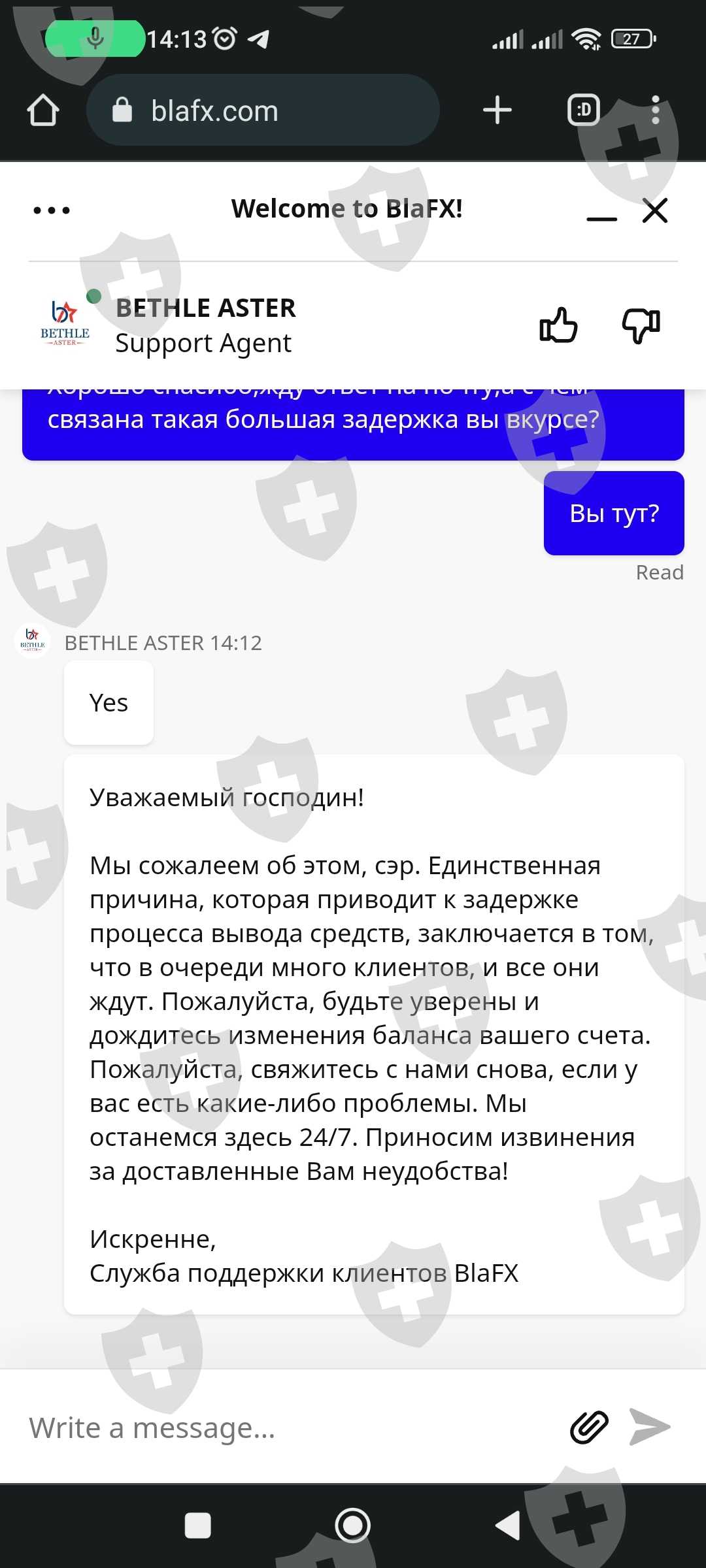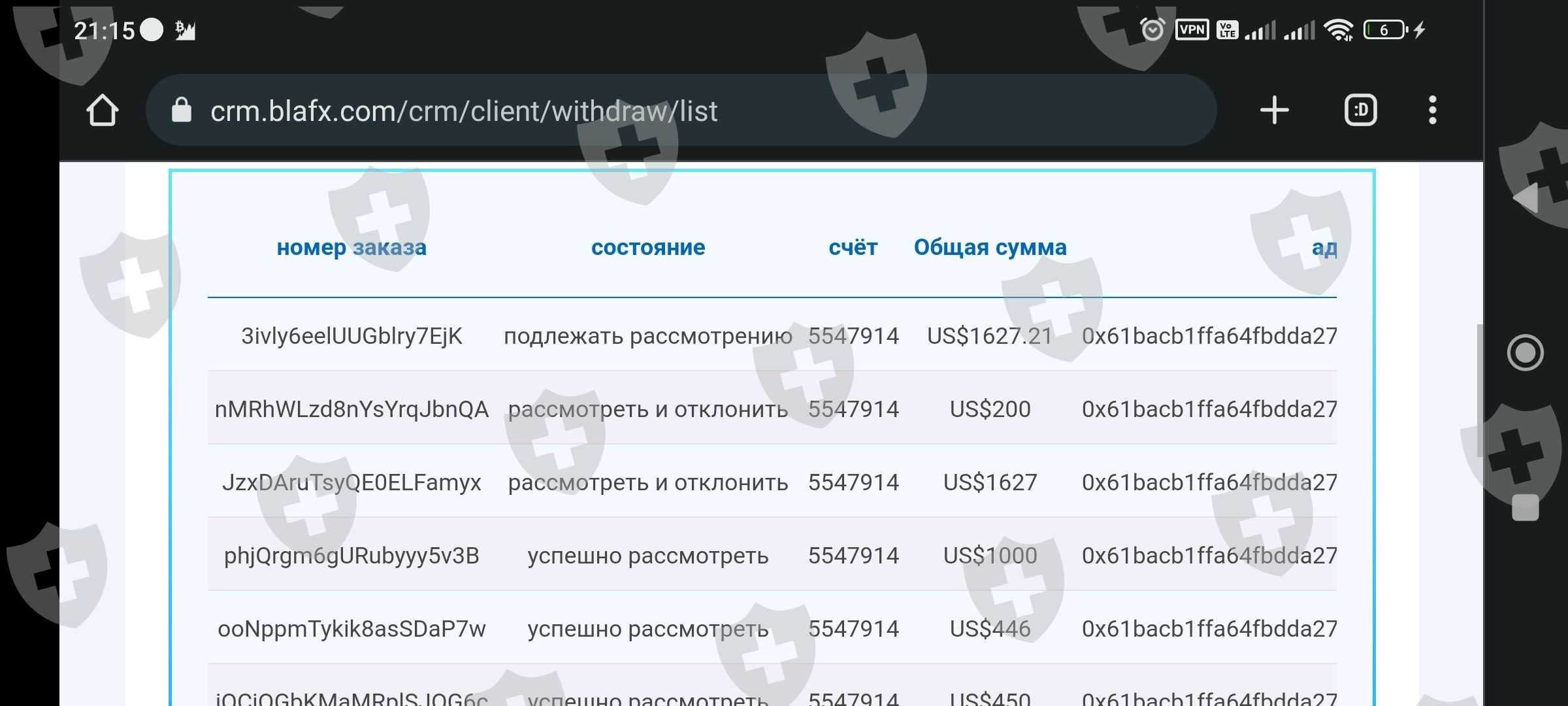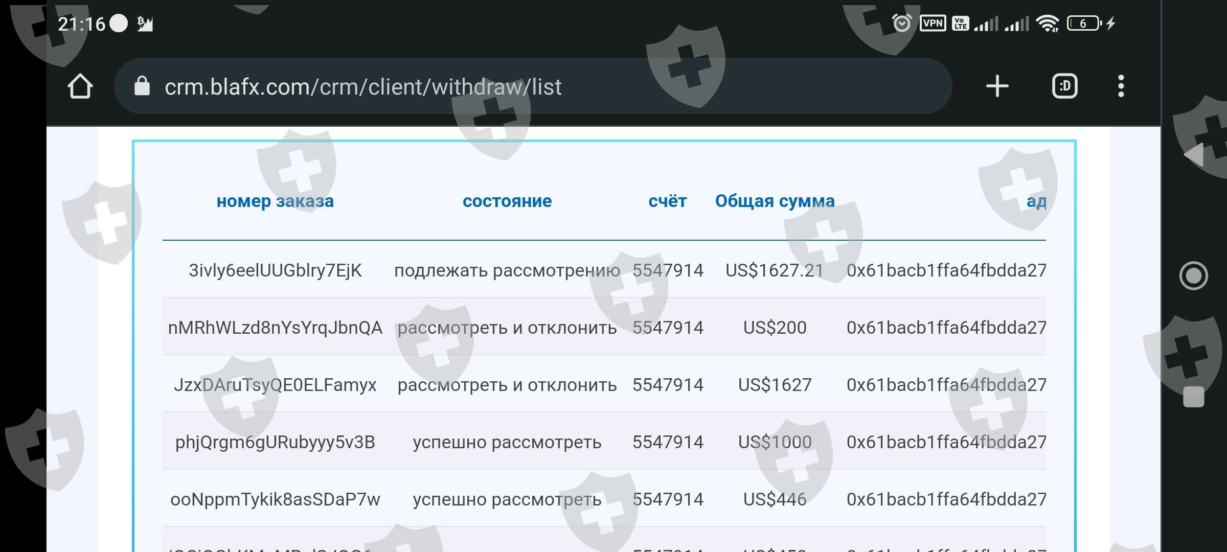 Добрый день! возникла проблема с выводом средст на платформе Blafx,которая длится уже более 24 часов,мне порекомендовали отменить транзакцию и заново запросить вывод средств,это также не было успешно,в поддержке пишут ожидайте 24 часа в течение этого времени деньги должны поступить на ваш счёт,по факту ничего не приходит,я пишу заново в поддержу они лишь попросили скинуть данные почты для проверки и в итоге они ответили лишь то что якобы много клиентов выводит средства поэтому возникла задержка хотя до этого все было в порядке и выводилось моментально номер транзакции: 3ivly6eelUUGblry7EjK .И такая проблема не только у меня но и у моих знакомых кто торгует на платформе, Спасибо вам заранее за помощь!