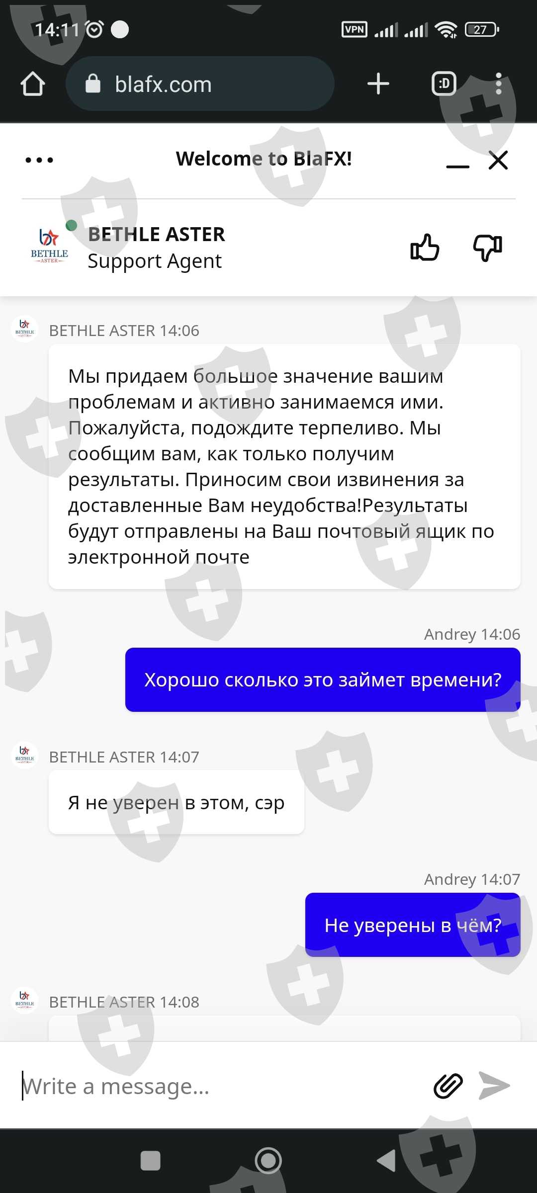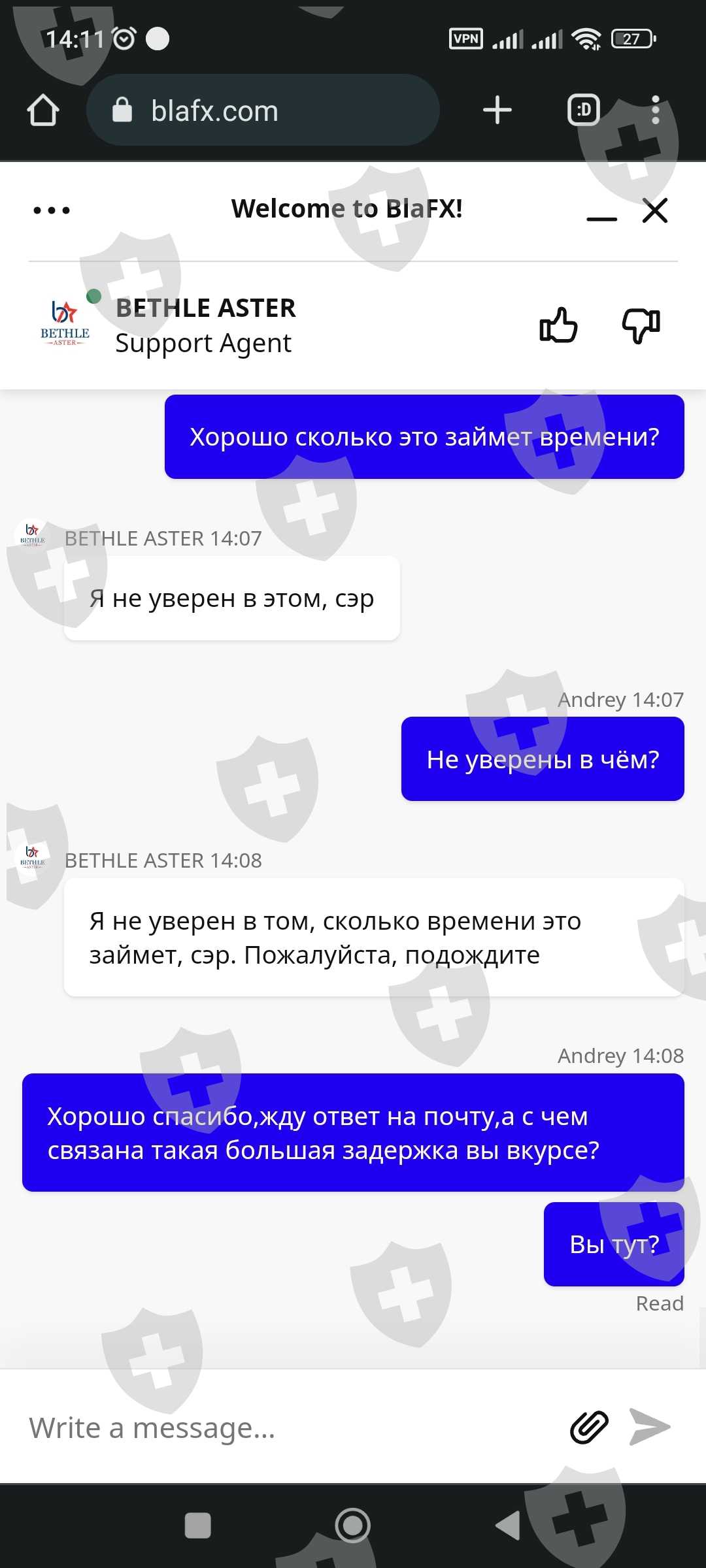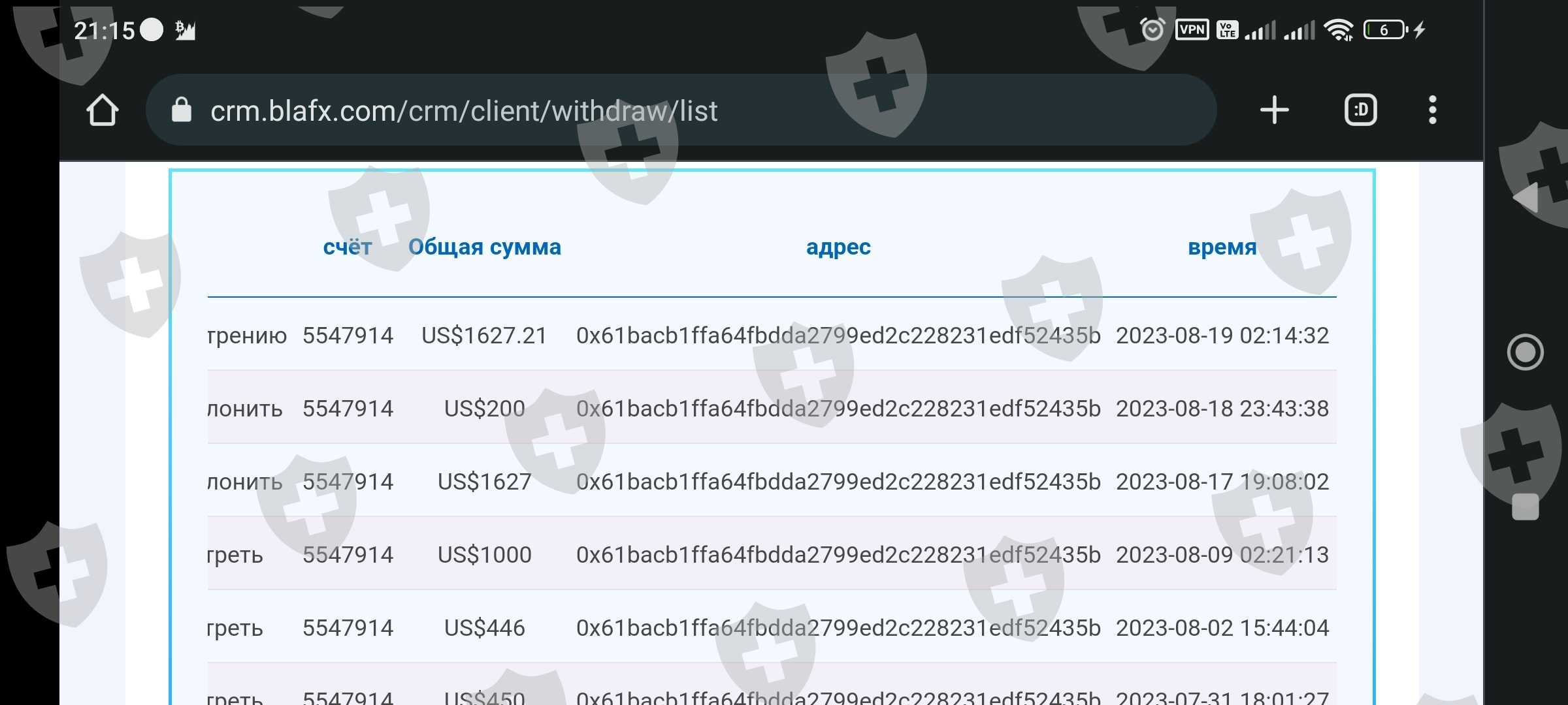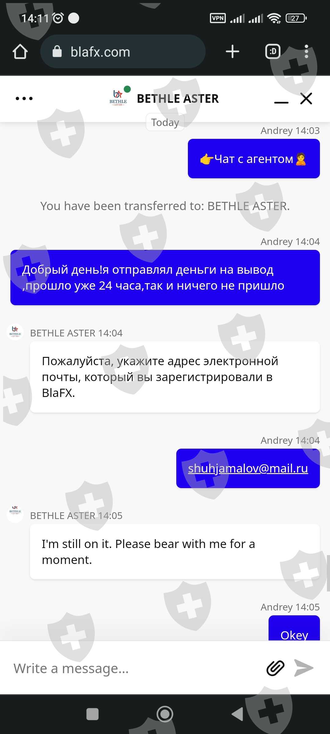 Добрый день! возникла проблема с выводом средст на платформе Blafx,которая длится уже более 24 часов,мне порекомендовали отменить транзакцию и заново запросить вывод средств,это также не было успешно,в поддержке пишут ожидайте 24 часа в течение этого времени деньги должны поступить на ваш счёт,по факту ничего не приходит,я пишу заново в поддержу они лишь попросили скинуть данные почты для проверки и в итоге они ответили лишь то что якобы много клиентов выводит средства поэтому возникла задержка хотя до этого все было в порядке и выводилось моментально номер транзакции: 3ivly6eelUUGblry7EjK .И такая проблема не только у меня но и у моих знакомых кто торгует на платформе, Спасибо вам заранее за помощь!