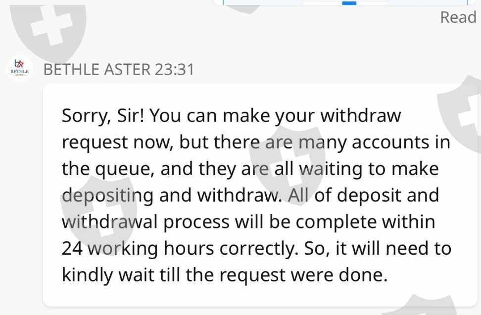 我于 2023 年 8 月 18 日 03:55 发起出金。 钱还没转进我账户。 我联系了支持团队,客服告诉我,我的资金将在 24 小时内到账。 已经超过 36 小时了,我的资金还没有到。 我再次联系客服,客服告诉我,我的资金要到8月25日才能出金! 我认为这是不合法的,有诈骗嫌疑! 我还想说的是,之前出金只需要10-30分钟!
