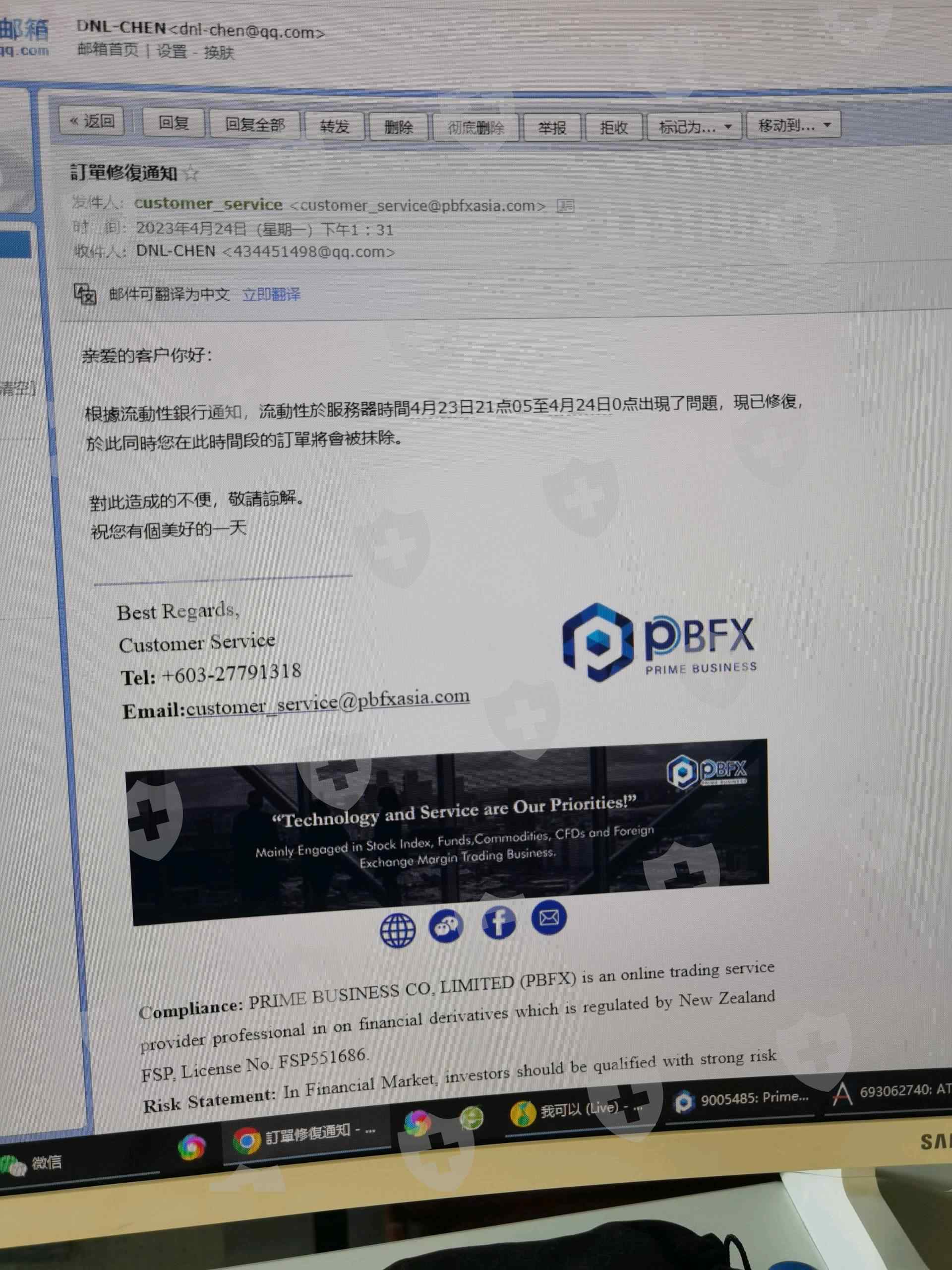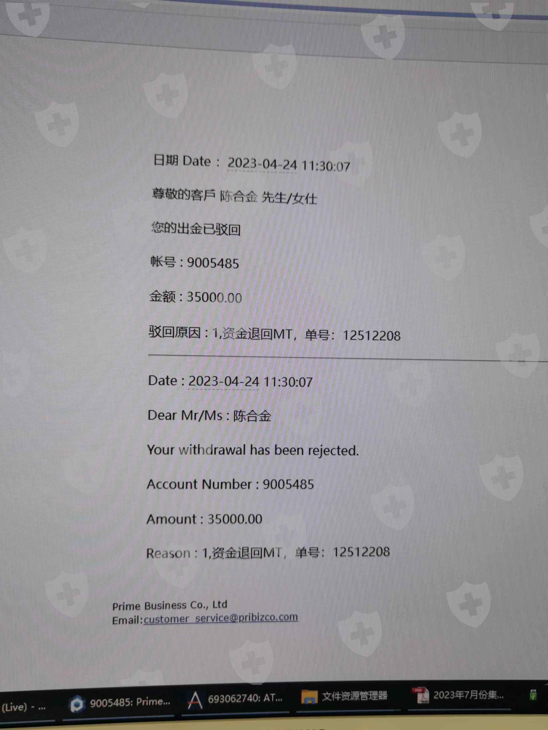 2023年4月24日早晨,我盈利37280美金,上午出金被pbfx平台驳回,且把数据从后台清除,代理公司说我交易频繁,pbfx邮件通知我银行流动性问题,但是不解释原因