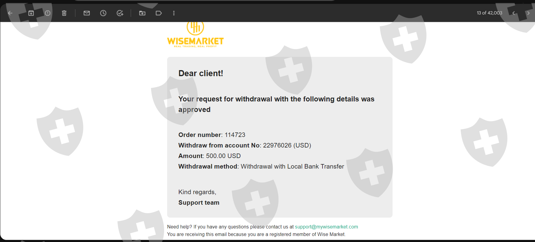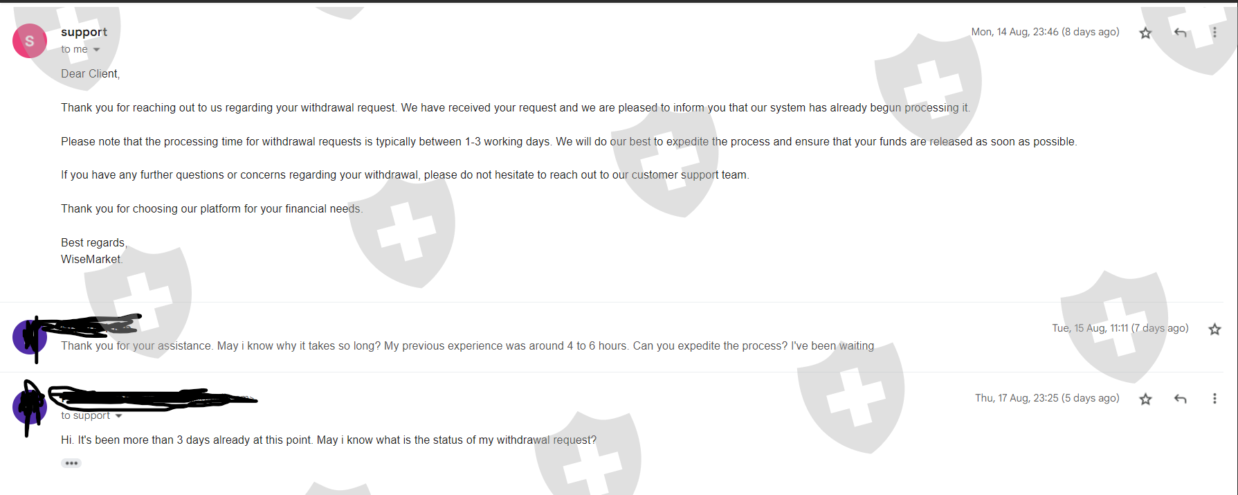 提款过程耗时太长,4天后才获得批准,资金汇至我的银行账户仍在等待中。我尝试给支持人员发送电子邮件,但仍然没有任何结果!