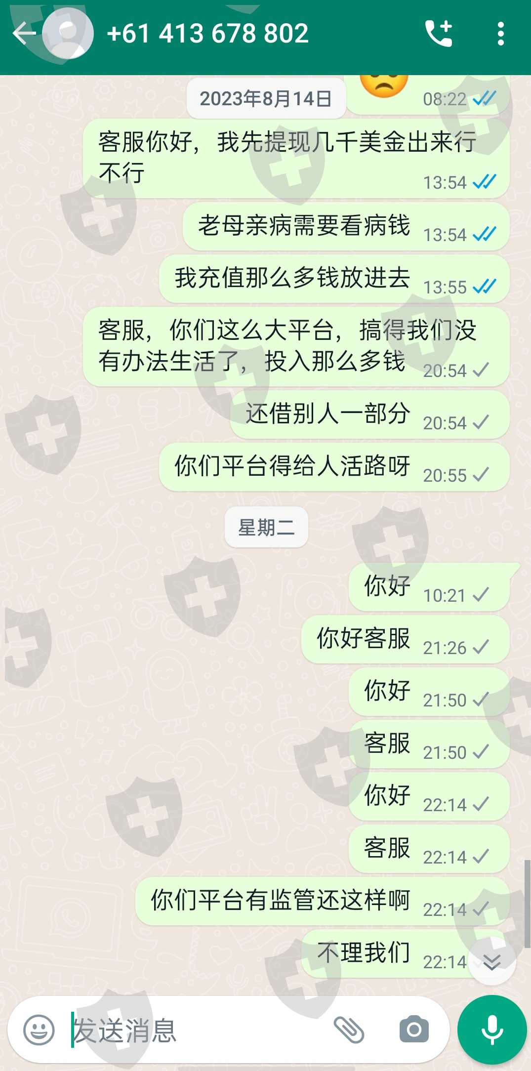 这个平台说澳大利亚监管,一个朋友拉我做说他赚了很多很多钱,刚开始我不理他不想做不相信,后来他主动借钱给我冲进去,我不想做一直拉我,我就冲一千美金进去,后来他又拉我说太少了,再存进去,这样赚快点,又一直拉我,我老公在工地累死累活的干存了一点车贷钱,我自己的私房钱一点用来看病钱,这会被骗子拉进去,倾家荡产了,他说可以提现,他都提现很多出来了,一直诱导我拉我,平台提现出来一百美金过,后来全部提现不让,后来我感觉不对劲了不想做了,要把本钱要回来,赚的钱不要了,平台刁难我要缴税五千多美金才能出金提现,我怕缴税完以后又出不来金,后来说没钱,客服不理我们了
