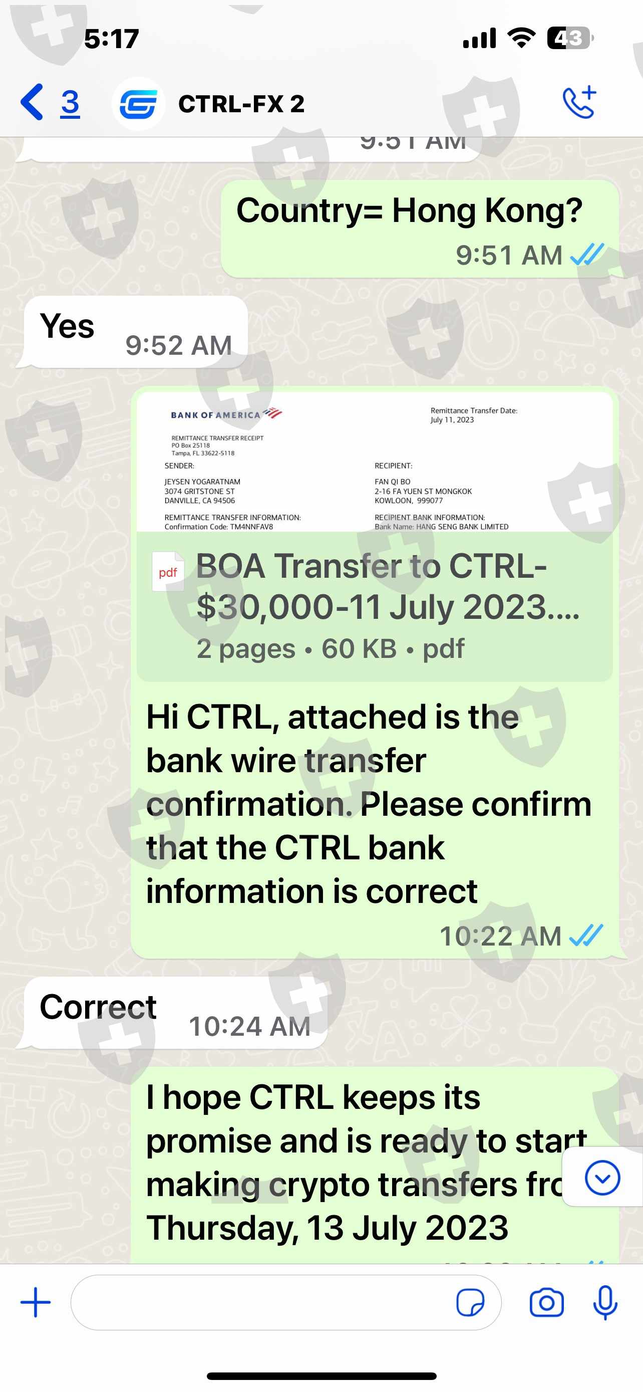 Between April and mid-May 2023, I would appear to have made significant gains while trading using the CTRL-FX platform. In May 2023, I requested to withdraw all my capital and gains from my CTRL-FX account. Following my request to withdraw all funds in my CTRL-FX account, CTRL-FX requested that I make numerous fees payments and tax payments amounting to approximately $484500. Without making these payments, CTRL-FX refused to send me my funds. I complied with the CTRL-FX request to make these payments as I was not aware then that CTRL-FX was a scam forex trading platform. The approximately $484,500 of additional fees and tax payments were made bank wire transfers as Coinbase and Kraken restricted or closed my accounts, respectively, without any reason being provided to me. The bank wire transfers to CTRL-FX were made to various bank accounts in Hong Kong that were in different names.