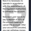 Деньги заморожены (на аккаунте 629$), любые действия с ними невозможны. Сообщают, что нужно внести 15% от депозита , чтобы была возможность вывести свои деньги. MT4 отключили.