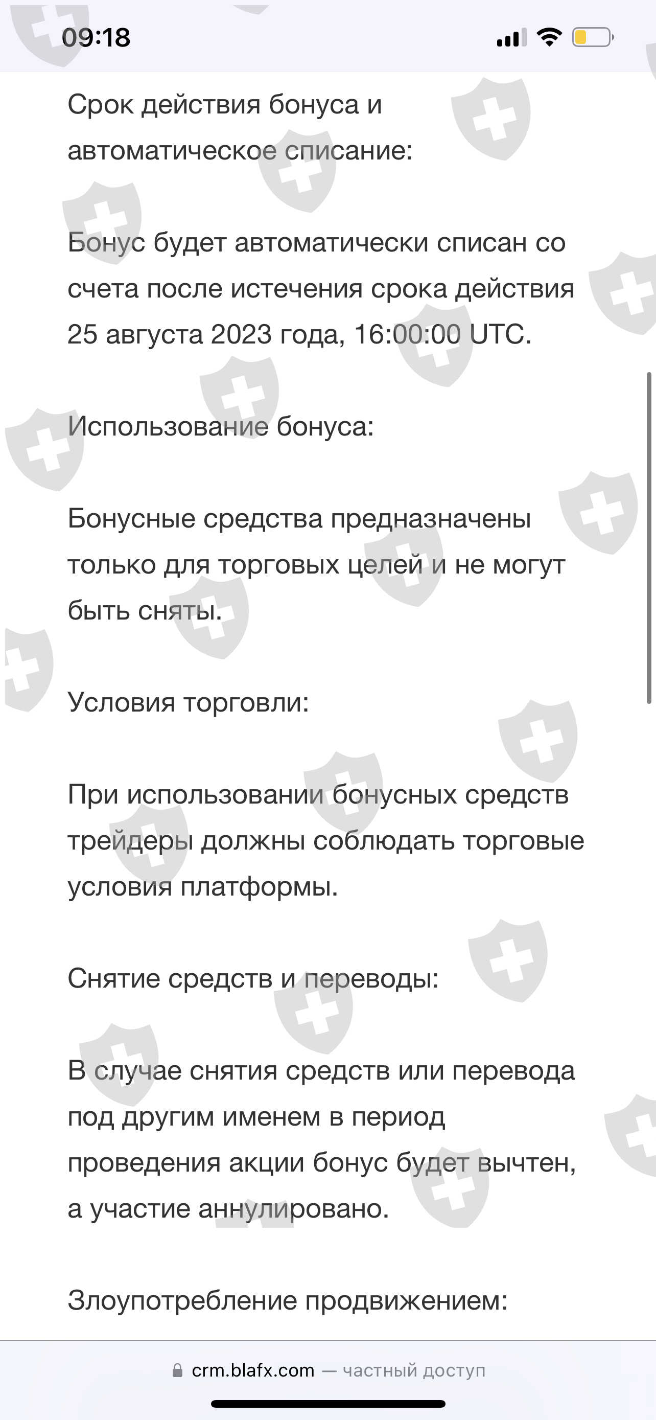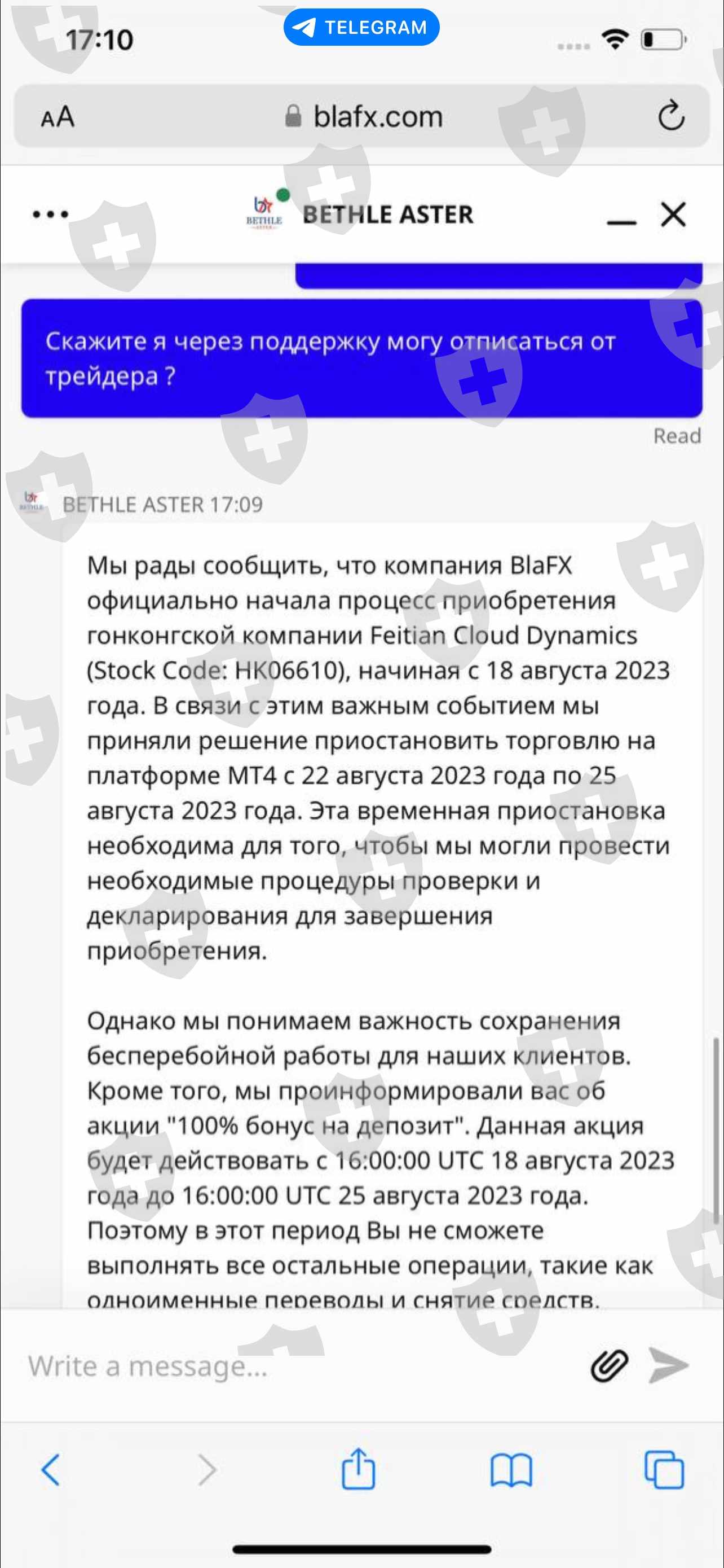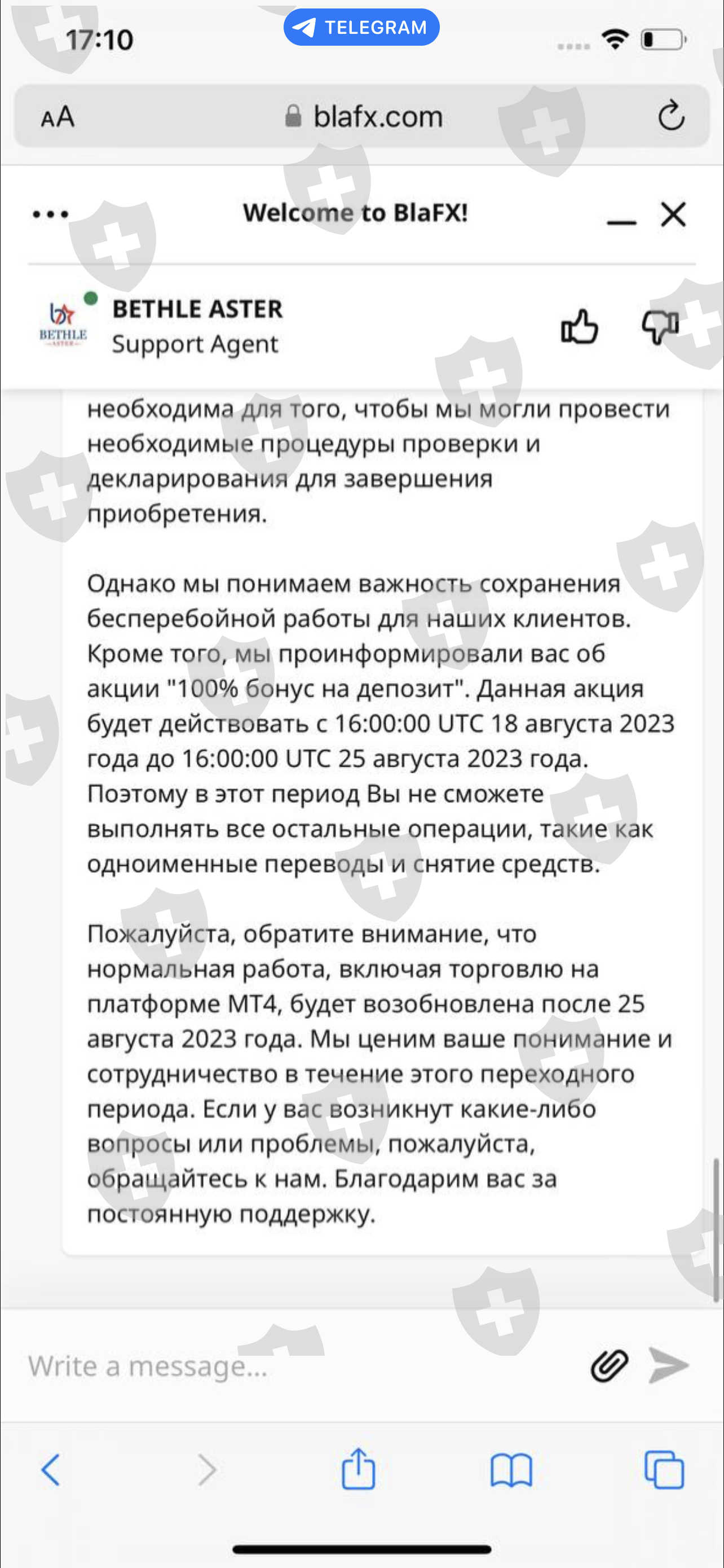 这一切都始于大约一周前。一开始是提现困难,需要等待1-2天左右,他们解释是因为服务器超载。此外,根本不可能退出,因为他们在8月18日采取了行动,当时不可能进行任何操纵。 23.08 他们禁止提取资金,直到我们存入账户金额的 10%。我请你帮忙