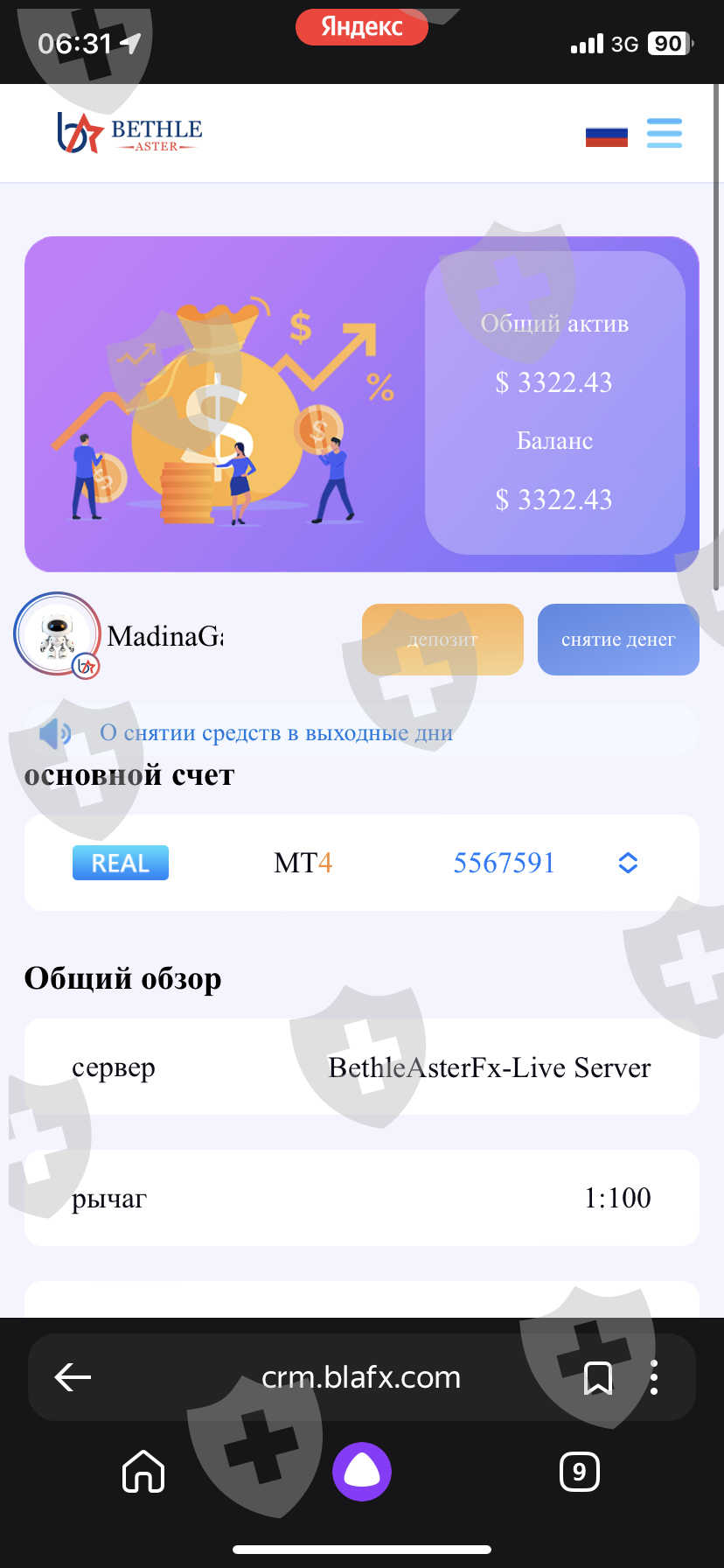 биржи BlaFX. Хочу сделать заявление о невозможном выводе денежных средств с моего торгового счета. В настоящее время на платформе запретили вывод денежных средств. О сложившейся ситуации мною не было получено ни одного уведомления. Служба технической поддержки держит обратную связь и требует немедленного пополнения 10% от депозита на мой аккаунт для разморозки торгового счета. Номер торгового счета: 5567591