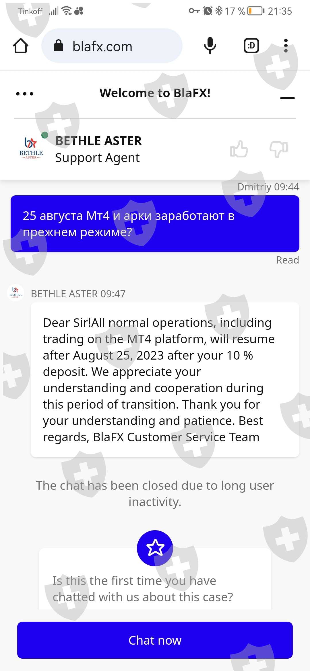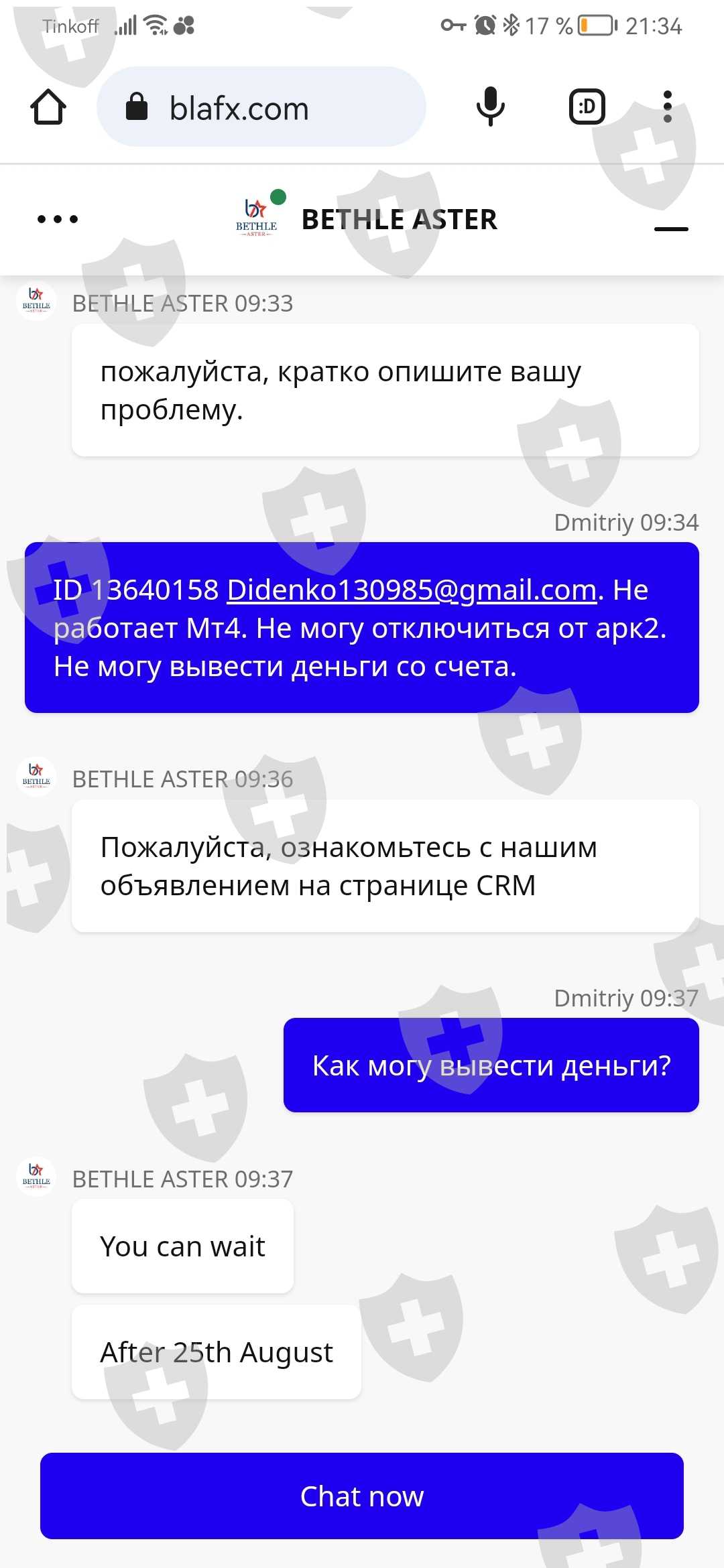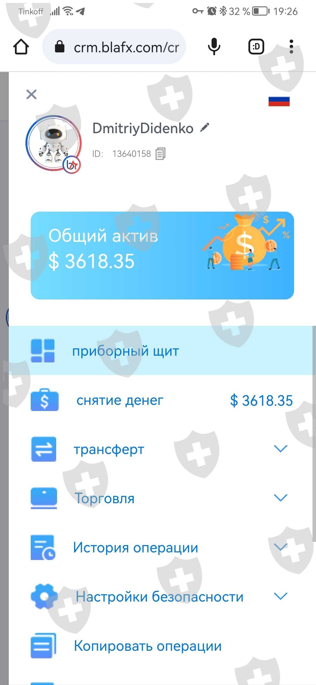 В blafx мой ID 13640158. Номер счета 5542867. Сумма на счёте 3618,35$. Счёт заморожен. Деньги не могу вывести. В тех службе говорят что счета все заморожены и требуют внести ещё деньги. Считаю их мошенниками. Прошу разобраться с компанией blafx и вернуть мне все деньги с моего счета.