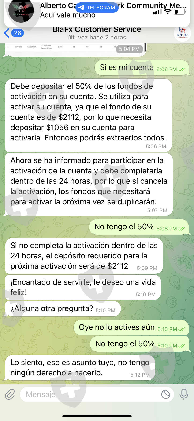他们要求您提供账户中资金的 50% 才能解冻账户并能够提款或进行交易,有时间限制,如果在规定时间内未满足要求,他们将高达 100% ,否则人们就会失去他们的投资账户。