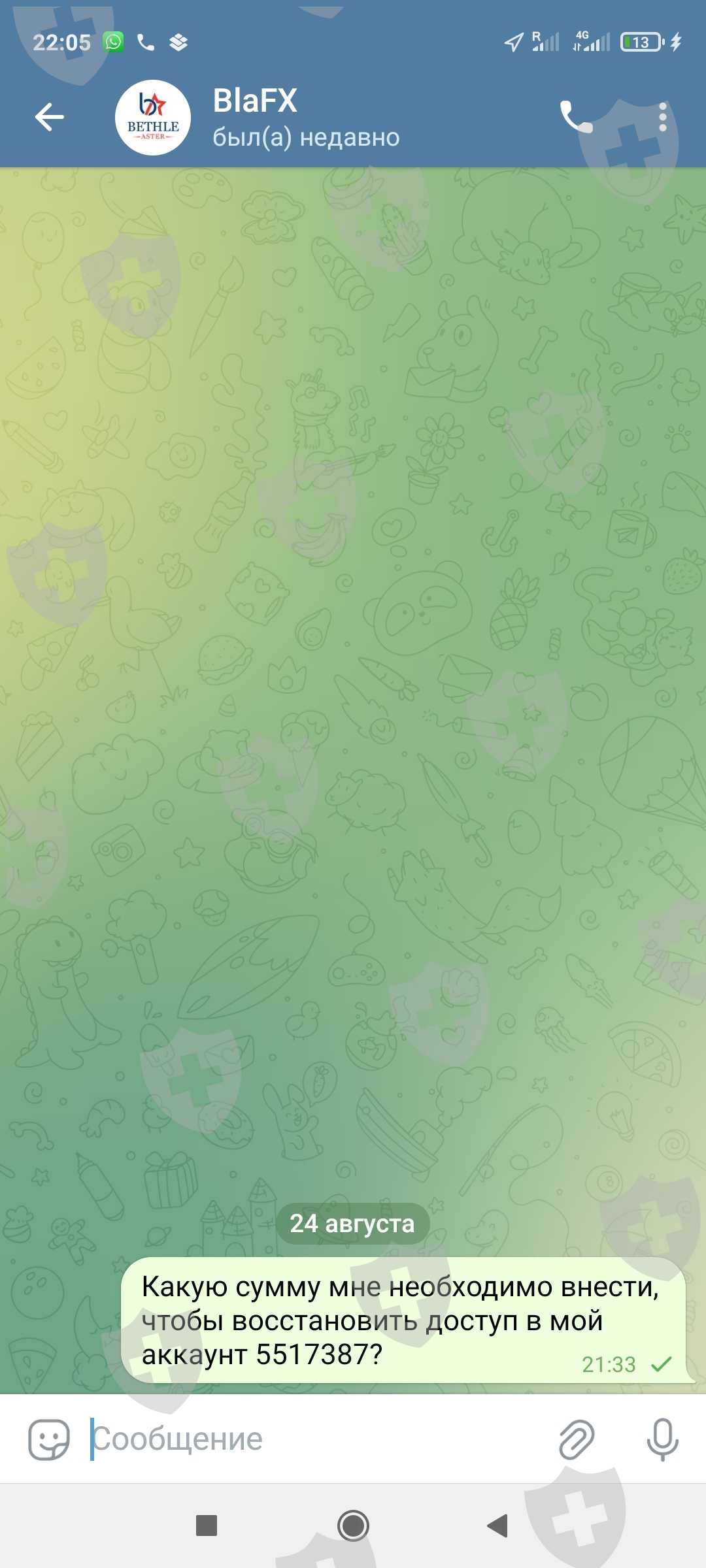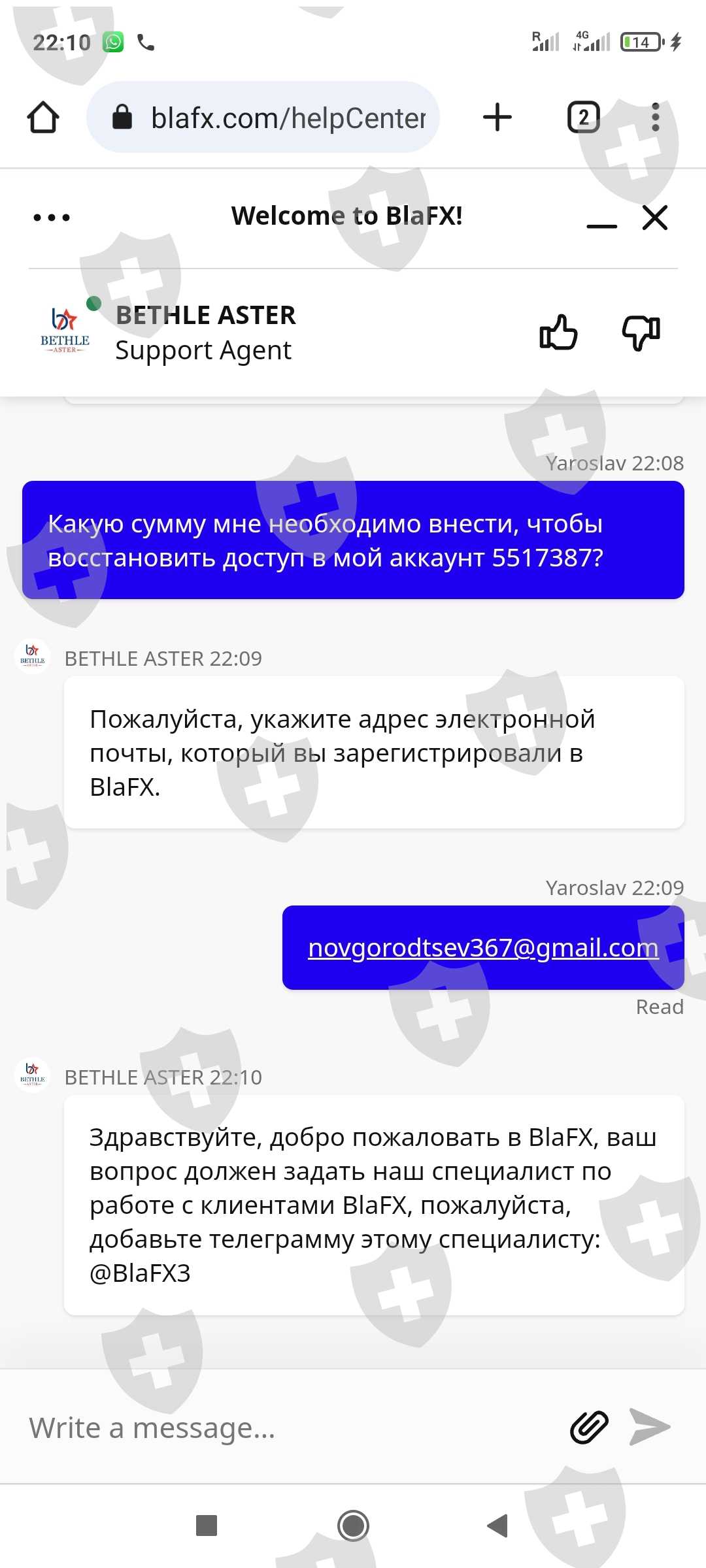 Я не могу вывести свои деньги с BlaFX! Система заблокировала возможность отписки от трейдера. А проблема заключается в том, что пока аккаунт подписан на трейдера, невозможно оформить вывод средств! BlaFX уже как неделю не выводит средства! В итоге я не могу вывести $31.952.5 co своего счёта 5517387! Более того BlaFX стал требовать оплаты 15% депозиты от текущего баланса за активацию уже действующего аккаунта в течение 1 дня! В случае невыполнения этого условия, мой аккаунт грозятся удалить! Также официальный аккаунт BlaFX в Telegram не отвечает на мои сообщения! Рассчитываю на ваше вмешательство и помощь!