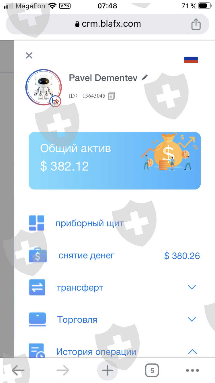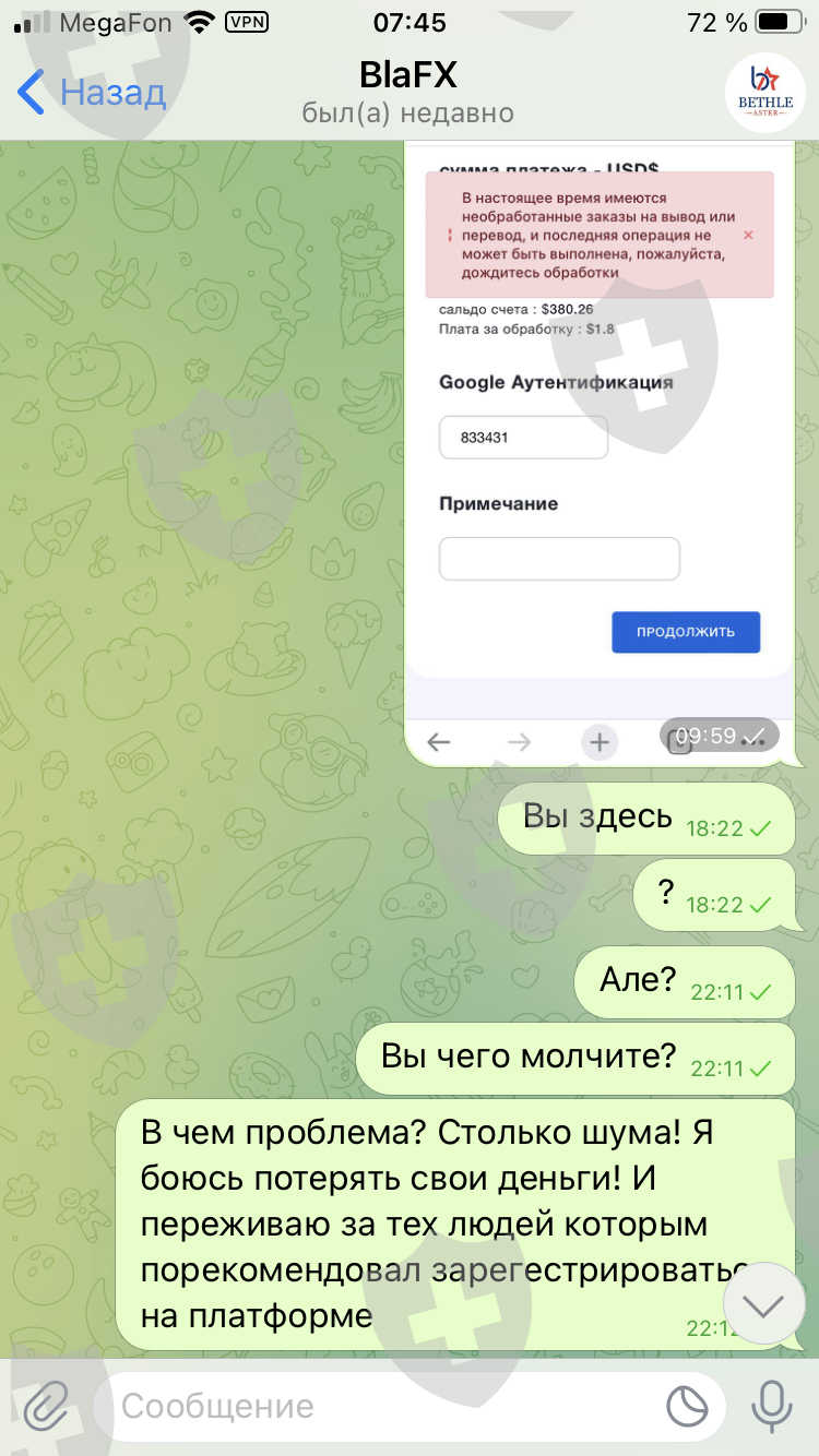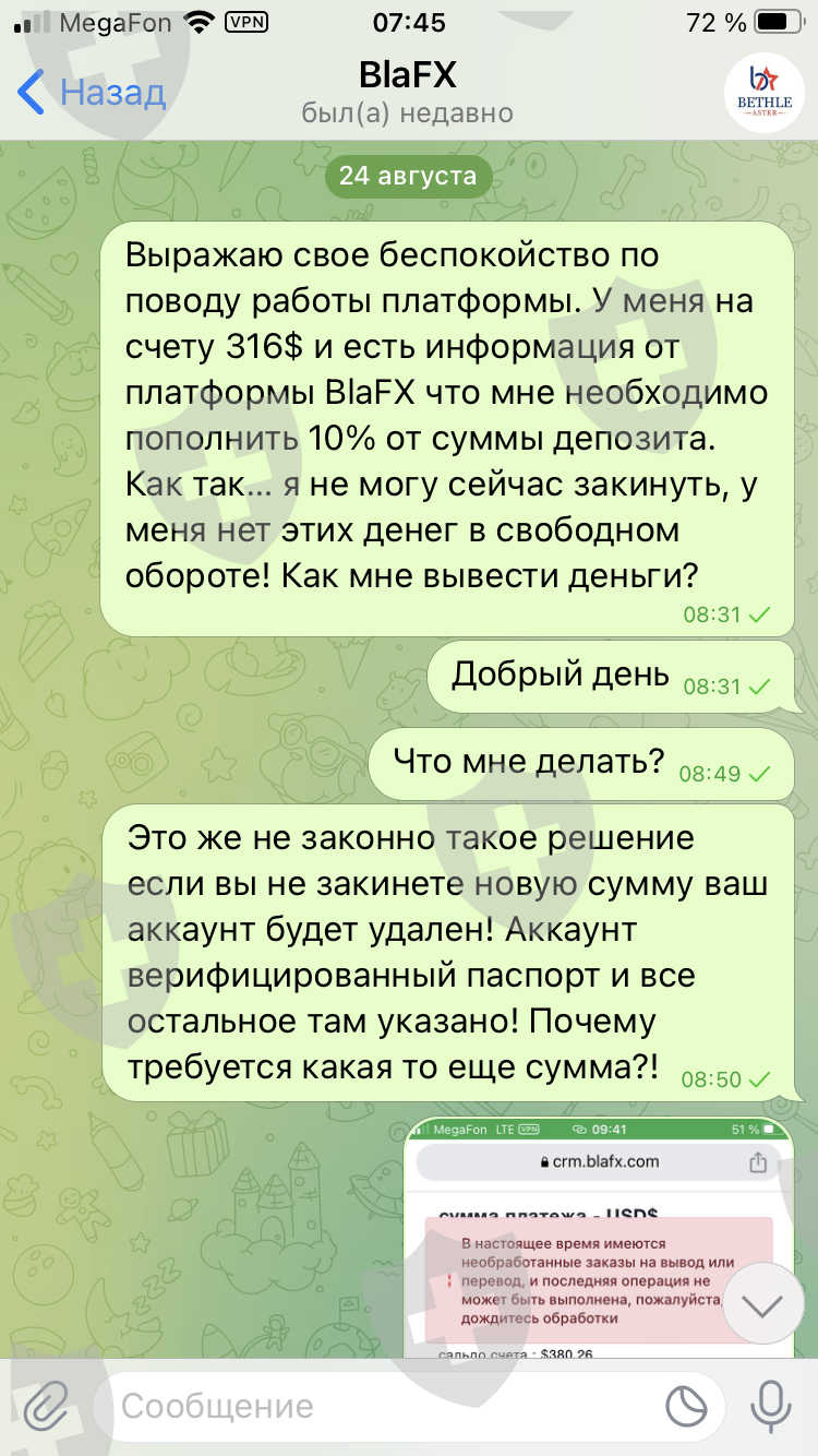 здравствуйте, меня зовут Дементьев Павел. Я являюсь инвестором платформы BlaFX. хочу сделать заявление о не возможном выведе моих денежных средств с с моего торгового счета. В настоящее время платформа заморозила все средства и любые операции по ним. служба поддержки ни чего не отвечает, и ни как не комментирует происходящее. другие инвесторы поделились информацией о том что необходимо пополнить 10% от суммы депозита и тогда счета разморозиться, и можно будет вывести деньги! Я внес 10% от депозита но ни чего не происходит! мои деньги на данный момент находиться на платформе. баланс моего счета 382.12$