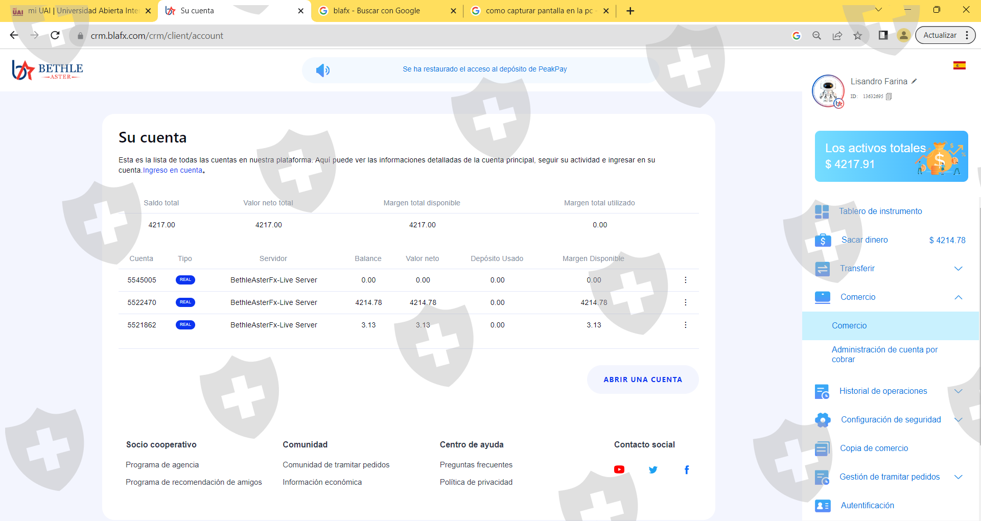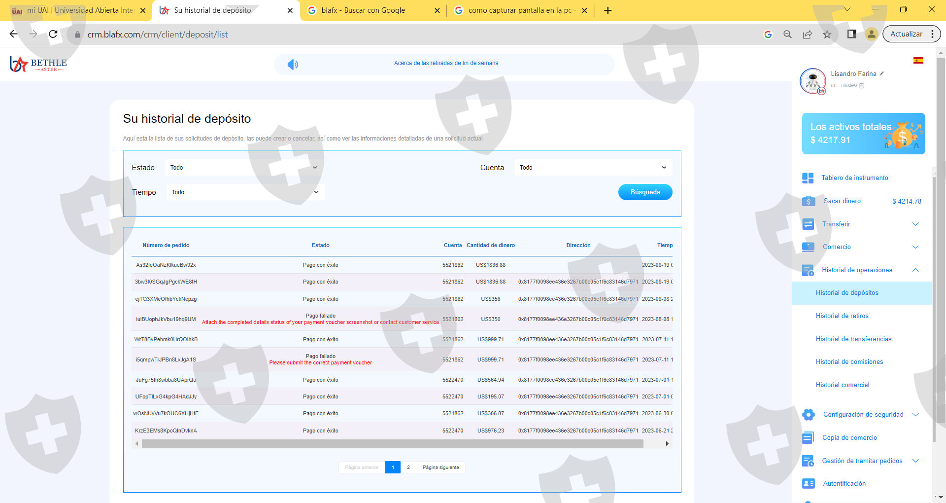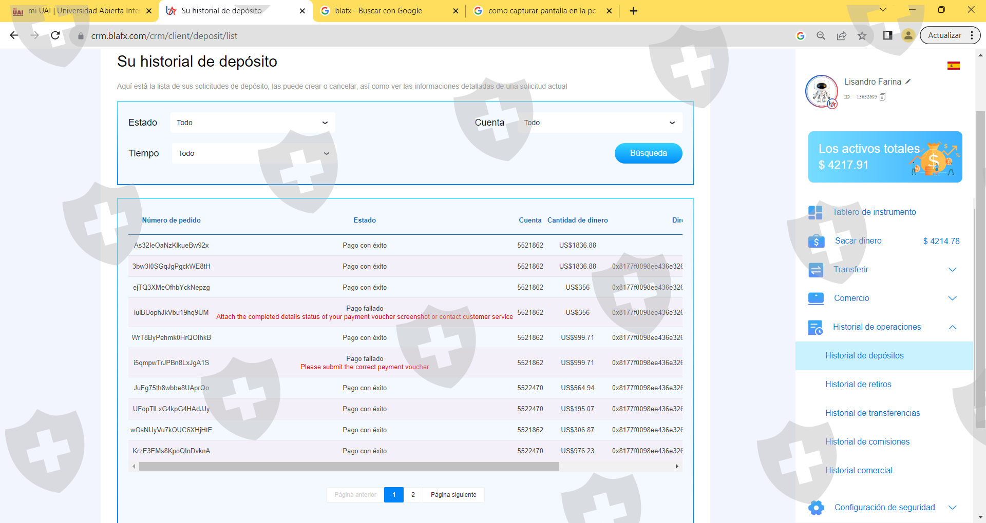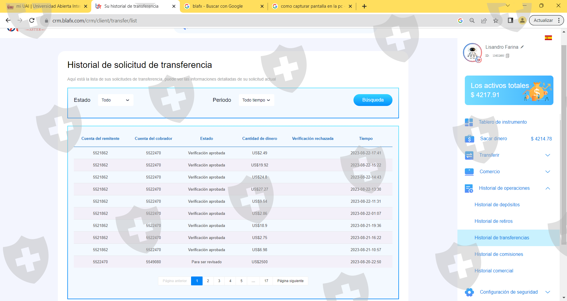 Estimados buenos dias, mi nombre es Lisandro Fariña dni 38839416, mail lisandrofarina12@gmail.com, mi id es 13632695, tengo en mi cuenta 2381 que quiero retirar a mi cuenta de binance, y me informan que la cuenta esta bloqueada que para desbloquearla habia tiempo hasta el 25/8 y deberia depositar el 27% de mi ingreso total, adjunto print de pantalla