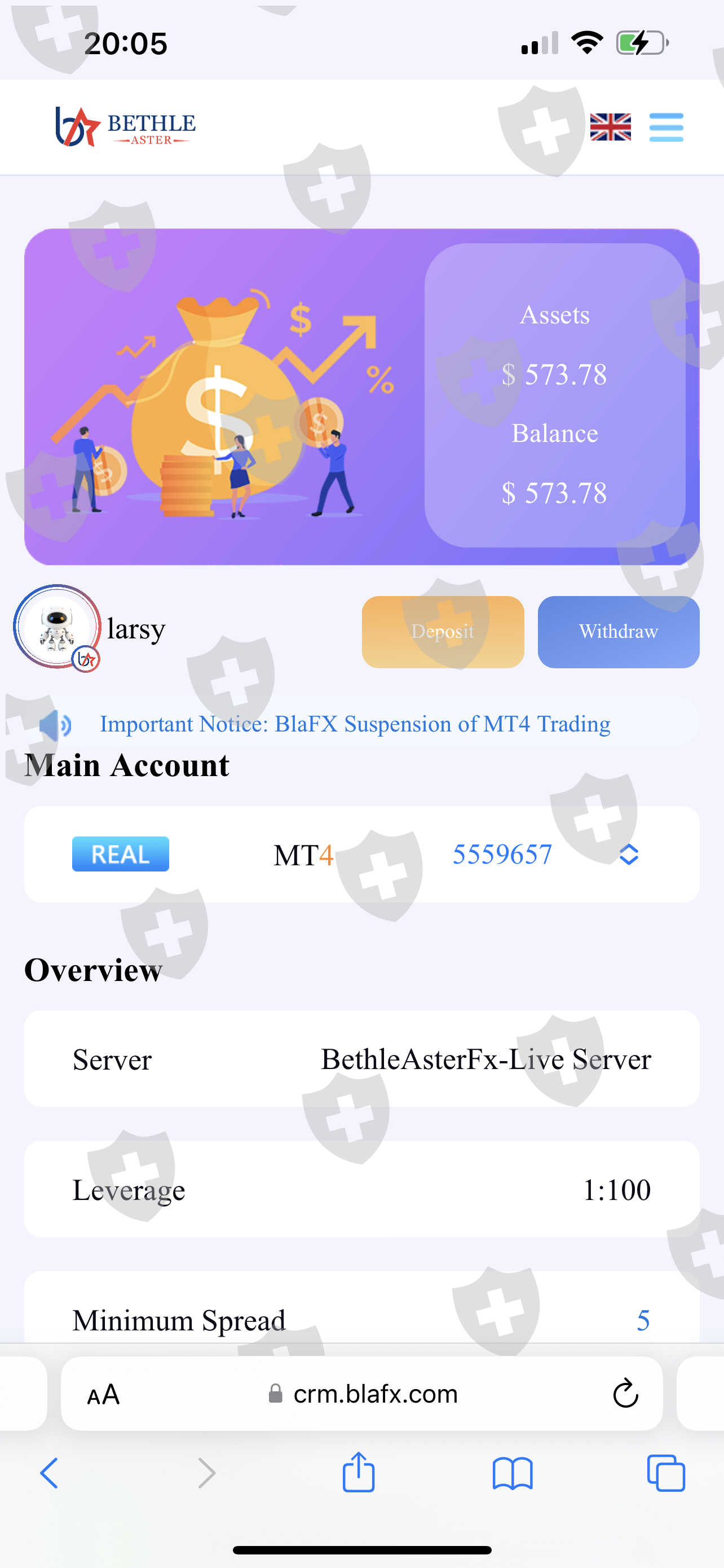 收购 bluff x 后,引入了新规则,用户只能通过写信支持才得知:用户需缴纳 27% 的资本利得税。缴纳资本利得税后,用户可以提取全部资金,以保障您的权益。并表示,提现将于25日起在平台进行:2023年8月22日至2023年8月25日,暂停MT4交易(仍可进行除MT4交易外的其他操作)。在此期间,我们将办理验资、申报等必要手续,确保转型重组顺利进行。但随着25日的到来,资金的提取并没有成为可能,仍然在虚张声势的公司没有办法将资金提取到自己的资源中。我附上一张余额和存款的照片。